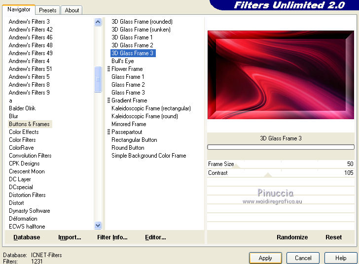 2. Effets>Modules Externes>Filters Unlimited 2.0 - Buttons &Frames - 3D Glass Frame 3.