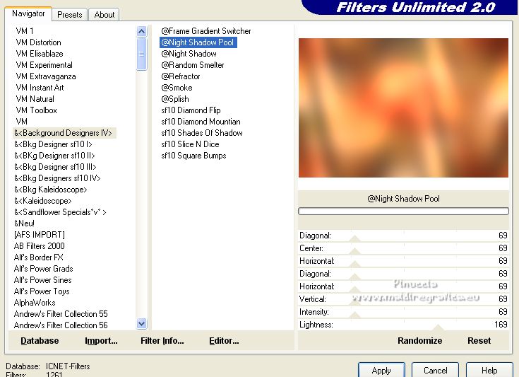 5. Effets>Modules Externes>Filters Unlimited 2.0 - &<Background Designers IV> - &64;Night Shadow Pool,