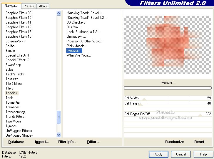 16. Effets>Modules Externes>Filters Unlimited 2.0 - Toadies - Weaver, par défaut.