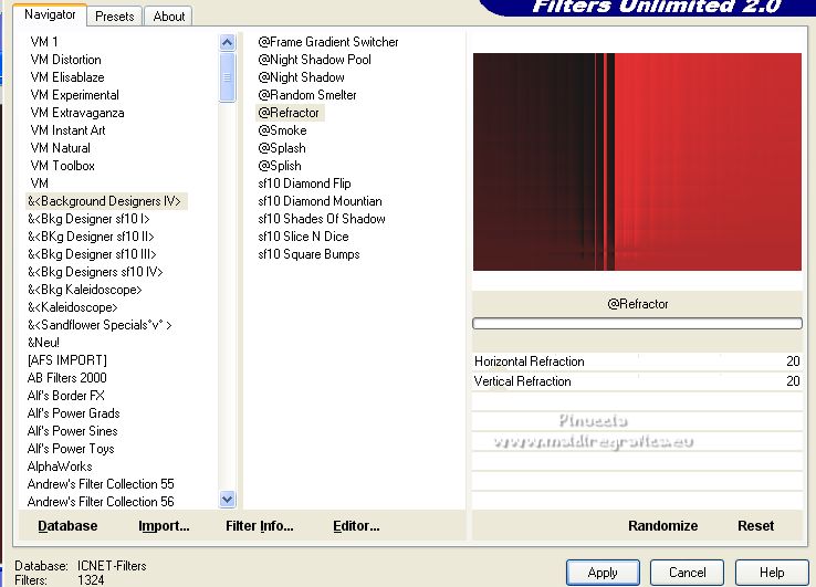 3. Effets>Modules Externes>Filters Unlimited 2.0 - &<Background DesignersIV> - @Refractor.