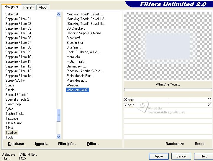 Effets>Modules Externes>Filters Unlimited 2.0 - Toadies - What are you, par défaut.