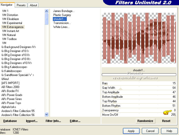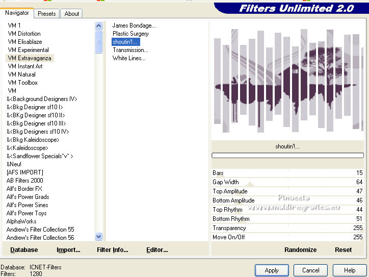 7. Effets>Modules Externes>Filters Unlimited 2.0 - VM Extravaganza - Shoutin', par défaut.