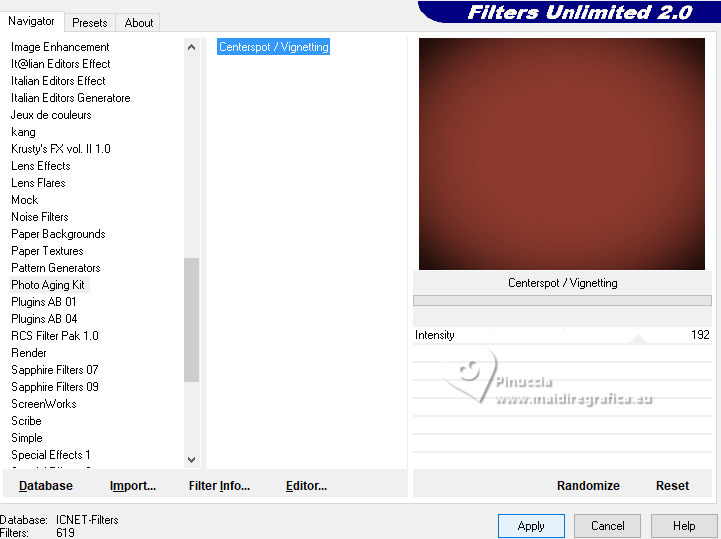 2. Effects>Plugins>Filters Unlimited 2.0 - Photo Agint Kit - Centerspot Vignetting, default settings.