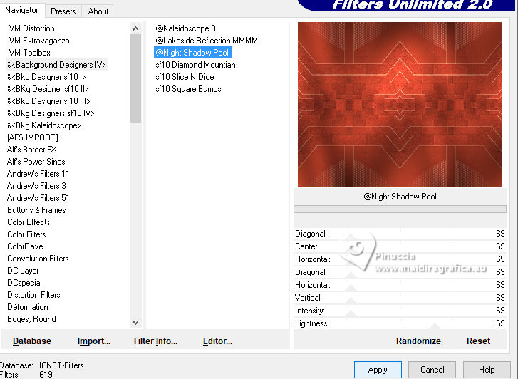 Effects>Plugins>Filters Unlimited 2.0 - &<Background Designers IV> - @Night Shadow Pool, default settings.