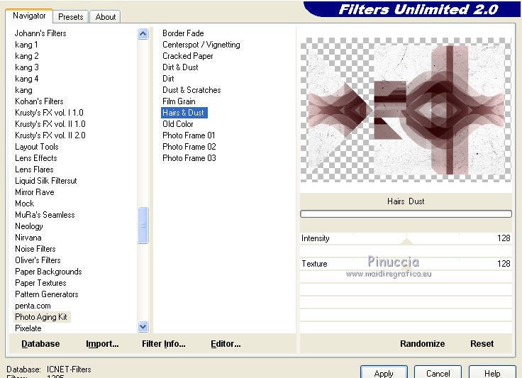 14. Effets>Modules Externes>Filters Unlimited 2.0 - Photo Aging Kit - Hairs & Dust.