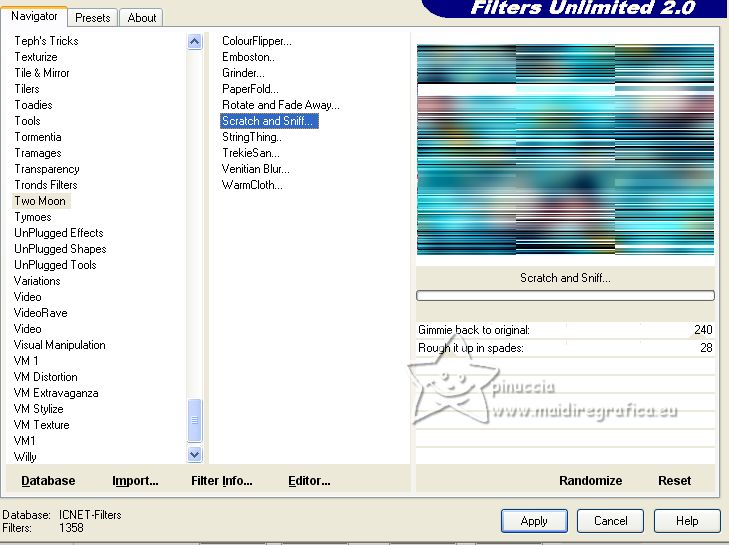 Effets>Modules Externes>Filters Unlimited 2.0 - Two Moon - Scratch and Sniff..., par défaut.