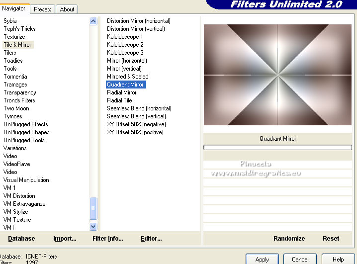 18. Effets>Modules Externes>Filters Unlimited 2.0 - Tile & Mirror - Quadrant Mirror.