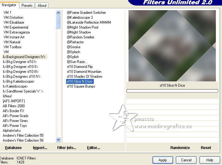 4. Effets>Modules Externes>Filters Unlimited 2.0 - &<Background DesignersIV> - sf10 Slice N Dice