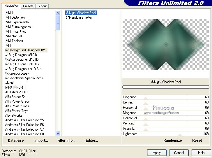 Effets>Modules Externes>Filters Unlimited 2.0 - &<Background Designers IV> @Night Shadow Pool, par défaut