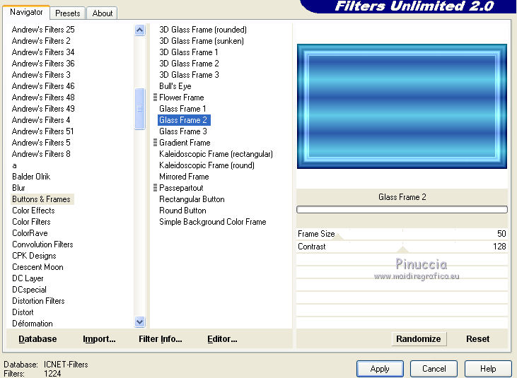 2. Effets>Modules Externes>Filters Unlimited 2.0 - Buttons & Frames - Glass Frame 2