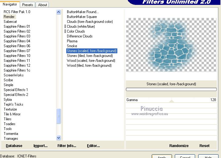 14. Effets>Modules Externes>Filters Unlimited 2.0 - Render - Stones (scaled,fore-/background)
