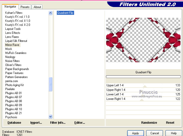 12. Effets>Modules Externes>Filters Unlimited 2.0 - Mirror Rave - Quadrant Flip