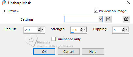 Adjust>Sharpness>Unsharp Mask.
