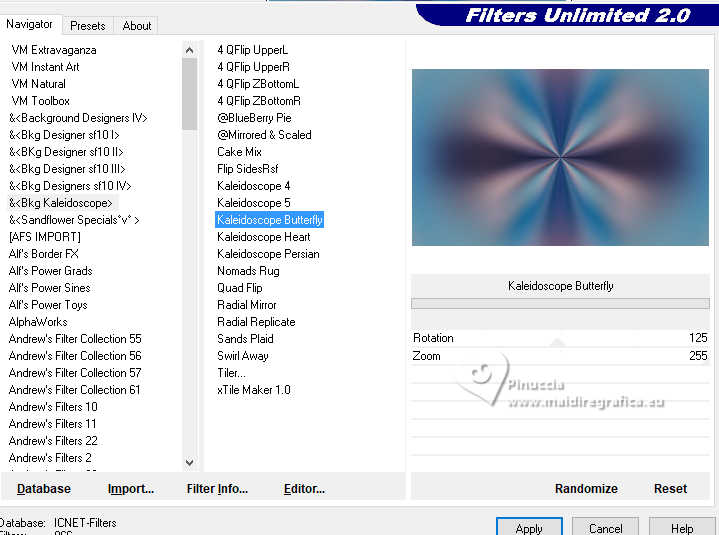 3. Effets>Modules Externes>Filters Unlimited 2.0 - &<Bkg Kaleidoscope> - Kaleidoscope Butterfly.
