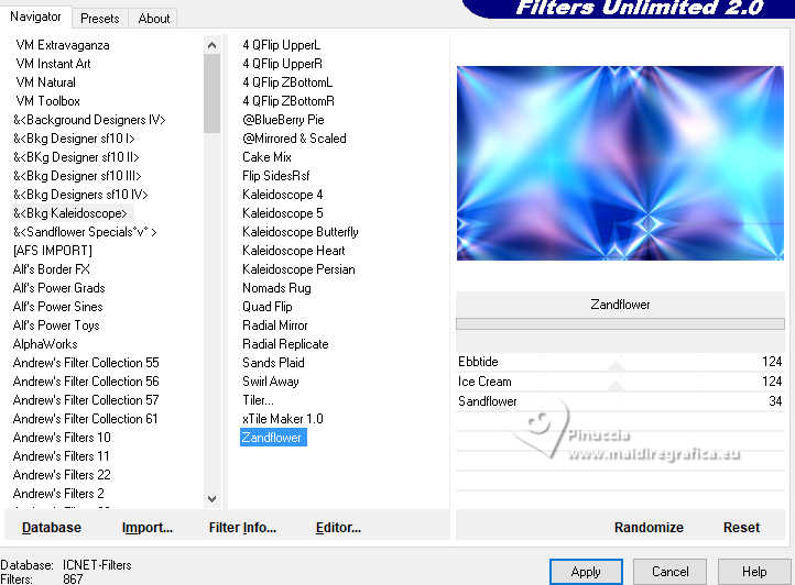 5. Effets>Modules Externes>Filters Unlimited 2.0 - &<Bkg Kaleidoscope> - Zandflower, par défaut.