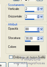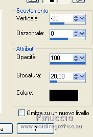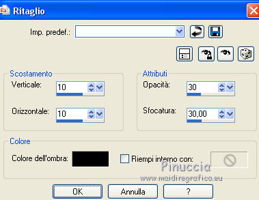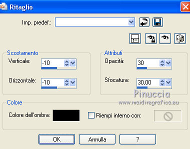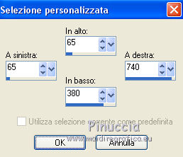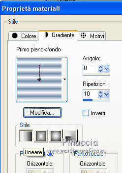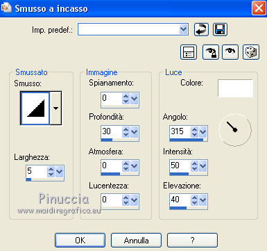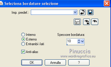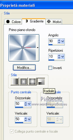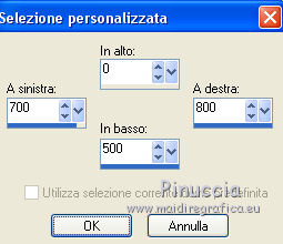 qui puoi trovare qualche risposta ai tuoi dubbi. Se l'argomento che ti interessa non è presente, ti prego di segnalarmelo. Questo tutorial è stato realizzato con PSPX8 e tradotto con PSPX3 e PSPX, ma può essere realizzato anche con le altre versioni di PSP. Dalla versione X4, il comando Immagine>Rifletti è stato sostituito con Immagine>Capovolgi in orizzontale, e il comando Immagine>Capovolgi con Immagine>Capovolgi in verticale. Nelle versioni X5 e X6, le funzioni sono state migliorate rendendo disponibile il menu Oggetti. Con la nuova versione X7, sono tornati Rifletti>Capovolgi, ma con nuove varianti. Vedi la scheda sull'argomento qui traduzione in inglese/english translation qui/here Le vostre versioniOccorrente: Materiale qui Per i tubes e la maschera grazie Colybrix, ValyScrapPassion e Narah (in questa pagina trovi i links ai siti dei creatori dei materiali utilizzati) Filtri: se hai problemi con i filtri, consulta la mia sezione filtri qui Filters Unlimited 2.0 qui Filter Factory Gallery F - Patch Work qui Mehdi - Fur qui Alien Skin Eye Candy 5 Texture - Swirl qui AAA Frames - Texture Frame qui I filtri Factory Gallery si possono usare da soli o importati in Filters Unlimited (come fare vedi qui) Se un filtro fornito appare con questa icona ![]() non esitare a cambiare modalità di miscelatura e opacità secondo i colori utilizzati. Nelle ultime versioni di PSP non c'è il gradiente di primo piano/sfondo (Corel_06_029) Puoi usare i gradienti delle versioni precedenti. Trovi qui i gradienti Corel X. Non dimenticare di cancellare le firme sui tubes (e di non salvare le modifiche quando li chiuderai). Apri la maschera in PSP e minimizzala con il resto del materiale. 1. Imposta il colore di primo piano con il colore bianco, e il colore di sfondo con il colore #728ba9. ![]() Passa il colore di primo piano a Gradiente di primo piano/sfondo, stile Radiale. ![]() Apri una nuova immagine trasparente 800 x 500 pixels, e riempila con il gradiente.Regola>Sfocatura>Sfocatura gaussiana - raggio 30 ![]() Effetti>Plugins>Filters Unlimited 2.0 - Filter Factory Gallery F - Patch Work. ![]() Effetti>Effetti di bordo>Aumenta di più. 2. Attiva lo strumento Selezione ![]() (non importa il tipo di selezione impostato, perchè con la selezione personalizzata si ottiene sempre un rettangolo) clicca sull'icona Selezione personalizzata ![]() e imposta i seguenti settaggi. ![]() Selezione>Innalza selezione a livello. Effetti>Plugins>Mehdi - Fur. ![]() Apri il tube paysghiver23-Coly e vai a Modifica>Copia. Torna al tuo lavoro e vai a Modifica>Incolla nella selezione. Regola>Messa a fuoco>Metti a fuoco. Mantieni selezionato. 3. Livelli>Nuovo livello raster. Effetti>Effetti 3D>Ritaglio. ![]() Livelli>Nuovo livello raster. Ripeti Effetti>Effetti 3D>Ritaglio, verticale e orizzontale -10 ![]() Mantieni ancora selezionato. 4. Livelli>Unisci>Unisci giù - 2 volte. Selezione>Modifica>Seleziona bordature selezione. ![]() Riempi la selezione con il colore di sfondo.Effetti>Effetti 3D>Smusso a incasso. ![]() 5. Selezione>Seleziona tutto. Selezione>Mobile. Selezione>Immobilizza. Selezione>Modifica>Contrai - 10 pixels. Livelli>Nuovo livello raster. Passa il colore di primo piano a Colore. Riempi la selezione con il colore bianco.Livelli>Nuovo livello maschera>Da immagine. Apri il menu sotto la finestra di origine e vedrai la lista dei files aperti. Seleziona la maschera NarahsMasks_1615 ![]() Immagine>Ridimensiona, al 70%, tutti i livelli non selezionato. Effetti>Effetti di bordo>Aumenta di più. Livelli>Unisci>Unisci gruppo. Selezione>Deseleziona. 6. Attiva lo strumento Puntatore ![]() mantieni Posizione X: 120,00 e imposta Posizione Y: 63,00 ![]() Effetti>Effetti 3D>Sfalsa ombra, colore nero. ![]() Livelli>Unisci>Unisci giù. Effetti>Effetti 3D>Sfalsa ombra, colore nero. ![]() 7. Attiva il livello inferiore. Livelli>Duplica. Effetti>Plugins>Mura's Meister - Perspective Tiling. ![]() Regola>Messa a fuoco>Messa a fuoco passaggio alto. ![]() Livelli>Unisci>Unisci giù. 8. Rimani posizionato sul livello inferiore, Raster 1. Selezione personalizzata ![]() ![]() Selezione>Innalza selezione a livello. Livelli>Disponi>Porta in alto. Mantieni selezionato. 9. Effetti>Plugins>Alien Skin Eye Candy 5 Textures - Swirl. ![]() ricorda che quando un settaggio è Random, significa che il risultato è casuale e per questo mai uguale a un altro Selezione>Deseleziona. Effetti>Effetti di bordo>Aumenta. Effetti>Effetti 3D>Smusso a incasso, con i settaggi precedenti, ma Smusso n. 1. ![]() Regola l'intensità secondo i tuoi colori. Effetti>Effetti 3D>Sfalsa ombra, colore nero. ![]() 10. Livelli>Duplica. Immagine>Rifletti. Livelli>Unisci>Unisci giù. 11. Copia e incolla come nuovo livello i tubes della donna e del lupo. Immagine>Ridimensiona, in base al tube, tutti i livelli non selezionato, e posizionali a tuo piacimentoApplica ai tubes un Effetto Sfalsa ombra a tua scelta. Se usi il tube del lupo bianco di Valy, sposta il livello sotto quello dei rettangoli ![]() 12. Immagine>Aggiungi bordatura, 2 pixels, simmetriche, colore di sfondo. Selezione>Seleziona tutto. Immagine>Aggiungi bordatura, 46 pixels, simmetriche, colore bianco. Selezione>Inverti. Cambia i settaggi del gradiente, stile Lineare. ![]() Riempi la selezione con il gradiente.Regola>Sfocatura>Sfocatura gaussiana - raggio 20 ![]() Effetti>Plugins>AAA Frames - Texture Frame. ![]() Selezione>Deseleziona. 13. Apri il tube statuette-deco 15-coly e vai a Modifica>Copia. Torna al tuo lavoro e vai a Modifica>Incolla come nuovo livello. Immagine>Ridimensiona, al 50%, tutti i livelli non selezionato. Attiva lo strumento Puntatore ![]() e imposta Posizione X: 717,00 e Posizione Y: 367,00 ![]() Effetti>Effetti 3D>Sfalsa ombra, colore nero. ![]() 14. Apri il tube del testo e vai a Modifica>Copia. Torna al tuo lavoro e vai a Modifica>Incolla come nuovo livello. Spostalo in alto, come nel mio esempio.Immagine>Aggiungi bordatura, 2 pixels, simmetriche, colore di sfondo. Firma il tuo lavoro e sa