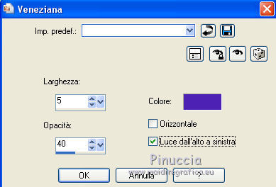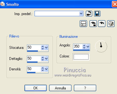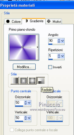 qui puoi trovare qualche risposta ai tuoi dubbi. Se l'argomento che ti interessa non è presente, ti prego di segnalarmelo. Questo tutorial è stato realizzato con PSPX8 e tradotto con PSPX3 e PSPX, ma può essere realizzato anche con le altre versioni di PSP. Dalla versione X4, il comando Immagine>Rifletti è stato sostituito con Immagine>Capovolgi in orizzontale, e il comando Immagine>Capovolgi con Immagine>Capovolgi in verticale. Nelle versioni X5 e X6, le funzioni sono state migliorate rendendo disponibile il menu Oggetti. Con la nuova versione X7, sono tornati Rifletti>Capovolgi, ma con nuove varianti. Vedi la scheda sull'argomento qui traduzione in inglese/english translation qui/here Le vostre versioniOccorrente: Materiale qui Per i tubes grazie Colybrix, ValyScrapPassion e Nikita. (in questa pagina trovi i links ai siti dei creatori di tubes) Filtri: se hai problemi con i filtri, consulta la mia sezione filtri qui Alien Skin Eye Candy 5 Impact - Glass qui AAA Frames - Foto Frame qui Carolaine and Sensibility - CS-Texture qui ![]() non esitare a cambiare modalità di miscelatura e opacità secondo i colori utilizzati. Nelle ultime versioni di PSP non c'è il gradiente di primo piano/sfondo (Corel_06_029) Puoi usare i gradienti delle versioni precedenti. Trovi qui i gradienti Corel X. Non dimenticare di cancellare le firme sui tubes. Imposta il colore di primo piano con #ffffff, e il colore di sfondo con #4d22b3. ![]() Passa il colore di primo piano a Gradiente di primo piano/sfondo, stile Radiale. ![]() 1. Apri una nuova immagine trasparente 800 x 500 pixels, e riempila con il gradiente.Effetti>Effetti artistici>Smalto. ![]() Modifica>Ripeti Smalto. 2. Apri il tube divers30VSP e vai a Modifica>Copia. Torna al tuo lavoro e vai a Modifica>Incolla come nuovo livello. Oggetti>Allinea>Superiore, o attiva lo strumento Puntatore ![]() e imposta Posizione Y a 0,00. ![]() 3. Attiva lo strumento Bacchetta magica ![]() ![]() Clicca al centro dei piccoli quadri per selezionarli. Attiva il livello inferiore. Effetti>Plugins>Alien Skin Eye Candy 5 Impact - Glass. Seleziona il preset Clear e ok. ![]() Selezione>Deseleziona. 4. Attiva il livello superiore. Attiva lo strumento Bacchetta magica ![]() ![]() Clicca sulle cornici bianche per selezionarle. ![]() Effetti>Effetti di trama>Veneziana - colore di sfondo. ![]() Selezione>Deseleziona. Effetti>Effetti 3D>Sfalsa ombra, colore nero. ![]() 5. Livelli>Nuovo livello raster. Attiva lo strumento Selezione ![]() (non importa il tipo di selezione impostato, perchè con la selezione personalizzata si ottiene sempre un rettangolo) clicca sull'icona Selezione personalizzata ![]() e imposta i seguenti settaggi. ![]() Apri il tube sable plage e vai a Modifica>Copia. Torna al tuo lavoro e vai a Modifica>Incolla nella selezione. Effetti>Effetti di bordo>Aumenta. Selezione>Deseleziona. 6. Apri il tube del paesaggio e vai a Modifica>Copia. Torna al tuo lavoro e vai a Modifica>Incolla come nuovo livello. Immagine>Ridimensiona, al 75%, tutti i livelli non selezionato. Oggetti>Allinea>Sinistra, o attiva lo strumento Puntatore ![]() e imposta Posizione X a 0,00. ![]() Livelli>Duplica. Immagine>Rifletti. Livelli>Unisci>Unisci giù. 7. Apri il tube della donna e vai a Modifica>Copia. Torna al tuo lavoro e vai a Modifica>Incolla come nuovo livello. Immagine>Ridimensiona, al 50%, tutti i livelli non selezionato. Tasto K sulla tastiera per attivare lo strumento Puntatore ![]() e imposta Posizione X: 20,00 e Posizione Y: 310,00. ![]() Effetti>Effetti 3D>Sfalsa ombra, colore nero. ![]() 8. Apri il tube del cane e vai a Modifica>Copia. Torna al tuo lavoro e vai a Modifica>Incolla come nuovo livello. Immagine>Ridimensiona, al 30%, tutti i livelli non selezionato. Regola>Messa a fuoco>Metti a fuoco. Strumento Puntatore ![]() e imposta Posizione X: 595,00 e Posizione Y: 325,00. ![]() Effetti>Effetti 3D>Sfalsa ombra, colore nero. ![]() 9. Apri il tube titre e vai a Modifica>Copia. Torna al tuo lavoro e vai a Modifica>Incolla come nuovo livello. Strumento Puntatore ![]() e imposta Posizione X: 274,00 e Posizione Y: 58,00. ![]() 10. Immagine>Aggiungi bordatura, 2 pixels, simmetriche, colore di sfondo. Modifica>Copia. Selezione>Seleziona tutto. 11. Immagine>Aggiungi bordatura, 46 pixels, simmetriche, colore bianco. Selezione>Inverti. Modifica>Incolla nella selezione. Regola>Sfocatura>Sfocatura gaussiana - raggio 30. ![]() Effetti>Plugins>AAA Frames - Foto Frame. ![]() 12. Effetti>Plugins>Carolaine and Sensibility - CS_Texture. ![]() Selezione>Deseleziona. Immagine>Aggiungi bordatura, 2 pixels, simmetriche, colore di sfondo. 13. Apri il tube divers20VSP e vai a Modifica>Copia. Torna al tuo lavoro e vai a Modifica>Incolla come nuovo livello. Strumento Puntatore ![]() e imposta Posizione X: 178,00 e Posizione Y: 16,00. ![]() Colorizza, se necessario. Livelli>Duplica. Livelli>Unisci>Unisci giù. Livelli>Duplica. Immagine>Capovolgi. 15. Firma il tuo lavoro e salva in formato jpg. Versione con tubes di Mina e Alejandra Rosales ![]() Le vostre versioni Grazie![]() Puoi scrivermi se hai problemi o dubbi, o trovi un link che non funziona, o soltanto per un saluto. 26 Maggio 2020 |