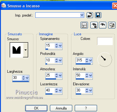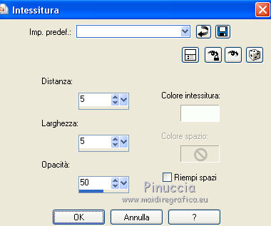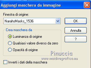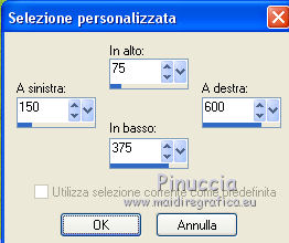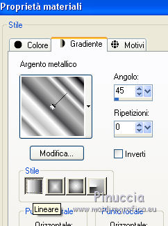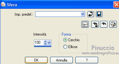 qui puoi trovare qualche risposta ai tuoi dubbi. Se l'argomento che ti interessa non è presente, ti prego di segnalarmelo. Questo tutorial è stato realizzato con PSPX8 e tradotto con PSPX3 e PSPX, ma può essere realizzato anche con le altre versioni di PSP. Dalla versione X4, il comando Immagine>Rifletti è stato sostituito con Immagine>Capovolgi in orizzontale, e il comando Immagine>Capovolgi con Immagine>Capovolgi in verticale. Nelle versioni X5 e X6, le funzioni sono state migliorate rendendo disponibile il menu Oggetti. Con la nuova versione X7, sono tornati Rifletti>Capovolgi, ma con nuove varianti. Vedi la scheda sull'argomento qui traduzione in inglese/english translation qui/here Le vostre versioni quiOccorrente: Materiale qui Per il tube e la maschera grazie Renée e Narah. (in questa pagina trovi i links ai siti dei creatori dei materiali utilizzati) Filtri: se hai problemi con i filtri, consulta la mia sezione filtri qui Filters Unlimited 2.0 qui DSB Flux - Bubbles, Radial Transmission qui Simple - Top Left Mirror qui Mehdi - Sorting Tiles qui Graphics Plus - Quick Tile II qui Mura's Meister - Perspective Tiling qui Carolaine and Sensibility - CS-DLines qui I filtri Simple e Graphics Plus si possono usare da soli o importati in Filters Unlimited (come fare vedi qui) Se un filtro fornito appare con questa icona ![]() non esitare a cambiare modalità di miscelatura e opacità secondo i colori utilizzati. Non dimenticare di cancellare le firme sui tubes (e di non salvare le modifiche quando li chiuderai). Apri la maschera in PSP e minimizzala con il resto del materiale. 1. Passa il colore di primo piano a Gradiente e seleziona il gradiente Argento metallico (Corel_06_023), stile Lineare. ![]() Imposta il colore di sfondo con un colore a scelta; per l'esempio #613c9b. ![]() 2. Apri una nuova immagine trasparente 800 x 500 pixels, e riempila con il gradiente.Effetti>Plugins>Dsb Flux - Bubbles. ![]() Effetti>Plugins>Mehdi - Sorting Tiles. ![]() 3. Livelli>Duplica. Immagine>Ridimensiona, al 50%, tutti i livelli non selezionato. Effetti>Effetti geometrici>Sfera. ![]() Ripeti l'Effetto ancora due volte. 4. Immagine>Ridimensiona, al 10%, tutti i livelli non selezionato. Effetti>Effetti di bordo>Aumenta. Tasto K per attivare lo strumento Puntatore ![]() e imposta Posizione X: 50,00 e Posizione Y: 50,00 ![]() 5. Effetti>Plugins>Simple - Top Left Mirror. ![]() Effetti>Effetti 3D>Sfalsa ombra, colore nero. ![]() 6. Livelli>Nuovo livello raster. Riempi con il tuo colore di sfondo.Livelli>Disponi>Porta sotto. 7. Attiva il livello Raster 1. Cambia la modalità di miscelatura di questo livello in Luminanza (esistente) e rimani posizionato su questo livello. Attiva lo strumento Selezione ![]() (non importa il tipo di selezione impostato, perchè con la selezione personalizzata si ottiene sempre un rettangolo) clicca sull'icona Selezione personalizzata ![]() e imposta i seguenti settaggi. ![]() 8. Effetti>Plugins>DSB Flux - Radial Transmission. ![]() Mantieni selezionato. 9. Livelli>Nuovo livello raster. Imposta il colore di primo piano con il colore bianco. Riempi il livello con il colore bianco.Livelli>Nuovo livello maschera>Da immagine. Apri il menu sotto la finestra di origine e vedrai la lista dei files aperti. Seleziona la maschera NarahsMasks_1536 ![]() Livelli>Unisci>Unisci gruppo. Mantieni selezionato. 10. Livelli>Nuovo livello raster. Effetti>Effetti 3D>Ritaglio. ![]() Mantieni sempre selezionato. 11. Selezione>Modifica>Seleziona bordature selezione. ![]() Riempi la selezione con il tuo colore di sfondo.Effetti>Effetti di trama>Intessitura - colore intessitura bianco #ffffff. ![]() Effetti>Effetti di bordo>Aumenta di più. Mantieni ancora selezionato. 12. Effetti>Effetti 3D>Smusso a incasso. ![]() Selezione>Deseleziona. 13. Apri il tube Bulles e vai a Modifica>Copia. Torna al tuo lavoro e vai a Modifica>Incolla come nuovo livello. Strumento Puntatore ![]() e imposta Posizione X: 495,00 e Posizione Y: 100,00 ![]() Cambia la modalità di miscelatura di questo livello in Filtra. Livelli>Duplica. Livelli>Unisci>Unisci giù. 14. Attiva il livello Raster 1. Livelli>Duplica. Effetti>Plugins>Mura's Meister - Perspective Tiling. ![]() Cambia la modalità di miscelatura di questo livello in Moltiplica. Effetti>Effetti 3D>Sfalsa ombra, colore nero. ![]() 15. Selezione>Seleziona tutto. Immagine>Aggiungi bordatura, 10 pixels, simmetriche, con il tuo colore di sfondo. Selezione>Inverti. Effetti>Effetti di trama>Intessitura, con i settaggi precedenti. Effetti>Effetti di bordo>Aumenta di più. Effetti>Effetti 3D>Smusso a incasso, con i settaggi precedenti. 16. Selezione>Seleziona tutto. Modifica>Copia. Immagine>Aggiungi bordatura, 30 pixels, simmetriche, colore bianco. Selezione>Inverti. Modifica>Incolla nella selezione. 17. Effetti>Plugins>Graphics Plus - Quick Tile II. ![]() Effetti>Plugins>Carolaine and Sensibility - CS-DLines. ![]() Selezione>Deseleziona. 18. Apri il tube della donna e vai a Modifica>Copia. Torna al tuo lavoro e vai a Modifica>Incolla come nuovo livello. Immagine>Ridimensiona, se necessario (per l'esempio 65%), tutti i livelli non selezionato. Immagine>Rifletti. Sposta il tube a sinistra.Effetti>Effetti 3D>Sfalsa ombra, a scelta. 19. Apri il tube titre e vai a Modifica>Copia. Torna al tuo lavoro e vai a Modifica>Incolla come nuovo livello. Colorizza e posiziona a tuo piacimento.20. Selezione>Seleziona tutto. Immagine>Aggiungi bordatura, 10 pixels, simmetriche, con il tuo colore di sfondo. Selezione>Inverti. Effetti>Effetti di trama>Intessitura, con i settaggi precedenti. Effetti>Effetti di bordo>Aumenta di più. Effetti>Effetti 3D>Smusso a incasso, con i settaggi precedenti. Selezione>Deseleziona. 21. Firma il tuo lavoro e salva in formato jpg. Versione con tube di Nicole ![]() Versione con tube di Pascale ![]() Le vostre versioni qui![]() Puoi scrivermi se hai problemi o dubbi, o trovi un link che non funziona, o soltanto per un saluto. 24 Maggio 2021 |