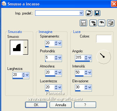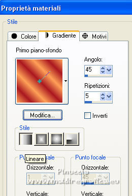 qui puoi trovare qualche risposta ai tuoi dubbi. Se l'argomento che ti interessa non è presente, ti prego di segnalarmelo. Questo tutorial è stato realizzato con PSPX8 e tradotto con PSPX3 e PSPX, ma può essere realizzato anche con le altre versioni di PSP. Dalla versione X4, il comando Immagine>Rifletti è stato sostituito con Immagine>Capovolgi in orizzontale, e il comando Immagine>Capovolgi con Immagine>Capovolgi in verticale. Nelle versioni X5 e X6, le funzioni sono state migliorate rendendo disponibile il menu Oggetti. Con la nuova versione X7, sono tornati Rifletti>Capovolgi, ma con nuove varianti. Vedi la scheda sull'argomento qui traduzione in inglese/english translation qui/hereOccorrente: Materiale qui Per i tubes e la maschera grazie Colybrix, Valy ScrapPassions e Nikita. Il resto del materiale è di Evalynda (in questa pagina trovi i links ai siti dei creatori dei materiali utilizzati) in caso di dubbi, ricorda di consultare la mia sezione filtri qui Filters Unlimited 2.0 qui Graphics Plus - Cross Shadow qui Mura's Meister - Perspective Tiling qui Filter Factory Gallery M - Loom qui Filter Factory Gallery R - Sinfinity qui Alien Skin Xenofex 2 - Electrify qui I filtri Graphics Plus e Factory Gallery si possono usare da soli o importati in Filters Unlimited (come fare vedi qui) Se un filtro fornito appare con questa icona ![]() non esitare a cambiare modalità di miscelatura e opacità secondo i colori utilizzati. Nelle ultime versioni di PSP non c'è il gradiente di primo piano/sfondo (Corel_06_029) Puoi usare i gradienti delle versioni precedenti. Trovi qui i gradienti Corel X. ![]() Non dimenticare di cancellare le firme sui tubes (e di non salvare le modifiche quando li chiuderai). Imposta il colore di primo piano con il colore chiaro #fea058, e il colore di sfondo con il colore scuro #aa1820. ![]() Passa il colore di primo piano a Gradiente di primo piano/sfondo, stile Lineare. ![]() 1. Apri una nuova immagine trasparente 800 x 600 pixels. Riempi l'immagine trasparente con il gradiente.Livelli>Nuovo livello raster. Selezione>Seleziona tutto. Apri il tube del personaggio e vai a Modifica>Copia. Torna al tuo lavoro e vai a Modifica>Incolla nella selezione. Selezione>Deseleziona. 2. Effetti>Effetti di immagine>Motivo unico, con i settaggi standard. ![]() 3. Regola>Sfocatura>Sfocatura gaussiana - raggio 20. ![]() Regola>Sfocatura>Sfocatura Radiale. ![]() 4. Effetti>Effetti di bordo>Aumenta di più. Modifica>Ripeti Aumenta di più i bordi. Livelli>Unisci>Unisci giù. 5. Livelli>Duplica. Effetti>Plugins>Filter Factory Gallery M - Loom. ![]() 6. Effetti>Plugins>Mura's Meister - Perspective Tiling. ![]() Effetti>Effetti 3D>Sfalsa ombra, colore nero. ![]() 7. Attiva il livello inferiore. Livelli>Nuovo livello raster. Selezione>Seleziona tutto. Apri il misted del paesaggio e vai a Modifica>Copia. Torna al tuo lavoro e vai a Modifica>Incolla nella selezione. Regola>Messa a fuoco>Metti a fuoco. Selezione>Deseleziona. 8. Livelli>Duplica. Effetti>Plugins>Alien Skin Xenofex 2 - Electrify ![]() il risultato di questo effetto è casuale; se vuoi cambiarlo, clicca su Random Seed finché non vedi il risultato che preferisci Effetti>Effetti di bordo>Aumenta di più. Livelli>Disponi>Sposta giù. 9. Attiva il livello soprastante (il paesaggio senza filtro). Livelli>Unisci>Unisci giù - 2 volte. 10. Attiva il livello superiore. Apri il tube dei violini e vai a Modifica>Copia. Torna al tuo lavoro e vai a Modifica>Incolla come nuovo livello. Immagine>Ridimensiona, al 50%, tutti i livelli non selezionato. Sposta il tube a sinistra.Effetti>Effetti 3D>Sfalsa ombra, colore nero. ![]() 11. Immagine>Aggiungi bordatura, 2 pixels, simmetriche, colore nero. Immagine>Aggiungi bordatura, 46 pixels, simmetriche, colore bianco. Attiva lo strumento Bacchetta magica , sfumatura e tolleranza 0,e clicca nel bordo bianco per selezionarlo. Riempi la selezione con il gradiente.Mantieni selezionato. 12. Effetti>Plugins>Graphics Plus - Cross Shadow. ![]() Facoltativo Effetti>Plugins>Filter Factory Gallery R - Sinfinity. ![]() Regola i settaggi di Red, Green e Blue per adattarli ai tuoi colori. Se importi l'effetto in Unlimited, puoi giocare con i settaggi, cliccando su Randomize, finché non vedi la combinazione che ti piace di più ![]() Mantieni sempre selezionato. 13. Effetti>Effetti 3D>Smusso a incasso. ![]() Effetti>Effetti di bordo>Aumenta. Selezione>Deseleziona. 14. Attiva nuovamente il tube del personaggio e vai a Modifica>Copia. Torna al tuo lavoro e vai a Modifica>Incolla come nuovo livello. Immagine>Ridimensiona, al 95%, tutti i livelli non selezionato. Sposta il tube a destra.Effetti>Effetti 3D>Sfalsa ombra, a scelta. 15. Apri il tube banderole-titre (o usa il tuo) e vai a Modifica>Copia. Torna al tuo lavoro e vai a Modifica>Incolla come nuovo livello. Spostalo dove preferisci.16. Immagine>Aggiungi bordatura, 2 pixels, simmetriche, colore nero. 17. Firma il tuo lavoro su un nuovo livello. Livelli>Unisci>Unisci tutto e salva in formato jpg. Per i tubes di questa versione grazie Wieske e Macha ![]() ![]() Puoi scrivermi se hai problemi o dubbi, o trovi un link che non funziona, o soltanto per un saluto. |