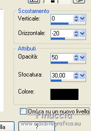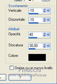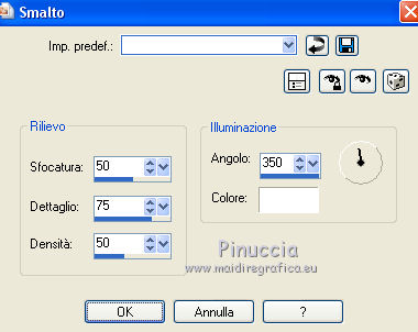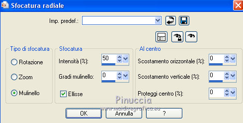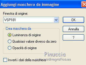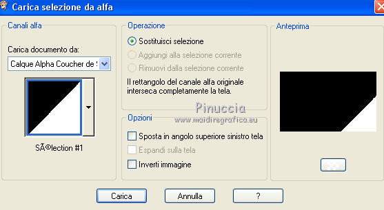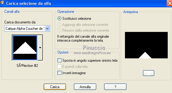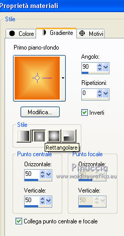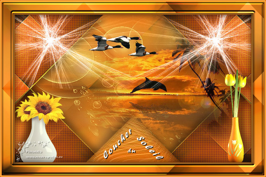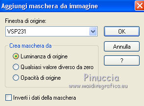qui puoi trovare qualche risposta ai tuoi dubbi. Se l'argomento che ti interessa non è presente, ti prego di segnalarmelo. Questo tutorial è stato realizzato con PSPX8 e tradotto con PSPX3 e PSPX, ma può essere realizzato anche con le altre versioni di PSP. Dalla versione X4, il comando Immagine>Rifletti è stato sostituito con Immagine>Capovolgi in orizzontale, e il comando Immagine>Capovolgi con Immagine>Capovolgi in verticale. Nelle versioni X5 e X6, le funzioni sono state migliorate rendendo disponibile il menu Oggetti. Con la nuova versione X7, sono tornati Rifletti>Capovolgi, ma con nuove varianti. Vedi la scheda sull'argomento qui traduzione in inglese/english translation qui/here Le vostre versioniOccorrente: Materiale qui Per i tubes e le maschere grazie Colybrix e ValyScrapPassion. (in questa pagina trovi i links ai siti dei creatori di tubes) Filtri: se hai problemi con i filtri, consulta la mia sezione filtri qui Mehdi - Sorting Tiles qui Carolaine and Sensibility - CS-LDots qui ![]() non esitare a cambiare modalità di miscelatura e opacità secondo i colori utilizzati. Nelle ultime versioni di PSP non c'è il gradiente di primo piano/sfondo (Corel_06_029) Puoi usare i gradienti delle versioni precedenti. Trovi qui i gradienti Corel X. Non dimenticare di cancellare le firme sui tubes. Apri le maschere in PSP e minimizzale con il resto del materiale. Imposta il colore di primo piano con #ea6403, e il colore di sfondo con #fde979. ![]() Passa il colore di primo piano a Gradiente di primo piano/sfondo, stile Rettangolare. ![]() 1. Apri Calque Alpha Coucher du soleil. Finestra>Duplica, o sulla tastiera tasto della maiuscola+D per fare una copia. ![]() Chiudi l'originale. La copia, che sarà la base del tuo lavoro, non è vuota, ma contiene le selezioni salvate sul canale alfa. Rinomina il livello "Raster 1". Riempi l'immagine trasparente con il gradiente.2. Selezione>Seleziona tutto. Apri il tube del paesaggio e vai a Modifica>Copia. Torna al tuo lavoro e vai a Modifica>Incolla nella selezione. Selezione>Deseleziona. Effetti>Effetti di immagine>Motivo unico. ![]() Regola>Sfocatura>Sfocatura radiale. ![]() 3. Effetti>Plugins>Mehi - Sorting Tiles. ![]() 4. Livelli>Nuovo livello raster. Riempi il livello con il colore di sfondo.Livelli>Nuovo livello maschera>Da immagine. Apri il menu sotto la finestra di origine e vedrai la lista dei files aperti. Seleziona la maschera VSP231 ![]() Effetti>Effetti di bordo>Aumenta di più. Livelli>Unisci>Unisci gruppo. 5. Attiva il livello inferiore. Selezione>Carica/Salva selezione>Carica selezione da canale alfa. La selezione #1 è subito disponibile. Devi soltanto cliccare Carica. ![]() Selezione>Innalza selezione a livello. Effetti>Plugins>Carolaine and Sensibility - CS-Ldots. ![]() Effetti>Effetti di bordo>Aumenta di più. Effetti>Effetti 3D>Sfalsa ombra, colore nero. ![]() Selezione>Deseleziona. 6. Livelli>Duplica. Immagine>Rifletti. Livelli>Unisci>Unisci giù. Livelli>Duplica. Immagine>Capovolgi. Livelli>Unisci>Unisci giù. Livelli>Disponi>Sposta su. 7. Attiva il livello inferiore. Selezione>Carica/Salva selezione>Carica selezione da canale alfa. Apri il menu delle selezioni e carica la selezione #2. ![]() Selezione>Innalza seleziona livello. Effetti>Effetti artistici>Smalto. ![]() Selezione>Deseleziona. Effetti>Effetti 3D>Sfalsa ombra, colore nero. ![]() Ripeti l'Effetto Sfalsa ombra, verticale e orizzontale -10. 8. Immagine>Ridimensiona, al 125%, tutti i livelli non selezionato. Tasto K sulla tastiera per attivare lo strumento Puntatore ![]() e imposta Posizione X: 213,00 e Posizione Y: 311,00 ![]() Livelli>Disponi>Porta in alto. 9. Modifica>Incolla come nuovo livello (il tube del paesaggio è sempre in memoria). Immagine>Rifletti. Immagine>Ridimensiona, al 75%, tutti i livelli non selezionato. Oggetti>Allinea>Destra o con lo strumento Puntatore ![]() imposta Posizione X: 162,00 (mantieni Posizione Y: 11,00) ![]() Livelli>Disponi>Sposta giù. 10. Attiva il livello superiore. Apri il tube delle anatre, 3tadorne, e vai a Modifica>Copia. Torna al tuo lavoro e vai a Modifica>Incolla come nuovo livello. Immagine>Ridimensiona, al 45%, tutti i livelli non selezionato. Imposta Posizione X: 250,00 e Posizione Y: 65,00 ![]() 11. Imposta il colore di primo piano con il colore bianco. Livelli>Nuovo livello raster. Riempi il livello con il colore bianco.Livelli>Nuovo livello maschera>Da immagine. Apri il menu sotto la finestra di origine Seleziona la maschera VSP181. ![]() Effetti>Effetti di bordo>Aumenta. Livelli>Unisci>Unisci gruppo. Immagine>Ridimensiona, al 50%, tutti i livelli non selezionato. Oggetti>Allinea>Superiore. Oggetti>Allinea>Sinistra. o, con lo strumento Puntatore ![]() imposta Posizione X e Y a 0,00 ![]() Livelli>Duplica. Livelli>Unisci>Unisci giù. Livelli>Duplica. Immagine>Rifletti. Livelli>Unisci>Unisci giù. Cambia la modalità di miscelatura di questo livello in Luminanza (esistente). 12. Apri il tube del vaso di Colybrix e vai a Modifica>Copia. Torna al tuo lavoro e vai a Modifica>Incolla come nuovo livello. Immagine>Ridimensona, al 50%, tutti i livelli non selezionato. Strumento Puntatore ![]() e imposta Posizione X: 710,00 e Posizione Y: 185,00 ![]() Effetti>Effetti 3D>Sfalsa ombra, colore nero. ![]() 13. Apri il tube del vaso di Valy e vai a Modifica>Copia. Torna al tuo lavoro e vai a Modifica>Incolla come nuovo livello. Immagine>Ridimensiona, al 50%, tutti i livelli non selezionato. Imposta Posizione X: 0,00 e Posizione Y: 258,00 ![]() Effetti>Effetti 3D>Sfalsa ombra, colore nero. ![]() 14. Apri il tube titre e vai a Modifica>Copia. Torna al tuo lavoro e vai a Modifica>Incolla come nuovo livello. Imposta Posizione X: 300,00 e Posizione Y: 385,00 ![]() 15. Attiva il livello inferiore. Modifica>Copia. Per i bordi, imposta nuovamente il colore di primo piano con il colore iniziale #ea6403. ![]() Immagine>Aggiungi bordatura, 2 pixels, simmetriche, colore di primo piano. Immagine>Aggiungi bordatura, 2 pixels, simmetriche, color