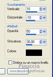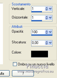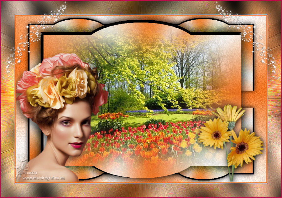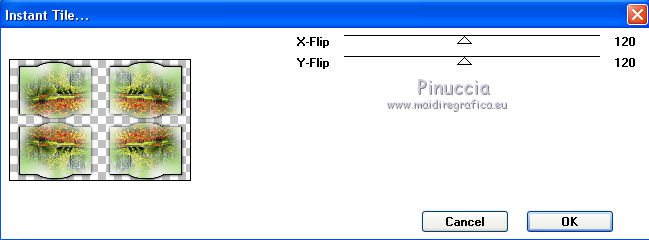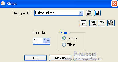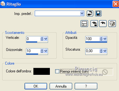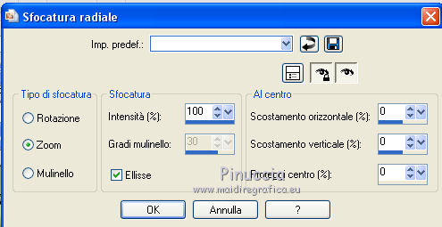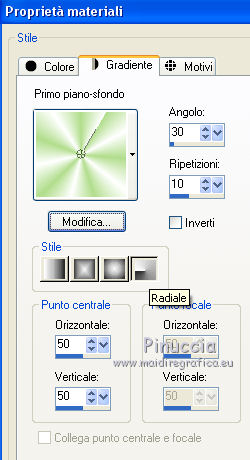 qui puoi trovare qualche risposta ai tuoi dubbi. Se l'argomento che ti interessa non è presente, ti prego di segnalarmelo. Questo tutorial è stato realizzato con PSPX8 e tradotto con PSPX3 e PSPX, ma può essere realizzato anche con le altre versioni di PSP. Dalla versione X4, il comando Immagine>Rifletti è stato sostituito con Immagine>Capovolgi in orizzontale, e il comando Immagine>Capovolgi con Immagine>Capovolgi in verticale. Nelle versioni X5 e X6, le funzioni sono state migliorate rendendo disponibile il menu Oggetti. Con la nuova versione X7, sono tornati Rifletti>Capovolgi, ma con nuove varianti. Vedi la scheda sull'argomento qui traduzione in inglese/english translation qui/hereOccorrente: Materiale qui Per i tubes grazie Karine, Colybrix e Linda. Il resto del materiale è di Evalynda (in questa pagina trovi i links ai siti dei creatori dei materiali utilizzati) in caso di dubbi, ricorda di consultare la mia sezione filtri qui Filters Unlimited 2.0 qui Graphics Plus - Cross Shadow qui VM Toolbox - Instant Tile qui I filtri Graphics Plus e VM Toolbox si possono usare da soli o importati in Filters Unlimited (come fare vedi qui) Se un filtro fornito appare con questa icona ![]() non esitare a cambiare modalità di miscelatura e opacità secondo i colori utilizzati. Nelle ultime versioni di PSP non c'è il gradiente di primo piano/sfondo (Corel_06_029) Puoi usare i gradienti delle versioni precedenti. Trovi qui i gradienti Corel X. ![]() Non dimenticare di cancellare le firme sui tubes (e di non salvare le modifiche quando li chiuderai). Imposta il colore di primo piano con il colore chiaro #b1dd8c, e il colore di sfondo con il colore bianco #ffffff. ![]() Passa il colore di primo piano a Gradiente di primo piano/sfondo, stile Radiale. ![]() 1. Apri una nuova immagine trasparente 900 x 600 pixels. Riempi l'immagine trasparente con il gradiente.Regola>Sfocatura>Sfocatura gaussiana - raggio 20. ![]() Regola>Aggiungi/Rimuovi disturbo>Aggiungi disturbo. ![]() 2. Regola>Messa a fuoco>Accentua messa a fuoco. Livelli>Duplica. 3. Chiudi il livello Raster 1. Attiva il livello Copia di Raster 1. Immagine>Ridimensiona, all'80%, tutti i livelli non selezionato. Effetti>Effetti geometrici>Sfera. ![]() 4. Effetti>Effetti 3D>Sfalsa ombra, colore nero, ombra su nuovo livello selezionato. ![]() 5. Attiva il livello Copia di Raster 1. Clicca nella parte trasparente con la bacchetta magica ![]() ![]() Apri il tube del paesaggio e vai a Modifica>Copia. Torna al tuo lavoro e vai a Modifica>Incolla come nuovo livello. Premi sulla tastiera il tasto CANC ![]() 6. Selezione>Inverti. Livelli>Nuovo livello raster. Effetti>Effetti 3D>Ritaglio, colore nero. ![]() Mantieni selezionato. 7. Livelli>Nuovo livello raster. Effetti>Effetti 3D>Ritaglio. ![]() Selezione>Deseleziona. Livelli>Unisci>Unisci giù. 8. Attiva il livello del paesaggio. Regola>Messa a fuoco>Metti a fuoco. Livelli>Unisci>Unisci visibile (il livello Raster 1 è sempre chiuso). 9. Livelli>Duplica. Effetti>Plugins>VM Toolbox - Instant Tile. ![]() Livelli>Disponi>Sposta giù. 10. Apri il livello chiuso, e attiva il livello superiore. 11. Apri il tube della donna e vai a Modifica>Copia. Torna al tuo lavoro e vai a Modifica>Incolla come nuovo livello. Immagine>Ridimensiona, al 60%, tutti i livelli non selezionato. Immagine>Rifletti. 12. Oggetti>Allinea>Inferiore. Oggetti>Allinea>Sinistra. O Sposta il tube in basso a sinistra.O con lo strumento Puntatore ![]() imposta Posizione X: 0,00 e Posizione Y: 174,00. ![]() 13. Effetti>Effetti 3D>Sfalsa ombra, colore nero ombra su nuovo livello non selezionato. ![]() 14. Apri il tube dei papaveri e vai a Modifica>Copia. Torna al tuo lavoro e vai a Modifica>Incolla come nuovo livello. Immagine>Ridimensiona, all'80%, tutti i livelli non selezionato. Sposta il tube in basso a destra.Effetti>Effetti 3D>Sfalsa ombra, colore nero. ![]() 15. Apri il tube del testo e vai a Modifica>Copia. Torna al tuo lavoro e vai a Modifica>Incolla come nuovo livello. (o un altro testo, o niente, a tua scelta). Immagine>Ridimensiona, al 90%, tutti i livelli non selezionato. Oggetti>Allinea>Superiore O con lo strumento Puntatore ![]() imposta Posizione X: 293,00 e Posizione Y: 0,00. ![]() Effetti>Effetti 3D>Sfalsa ombra, colore nero. ![]() 16. Immagine>Aggiungi bordatura, 2 pixels, simmetriche, colore #4f7a28. Modifica>Copia. 17. Selezione>Seleziona tutto. Immagine>Aggiungi bordatura, 50 pixels, simmetriche, colore bianco. Selezione>Inverti. Modifica>Incolla nella selezione. 18. Regola>Sfocatura>Sfocatura radiale. ![]() Selezione>Innalza selezione a livello. 19. Immagine>Rifletti. Effetti>Effetti di bordo>Aumenta di più. Modifica>Ripeti Aumenta di più i bordi. 20. Effetti>Plugins>Graphics Plus - Cross Shadow. ![]() Selezione>Deseleziona. 21. Apri il tube delle stelle di Linda e vai a Modifica>Copia. Torna al tuo lavoro e vai a Modifica>Incolla come nuovo livello. Immagine>Ridimensiona, al 50%, tutti i livelli non selezionato. Livelli>Duplica. Livelli>Unisci>Unisci giù. 22. Oggetti>Allinea>Superiore. Oggetti>Allinea>Sinistra. o Strumento Puntatore ![]() e imposta Posizione X e Y a 0,00 ![]() 23. Effetti>Effetti 3D>Sfalsa ombra, colore nero. ![]() Livelli>Duplica. Immagine>Rifletti. Immagine>Aggiungi bordatura, 3 pixels, simmetriche, colore #4f7a28. 24. Immagine>Ridimensiona, 900 pixels di larghezza, tutti i livelli selezionato. Firma il tuo lavoro su un nuovo livello. Livelli>Unisci>Unisci tutto e salva in formato jpg. Per i tubes di questo esempio grazie Luz Cristina e Saphiere; il misted è mio. ![]() ![]() Le vostre versioni. Grazie ![]() Trudy ![]() Marygraphics ![]() Puoi scrivermi se hai problemi o dubbi, o trovi un link che non funziona, o soltanto per un saluto. |