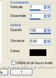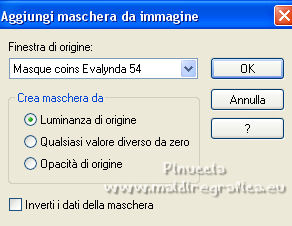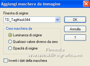 qui puoi trovare qualche risposta ai tuoi dubbi. Se l'argomento che ti interessa non è presente, ti prego di segnalarmelo. Questo tutorial è stato realizzato con PSPX8 e tradotto con PSPX3 e PSPX, ma può essere realizzato anche con le altre versioni di PSP. Dalla versione X4, il comando Immagine>Rifletti è stato sostituito con Immagine>Capovolgi in orizzontale, e il comando Immagine>Capovolgi con Immagine>Capovolgi in verticale. Nelle versioni X5 e X6, le funzioni sono state migliorate rendendo disponibile il menu Oggetti. Con la nuova versione X7, sono tornati Rifletti>Capovolgi, ma con nuove varianti. Vedi la scheda sull'argomento qui traduzione in inglese/english translation qui/here le vostre versioni / your versions qui/hereOccorrente: Materiale qui Grazie per i tubes e una maschera Colybrix, ValyScrapPassion e Tati. Il resto del materiale è di Evalynda (in questa pagina trovi i links ai siti dei creatori dei materiali utilizzati) in caso di dubbi, ricorda di consultare la mia sezione filtri qui Flaming Pear - Flood qui Alien Skin Eye Candy 5 Textures - Texture Noise qui AAA Frames - Foto Frame qui ![]() non esitare a cambiare modalità di miscelatura e opacità secondo i colori utilizzati. ![]() Non dimenticare di cancellare le firme sui tubes (e di non salvare le modifiche quando li chiuderai). Apri le maschere in PSP e minimizzale con il resto del materiale. Colori utilizzati ![]() Imposta il colore di primo piano con #271269. 1. Apri una nuova immagine trasparente 800 x 600 pixels. Riempi l'immagine trasparente con il colore di primo piano #271269.2. Effetti>Plugins>Flaming Pear - Flood colore #94e3fe ![]() 3. Imposta il colore di primo piano con il colore bianco. Livelli>Nuovo livello raster. Riempi il livello con il colore bianco.Livelli>Nuovo livello maschera>Da immagine. Apri il menu sotto la finestra di origine e vedrai la lista dei files aperti. Seleziona la maschera TD_TagMask044. ![]() Immagine>Capovolgi. Effetti>Effetti di bordo>Aumenta di più. Livelli>Unisci>Unisci gruppo. 4. Tasto K sulla tastiera per attivare lo strumento Puntatore ![]() mantieni Posizione X: 0,00 e imposta Posizione Y. -30,00. ![]() 5. Apri il misted del paesaggio e vai a Modifica>Copia. Torna al tuo lavoro e vai a Modifica>Incolla come nuovo livello. Immagine>Ridimensiona, al 75%, tutti i livelli non selezionato. Regola>Messa a fuoco>Metti a fuoco. Posiziona il tube a tuo piacimento.6. Effetti>Plugins>Flaming Pear - Flood Ho cambiato il settaggio di Horizon (70) e il colore (bianco) regola in base al tuo tube e alla sua posizione ![]() 7. Livelli>Nuovo livello raster. Imposta il colore di primo piano con il colore giallo #f9e864. Riempi il livello con il colore giallo.Livelli>Nuovo livello maschera>Da immagine. Apri il menu sotto la finestra di origine e seleziona la maschera Masque coins Evalynda 54. ![]() Livelli>Unisci>Unisci gruppo. 8. Imposta il colore di primo piano con il colore verde #669c35. Attiva lo strumento Trasforma in destinazione con i seguenti settaggi![]() Se vuoi, per vedere meglio chiudi il livello del paesaggio. 9. Sul livello della maschera passa il mouse (tasto sinistro premuto) sugli angoli in alto a destra e in basso a sinistra per colorarli. Riapri il livello del paesaggio, e rimani sempre posizionato sul livello della maschera. ![]() 10. Livelli>Duplica - 5 volte (per ravvivare i colori) Livelli>Unisci>Unisci giù - 5 volte. Regola>Messa a fuoco>Metti a fuoco. 11. Effetti>Effetti 3D>Sfalsa ombra, colore nero. ![]() Ripeti l'Effetto Sfalsa ombra, verticale e orizzontale -1. 12. Imposta il colore di primo piano con il colore blu chiaro #94e3fe Selezione>Seleziona tutto. Immagine>Aggiungi bordatura, 48 pixels, simmetriche, con un colore qualsiasi. Selezione>Inverti. Effetti>Plugins>Alien Skin Eye Candy 5 Texture - Texture Noise Preset Diamond Noise e sotto Basic imposta il colore di primo piano #94e3fe ![]() Mantieni selezionato. 13. Effetti>Effetti di bordo>Aumenta di più. Effetti>Effetti 3D>Smusso a incasso. ![]() Mantieni sempre selezionato. 14. Effetti>Plugins>AAA Frames - Foto Frame. ![]() Selezione>Deseleziona. 15. Apri il tube della donna e vai a Modifica>Copia. Torna al tuo lavoro e vai a Modifica>Incolla come nuovo livello. Immagine>Ridimensiona, all'80%, tutti i livelli non selezionato. Sposta il tube a destra.Effetti>Effetti 3D>Sfalsa ombra, a scelta. 16. Facoltativo: Apri il file di testo (o un altro a tua scelta) e vai a Modifica>Copia. Torna al tuo lavoro e vai a Modifica>Incolla come nuovo livello. Posiziona il testo a tuo piacimento.17. Firma il tuo lavoro su un nuovo livello. 18. Immagine>Aggiungi bordatura, 2 pixels, simmetriche, colore nero. Salva in formato jpg. Per il tube di questo esempio grazie Gabry (il misted è mio) ![]() ![]() Puoi scrivermi se hai problemi o dubbi, o trovi un link che non funziona, o soltanto per un saluto. |