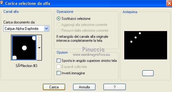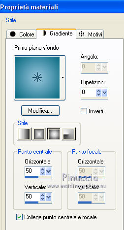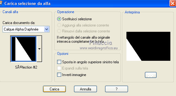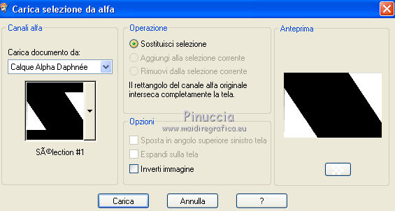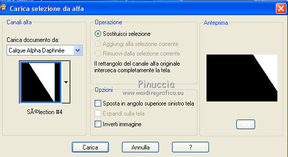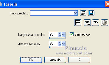 qui puoi trovare qualche risposta ai tuoi dubbi. Se l'argomento che ti interessa non è presente, ti prego di segnalarmelo. Questo tutorial è stato realizzato con PSPX8 e tradotto con PSPX7 e PSPX, ma può essere realizzato anche con le altre versioni di PSP. Dalla versione X4, il comando Immagine>Rifletti è stato sostituito con Immagine>Capovolgi in orizzontale, e il comando Immagine>Capovolgi con Immagine>Capovolgi in verticale. Nelle versioni X5 e X6, le funzioni sono state migliorate rendendo disponibile il menu Oggetti. Con la nuova versione X7, sono tornati Rifletti>Capovolgi, ma con nuove varianti. Vedi la scheda sull'argomento qui traduzione in inglese/english translation qui/here le vostre versioni/your versions qui/here Occorrente: Materiale qui Per i tubes grazie Colybrix e ValyScrapPassion (in questa pagina trovi i links ai siti dei creatori di tubes) Filtri: se hai problemi con i filtri, consulta la mia sezione filtri qui Alien Skin Eye Candy 5 Impact - Glass qui Alien Skin Eye Candy 5 Textures - Texture Noise qui Mehdi - Sorting Tiles qui Mura's Meister - Perspective Tiling qui ![]() non esitare a cambiare modalità di miscelatura e opacità secondo i colori utilizzati. Nelle ultime versioni di PSP non c'è il gradiente di primo piano/sfondo (Corel_06_029) Puoi usare i gradienti delle versioni precedenti. Trovi qui i gradienti Corel X. Imposta il colore di primo piano con il colore chiaro #9ac7de, e il colore di sfondo con il colore scuro #066980. ![]() Passa il colore di primo piano a Gradiente di primo piano/sfondo, stile Sprazzo di luce. ![]() nella versione eseguita con PSPX, il gradiente ha un aspetto differente, per questa ragione, il risultato del filtro Mura's Meister al punto 7 sarà leggermente differente. ![]() 1. Apri Canal_Alpha_Daphne. Finestra>Duplica o sulla tastiera maiuscola+D per fare una copia. ![]() Chiudi l'originale. La copia, che sarà la base del tuo lavoro, non è vuota, ma contiene le selezioni salvate sul canale alfa. Riempi l'immagine trasparente con il gradiente.Livelli>Duplica. Immagine>Rifletti. Immagine>Capovolgi. Abbassa l'opacità di questo livello al 50%. Livelli>Unisci>Unisci giù. 2. Selezione>Carica/Salva selezione>Carica selezione da canale alpha. La selezione sélection#1 è subito disponibile. Devi soltanto cliccare Carica. ![]() Selezione>Innalza selezione a livello. Mantieni selezionato. Effetti>Plugins>Alien Skin Eye Candy 5 Textures - Texture Noise. ![]() Regola>Sfocatura>Sfocatura gaussiana - raggio 5 ![]() Effetti>Effetti 3D>Sfalsa ombra, colore nero. ![]() Ripeti l'Effetto Sfalsa ombra, verticale -10. Selezione>Deseleziona. 3. Livelli>Nuovo livello raster. Selezione>Carica/Salva selezione>Carica selezione da canale alfa. Apri il menu delle selezioni e carica sélection#2. ![]() Apri il tube del paesaggio e vai a Modifica>Copia. Torna al tuo lavoro e vai a Modifica>Incolla nella selezione. Selezione>Deseleziona. Livelli>Duplica. Livelli>Unisci>Unisci giù - 2 volte. 4. Livelli>Nuovo livello raster. Selezione>Carica/Salva selezione>Carica selezione da canale alfa. Apri il menu delle selezioni e carica sélection#4. ![]() Modifica>Incolla nella selezione (il tube del paesaggio è ancora in memoria). Selezione>Deseleziona. Livelli>Duplica. Livelli>Unisci>Unisci giù - 2 volte. Attiva il livello inferiore. Modifica>Incolla come nuovo livello (il tube del paesaggio è sempre in memoria) Effetti>Effetti di immagine>Motivo unico, con i settaggi standard. ![]() Livelli>Duplica. Livelli>Unisci>Unisci giù. 6. Attiva nuovamente il livello inferiore. Effetti>Effetti di distorsione>Tasselli. ![]() Effetti>Effetti di bordo>Aumenta di più. 7. Livelli>Duplica. Effetti>Plugins>Mura's Meister - Perspective Tiling. ![]() Effetti>Effetti di bordo>Aumenta. Effetti>Effetti 3D>Sfalsa ombra, colore nero. ![]() Dovresti avere questo ![]() come spiegato al punto 1, questo è il risultato ottenuto con il gradiente della versione PSPX ![]() 8. Attiva il livello superiore. Apri il tube della donna, cancella il watermark, e vai a Modifica>Copia. Torna al tuo lavoro e vai a Modifica>Incolla come nuovo livello. Immagine>Ridimensiona, al 70%, tutti i livelli non selezionato. Tasto K per attivare lo strumento Puntatore ![]() e imposta Posizione X: 460,00 e Posizione Y: 30,00. ![]() Effetti>Effetti 3D>Sfalsa ombra, colore nero. ![]() 9. Cambia i settaggi del gradiente ![]() Livelli>Nuovo livello raster. Selezione>Carica/Salva selezione>Carica selezione da canale alfa. Apri il menu delle selezioni e carica sélection#3. ![]() Riempi la selezione con il nuovo gradiente.Effetti>Plugins>Alien Skin Eye Candy 5 Impact - Glass Seleziona il preset Clear e ok. ![]() Selezione>Deseleziona. 10. Immagine>Aggiungi bordatura, 3 pixels, simmetriche, colore scuro. Modifica>Copia. Immagine>Aggiungi bordatura, 3 pixels, simmetriche, colore bianco. Immagine>Aggiungi bordatura, 3 pixels, simmetriche, colore chiaro. Immagine>Aggiungi bordatura, 3 pixels, simmetriche, colore scuro. 11. Selezione>Seleziona tutto. Immagine>Aggiungi bordatura, 40 pixels simmetriche, colore bianco. Selezione>Inverti. Modifica>Incolla nella selezione. Regola>Sfocatura>Sfocatura gaussiana - raggio 15. ![]() Mantieni selezionato. 12. Effetti>Plugins>Mehdi - Sorting Tiles. ![]() Effetti>Effetti 3D>Pulsante. ![]() Selezione>Deseleziona. 13. Immagine>Aggiungi bordatura, 3 pixels, simmetriche, colore bianco. Immagine>Aggiungi bordatura, 3 pixels, simmetriche, colore chiaro. Immagine>Aggiungi bordatura, 3 pixels, simmetriche, colore scuro. 14. Immagine>Ridimensiona, 900 pixels di larghezza, tutti i livelli selezionato. Effetti>Effetti 3D>Pulsante, con i settaggi precedenti. Apri il tube Titre e vai a Modifica>Copia. Torna al tuo lavoro e vai a Modifica>Incolla come nuovo livello. Spostalo dove preferisci.Firma il tuo lavoro e salva in formato jpg. Versione con PSPX ![]() Versione con tubes di Nena Silva e Sonia ![]() ![]() Puoi scrivermi se hai problemi o dubbi, o trovi un link che non funziona, o soltanto 