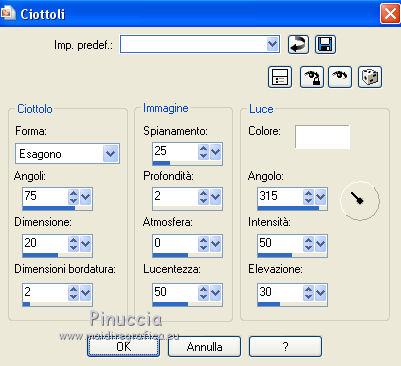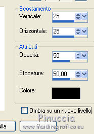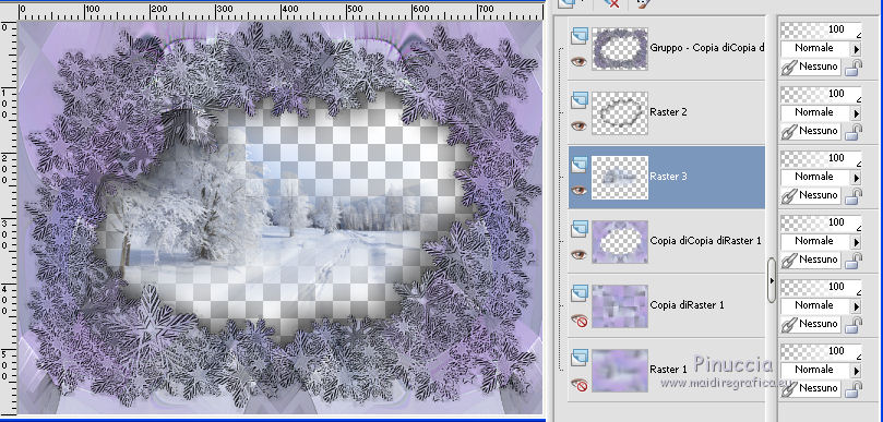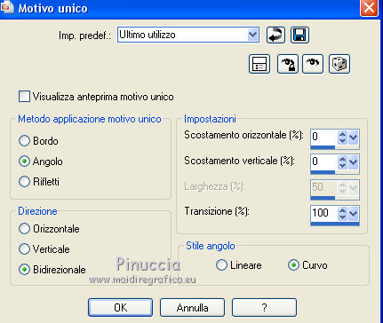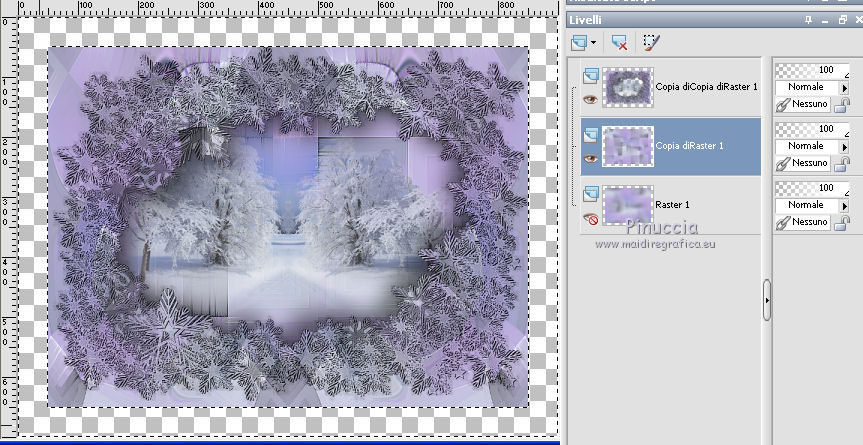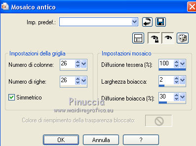qui puoi trovare qualche risposta ai tuoi dubbi. Se l'argomento che ti interessa non è presente, ti prego di segnalarmelo. Questo tutorial è stato realizzato con PSPX8 e tradotto con PSPX3 e PSPX, ma può essere realizzato anche con le altre versioni di PSP. Dalla versione X4, il comando Immagine>Rifletti è stato sostituito con Immagine>Capovolgi in orizzontale, e il comando Immagine>Capovolgi con Immagine>Capovolgi in verticale. Nelle versioni X5 e X6, le funzioni sono state migliorate rendendo disponibile il menu Oggetti. Con la nuova versione X7, sono tornati Rifletti>Capovolgi, ma con nuove varianti. Vedi la scheda sull'argomento qui traduzione in inglese/english translation qui/hereOccorrente: Materiale qui Per il tube e la maschera grazie Colybrix e ValyScrapPassion. Il resto del materiale è di Evalynda (in questa pagina trovi i links ai siti dei creatori dei materiali utilizzati) in caso di dubbi, ricorda di consultare la mia sezione filtri qui Mehdi - Sorting Tiles qui Flaming Pear - Flexify 2 qui ![]() non esitare a cambiare modalità di miscelatura e opacità secondo i colori utilizzati. Non dimenticare di cancellare le firme sui tubes (e di non salvare le modifiche quando li chiuderai). Apri la maschera in PSP e minimizzala con il resto del materiale. 1. Imposta il colore di primo piano con #bca7dd. Apri una nuova immagine trasparente 800 x 600 pixels. Riempi l'immagine trasparente con il colore di primo piano #bca7dd.Livelli>Nuovo livello raster. Selezione>Seleziona tutto. Apri il tube del paesaggio paysghiver24-coly e vai a Modifica>Copia. Torna al tuo lavoro e vai a Modifica>Incolla nella selezione. Selezione>Deseleziona. Effetti>Effetti di immagine>Motivo unico. ![]() 2. Livelli>Unisci>Unisci giù. Regola>Sfocatura>Sfocatura gaussiana - raggio 20. ![]() 3. Livelli>Duplica. Chiudi il livello inferiore, Raster 1 e rimani posizionato sul livello della copia. Effetti>Effetti di trama>Mosaico antico. ![]() 4. Effetti>Effetti di bordo>Aumenta. Effetti>Plugins>Mehdi - Sorting Tiles. ![]() Effetti>Effetti di bordo>Aumenta. 5. Livelli>Duplica. Chiudi il livello Copia di Raster 1 e rimani posizionato sul livello della seconda copia. Effetti>Plugins>Flaming Pear - Flexify attenzione, Flip è selezionato. ![]() Oggetti>Allinea>Sinistra. Se stai usando una versione precedente che non rende disponibile il menu Oggetti, tasto K sulla tastiera per attivare lo strumento Puntatore ![]() e imposta Posizione X a 0,00 (Posizione Y è già a 0,00). ![]() 6. Se non vedi il righello, vai a Visualizza>Righelli. in modalità Scala ![]() spingi il nodo centrale del bordo verticale verso sinistra, fino a 400 pixels. ![]() 7. Livelli>Duplica. Immagine>Rifletti. Livelli>Unisci>Unisci giù. 8. Livelli>Duplica. Chiudi il livello sottostante Copia (2) di Raster 1, e rimani posizionato sul livello superiore della terza copia. Livelli>Nuovo livello maschera>Da immagine. Apri il menu sotto la finestra di origine e vedrai la lista dei files aperti. Seleziona la maschera vsp096. ![]() Effetti>Effetti di bordo>Aumenta di più. Livelli>Unisci>Unisci gruppo. 9. Effetti>Effetti 3D>Sfalsa ombra, colore nero (o bianco secondo la scelta del colore di partenza). ![]() Ripeti l'Effetto Sfalsa ombra, verticale e orizzontale -1. 10. Attiva lo strumento Bacchetta magica ![]() ![]() Clicca nel centro vuoto della maschera per selezionarlo ![]() Selezione>Modifica>Espandi - 10 pixels. Apri e attiva il livello Copia (2) di Raster 1. Premi sulla tastiera il tasto CANC ![]() 11. Selezione>Inverti. Livelli>Nuovo livello raster. Effetti>Effetti 3D>Sfalsa ombra, colore nero. ![]() Ripeti l'Effetto Sfalsa ombra, cambiando verticale e orizzontale -25. 12. Selezione>Inverti. Livelli>Nuovo livello raster. Modifica>Incolla nella selezione (il tube del paesaggio è ancora in memoria). Livelli>Disponi>Sposta giù. Selezione>Deseleziona. ![]() 13. Facoltativo. Effetti>Effetti di riflesso>Specchio rotante. ![]() 14. Attiva il livello superiore della maschera. Livelli>Unisci>Unisci giù - 3 volte. 15. Immagine>Dimensioni tela - 900 x 700 pixels. ![]() Apri e attiva il livello Copia di Raster 1. Clicca, per selezionarlo, nello spazio vuoto intorno all'immagine con la Bacchetta magica ![]() ![]() Selezione>Inverti. Modifica>Taglia (questo comando taglia e tiene in memoria). 16. Selezione>Inverti. Modifica>Incolla nella selezione. Effetti>Effetti di bordo>Aumenta. Effetti>Effetti di trama>Ciottoli. ![]() Effetti>Effetti 3D>Smusso a incasso. ![]() Selezione>Deseleziona. 17. Apri il livello inferiore e attiva il livello superiore. Apri il tube Bonne Année e vai a Modifica>Copia. Torna al tuo lavoro e vai a Modifica>Incolla come nuovo livello. Strumento Puntatore ![]() e imposta Posizione X: 23,00 e Posizione Y: 33,00 (o come preferisci). ![]() Effetti>Effetti 3D>Sfalsa ombra, colore bianco. ![]() 18. Apri il tube 2022 e vai a Modifica>Copia. Torna al tuo lavoro e vai a Modifica>Incolla come nuovo livello. Imposta Posizione X: 400,00 e Posizione Y: 200,00 (o come preferisci). ![]() 19. Firma il tuo lavoro su un nuovo livello. Hai uno spazio vuoto al centro della tag, per aggiungere un messaggio personale se lo desideri. Livelli>Unisci>Unisci tutto e salva in formato jpg. Per i tubes di queste versioni grazie Isa ![]() ![]() ![]() Puoi scrivermi se hai problemi o dubbi, o trovi un link che non funziona, o soltanto per un saluto. 12 Gennaio 2022 |