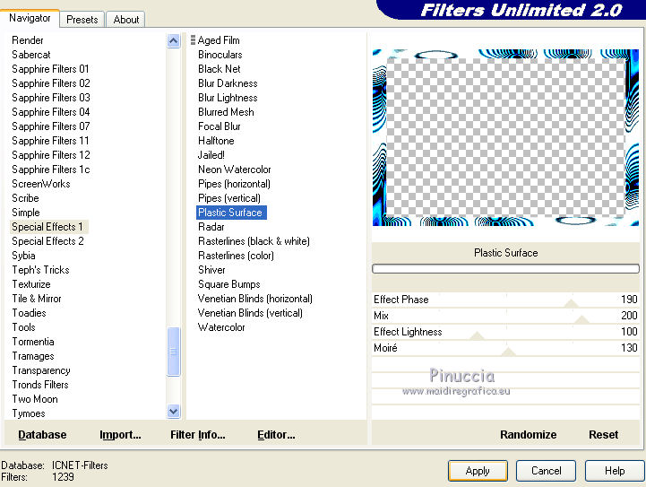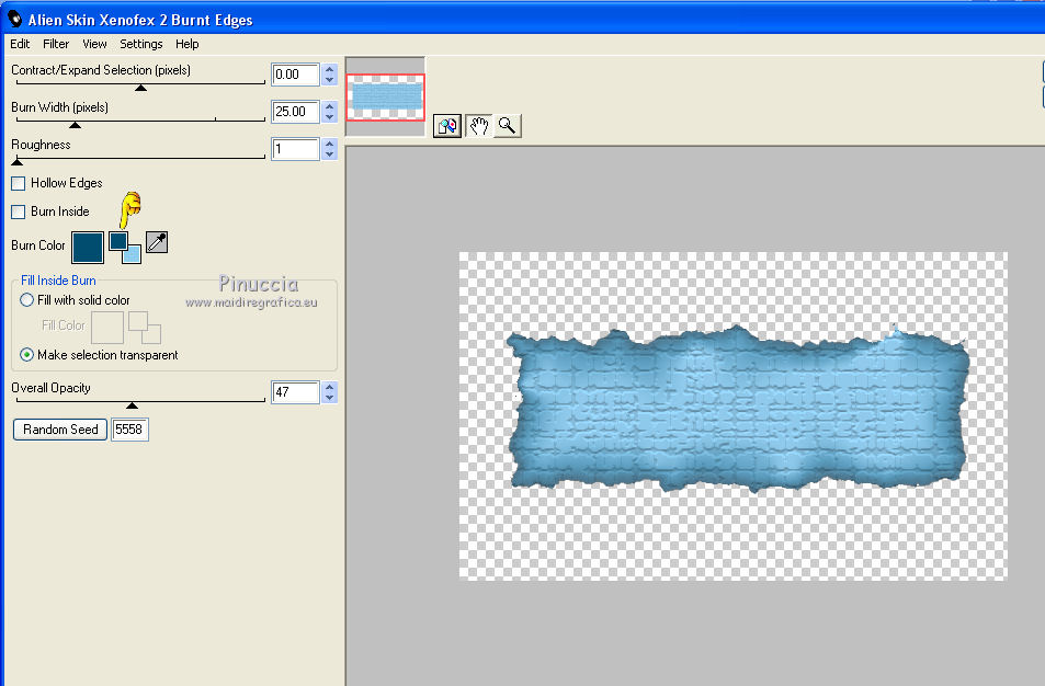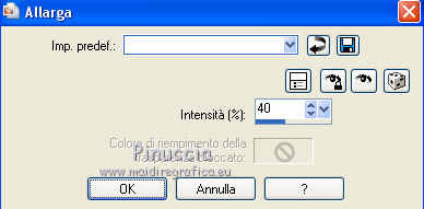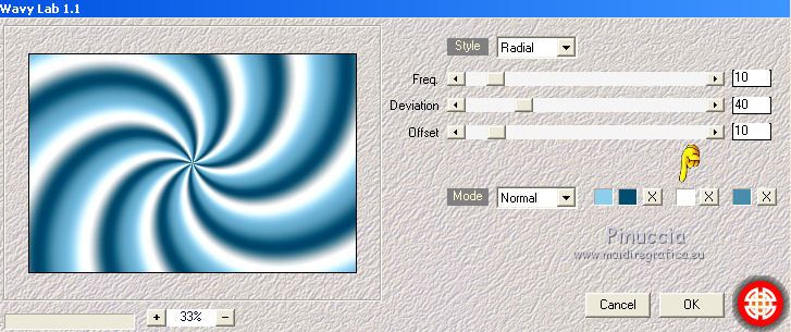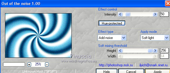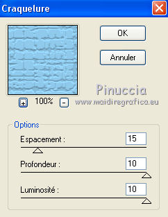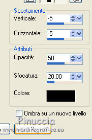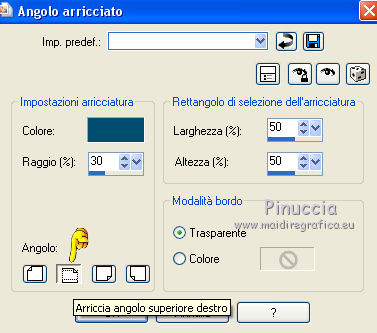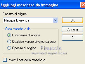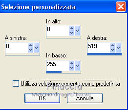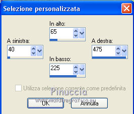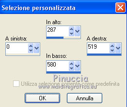 qui puoi trovare qualche risposta ai tuoi dubbi. Se l'argomento che ti interessa non è presente, ti prego di segnalarmelo. Questo tutorial è stato realizzato con PSPX8 e tradotto con PSPX7 e PSPX, ma può essere realizzato anche con le altre versioni di PSP. Dalla versione X4, il comando Immagine>Rifletti è stato sostituito con Immagine>Capovolgi in orizzontale, e il comando Immagine>Capovolgi con Immagine>Capovolgi in verticale. Nelle versioni X5 e X6, le funzioni sono state migliorate rendendo disponibile il menu Oggetti. Con la nuova versione X7, sono tornati Rifletti>Capovolgi, ma con nuove varianti. Vedi la scheda sull'argomento qui traduzione in inglese/english translation qui/here le vostre versioni/your versions qui/here Occorrente: Materiale qui Per i tubes grazie Colybrix, ValyScrapPassion e Evalynda (in questa pagina trovi i links ai siti dei creatori di tubes) Filtri: se hai problemi con i filtri, consulta la mia sezione filtri qui Filters Unlimited 2.0 qui Mehdi - Wavy Lab 1.1. qui Amphisoft - Out of the noise qui Textures - Craquelure qui Alien Skin Xenofex 2 qui ![]() non esitare a cambiare modalità di miscelatura e opacità secondo i colori utilizzati. Apri la maschera in PSP e minimizzala con il resto del materiale (non dimenticare di cancellare le firme dei tubes). Imposta il colore di primo piano con il colore scuro #004e6f, e il colore di sfondo con il colore chiaro #8fcdec. ![]() 1. Apri una nuova immagine trasparente 900 x 600 pixels. Effetti>Plugins>Mehdi - Wavy Lab. Questo filtro crea gradiente con i colori della tua paletta; il primo è il colore di sfondo, il secondo quello di primo piano. Degli ultimi due colori creati dal filtro, cambia il terzo colore con il colore bianco. ![]() 2. Effetti>Plugins>Amphisoft - Out of the noise. ![]() Regola>Messa a fuoco>Accentua messa a fuoco. Regola>Sfocatura>Sfocatura gaussiana - raggio 20. ![]() 3. Imposta il colore di primo piano con il colore bianco. Livelli>Nuovo livello raster. Riempi il livello con il colore bianco.Livelli>Nuovo livello maschera>Da immagine. Apri il menu sotto la finestra di origine e vedrai la lista dei files aperti. Seleziona la maschera Masque Evalinda ![]() Livelli>Unisci>Unisci gruppo. Effetti>Effetti di bordo>Aumenta. Immagine>Ridimensiona, al 90%, tutti i livelli non selezionato. 4. Attiva lo strumento Bacchetta magica , sfumatura e tolleranza 0![]() clicca nella parte vuota del livello (all'esterno dell'immagine) per selezionarla. ![]() Attiva il livello inferiore, Raster 1. Selezione>Innalza selezione a livello. Selezione>Deseleziona. Effetti>Plugins>Filters Unlimited 2.0 - Special Effects 1 - Plastic Surface. ![]() 5. Apri il tube "2019-2020-3-coly". Livelli>Nuovo livello raster. Riempi con il colore chiaro di sfondo.Livelli>Disponi>Sposta giù. Attiva nuovamente il livello superiore. Cancella la firma, se non lo hai già fatto. Attiva lo strumento Selezione ![]() (non importa il tipo di selezione impostato, perchè con la selezione personalizzata si ottiene sempre un rettangolo) clicca sull'icona Selezione personalizzata ![]() e imposta i seguenti settaggi. ![]() Modifica>Copia e minimizza il tube. Torna al tuo lavoro e vai a Modifica>Incolla come nuovo livello. Immagine>Ridimensiona, al 50%, tutti i livelli non selezionato. Immagine>Ruota per gradi - 45 gradi a sinistra. ![]() Tasto K sulla tastiera per attivare lo strumento Puntatore ![]() e imposta Posizione X: 98,00 e Posizione Y: 296,00. ![]() 6. Attiva nuovamente il tube di Colybrix. Selezione personalizzata ![]() ![]() Modifica>Copia. Puoi chiudere il tube, senza salvare le modifiche. Torna al tuo lavoro e vai a Modifica>Incolla come nuovo livello. Immagine>Ridimensiona, all'80%, tutti i livelli non selezionato. Strumento Puntatore ![]() imposta Posizione X: 318,00 e Posizione Y:46,00 ![]() 7. Apri il tube NoëlVSP26 e vai a Modifica>Copia. Torna al tuo lavoro e vai a Modifica>Incolla come nuovo livello. Immagine>Ridimensiona, al 75%, tutti i livelli non selezionato. Strumento Puntatore ![]() imposta Posizione X: 336,00 e Posizione Y: 186,00 ![]() Effetti>Effetti 3D>Sfalsa ombra, colore nero. ![]() 8. Attiva il livello della cornice, Selezione innalzata. Clicca nella parte centrale con la bacchetta magica ![]() Selezione>Inverti. Effetti>Effetti di distorsione>Allarga. ![]() Effetti>Effetti 3D>Sfalsa ombra, colore nero. ![]() Ripeti l'Effetto Sfalsa ombra, verticale e orizzontale -5. Selezione>Deseleziona. Metti da parte il tuo lavoro per il momento. nota: se non vuoi realizzare la pergamena, apri il tube Parchemin 2 e vai a Modifica>Copia e passa al punto 10 9. Apri una nuova immagine trasparente 500 x 300 pixels. Selezione personalizzata ![]() ![]() Livelli>Nuovo livello raster. Riempi con il colore chiaro di sfondo.Effetti>Plugins>Textures - Craquelure ![]() Imposta nuovamente il colore di primo piano con il colore scuro Effetti>Plugins>Alien Skin Xenofex 2 - Burnt Edges colore scuro di primo piano ![]() Nota: il risultato di questo filtro è casuale. Questo non è importante. Puoi sempre cambiarlo cliccando su Random Seed. Effetti>Effetti di immagine>Angolo arricciato colore scuro di primo piano ![]() Selezione>Deseleziona. Modifica>Copia. 10. Torna al tuo lavoro. Attiva il livello superiore e vai a Modifica>Incolla come nuovo livello. Strumento Puntatore ![]() imposta Posizione X: 424,00 e Posizione Y: 414,00 ![]() Colorizza secondo i tuoi colori. Effetti>Effetti 3D>Sfalsa ombra, con i settaggi precedenti ancora in memoria ![]() Ripeti l'Effetto Sfalsa ombra, verticale e orizzontale 5. ![]() 11. Apri il tube Texte e vai a Modifica>Copia. Torna al tuo lavoro e vai a Modifica>Incolla come nuovo livello. O scrivi un tuo testo (nel materiale trovi il font usato per il testo fornito, o usa un altro font) Posiziona il testo sulla pergamena.Firma il tuo lavoro e salva in formato jpg. Il tube di questa versione è di Tina ![]() ![]() ![]() ![]() Puoi scrivermi se hai problemi o dubbi, o trovi un link che non funziona, o soltanto per