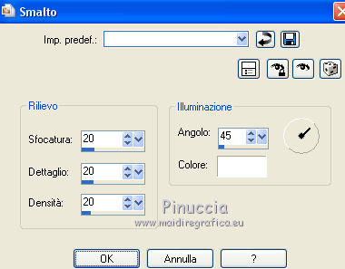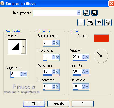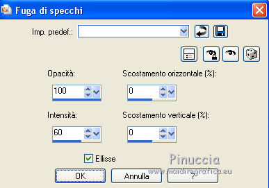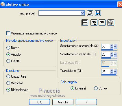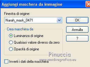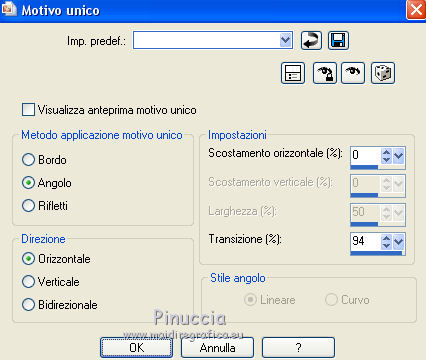 qui puoi trovare qualche risposta ai tuoi dubbi. Se l'argomento che ti interessa non è presente, ti prego di segnalarmelo. Questo tutorial è stato realizzato con PSPX8 e tradotto con PSPX7 e PSPX, ma può essere realizzato anche con le altre versioni di PSP. Dalla versione X4, il comando Immagine>Rifletti è stato sostituito con Immagine>Capovolgi in orizzontale, e il comando Immagine>Capovolgi con Immagine>Capovolgi in verticale. Nelle versioni X5 e X6, le funzioni sono state migliorate rendendo disponibile il menu Oggetti. Con la nuova versione X7, sono tornati Rifletti>Capovolgi, ma con nuove varianti. Vedi la scheda sull'argomento qui traduzione in inglese/english translation qui/here Occorrente: Materiale qui Grazie. per i tubes Nikita e per la maschera Narah. (in questa pagina trovi i links ai siti dei creatori di tubes) Filtri: se hai problemi con i filtri, consulta la mia sezione filtri qui Mura's Seamless - Shift at Arch qui Filters Unlimited 2.0 qui I filtri Mura's Seamless si possono usare da soli o importati in Filters Unlimited (come fare vedi qui) Se un filtro fornito appare con questa icona ![]() non esitare a cambiare modalità di miscelatura e opacità secondo i colori utilizzati. Apri la maschera in PSP e minimizzala con il resto del materiale. 1. Imposta il colore di primo piano con il colore #e32402, e il colore di sfondo con il colore bianco ![]() Apri una nuova immagine trasparente 900 x 600 pixels, e riempila con il colore rosso di primo piano.Apri l'immagine del paesaggio, cancella il watermark e vai a Modifica>Copia. Torna al tuo lavoro e vai a Modifica>Incolla come nuovo livello. Effetti>Effetti di immagine>Motivo unico. ![]() 2. Livelli>Duplica. Immagine>Capovolgi. Livelli>Unisci>Unisci giù. Effetti>Effetti di immagine>Motivo unico. ![]() Livelli>Unisci>Unisci giù. 3. Effetti>Effetti di riflesso>Fuga di specchi. ![]() Effetti>Plugins>Mura's Seamless - Shift at Arch. ![]() Immagine>Capovolgi. 4. Modifica>Incolla come nuovo livello (il tube del paesaggio è sempre in memoria). Immagine>Ridimensiona, al 70%, tutti i livelli non selezionato. Spostalo nell'angolo in basso a sinistra,o, con lo strumento Puntatore ![]() imposta Posizione X: -45,00 e Posizion Y: 395,00 ![]() ![]() Livelli>Duplica. Immagine>Rifletti. Livelli>Unisci>Unisci giù - 2 volte. 5. Selezione>Seleziona tutto. Immagine>Ritaglia la selezione. Livelli>Nuovo livello raster. Riempi il livello con il colore bianco.Livelli>Nuovo livello maschera>Da immagine. Apri il menu sotto la finestra di origine e vedrai la lista dei files aperti. Seleziona la maschera Narah_Mask_0471. ![]() Livelli>Unisci>Unisci gruppo. Livelli>Duplica. Immagine>Rifletti. Livelli>Unisci>Unisci giù. Effetti>Effetti di bordo>Aumenta. 6. Attiva il livello inferiore, Raster 1. Modifica>Copia. Immagine>Aggiungi bordatura, 1 pixel, simmetriche, colore nero. Immagine>Aggiungi bordatura, 60 pixels, simmetriche, colore bianco. Selezione>Seleziona tutto. Selezione>Modifica>Contrai - 50 pixels. Selezione>Inverti. Modifica>Incolla nella selezione. 7. Effetti>Effetti 3D>Scalpello - colore rosso. ![]() Effetti>Effetti artistici>Smalto. ![]() Selezione>Innalza selezione a livello. 8. Effetti>Effetti 3D>Smusso a rilievo, colore rosso. ![]() Selezione>Deseleziona. 9. Apri il tube del gatto e vai a Modifica>Copia. Torna al tuo lavoro e vai a Modifica>Incolla come nuovo livello. Immagine>Ridimensiona, all'80%, tutti i livelli non selezionato. Spostalo in basso a destra.Effetti>Effetti 3D>Sfalsa ombra, colore nero. ![]() Apri il tube del titolo "titre" e vai a Modifica>Copia. Torna al tuo lavoro e vai a Modifica>Incolla come nuovo livello. Spostalo in alto a sinistra.10. Immagine>Aggiungi bordatura, 2 pixels, simmetriche, colore nero. Immagine>Ridimensiona, 900 pixels di larghezza, tutti i livelli selezionato. Firma il tuo lavoro e salva in formato jpg. Versione con tubes di Macha e Jeanne ![]() ![]() Le vostre versioni. Grazie ![]() Olimpia ![]() Marion ![]() Puoi scrivermi se hai problemi o dubbi, o trovi un link che non funziona, o soltanto per un saluto. 14 Maggio 2019 |