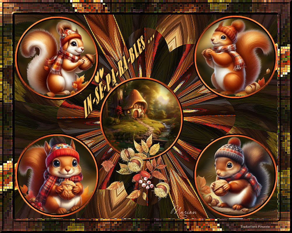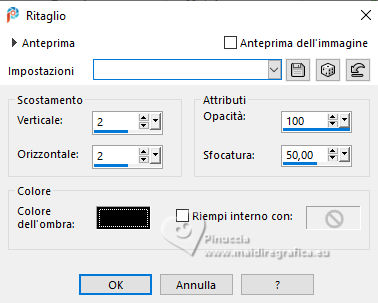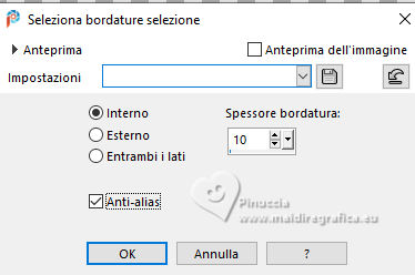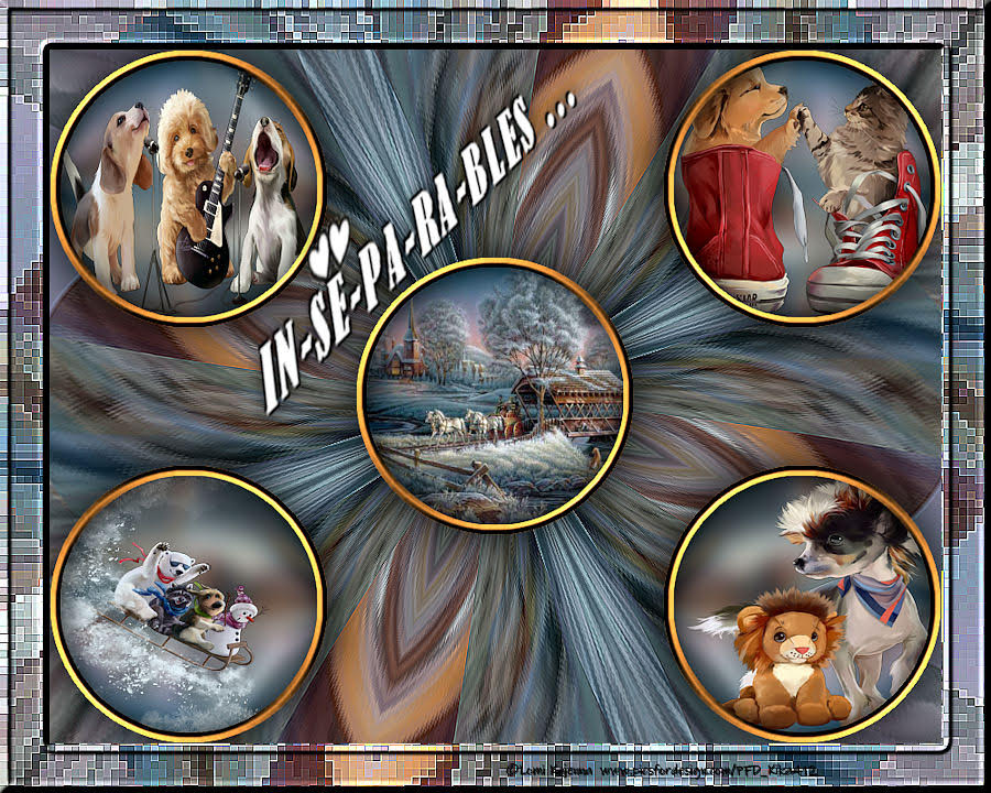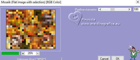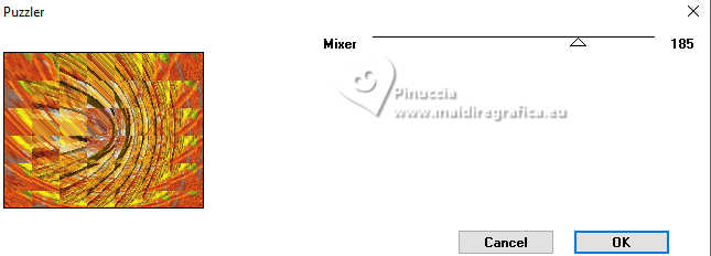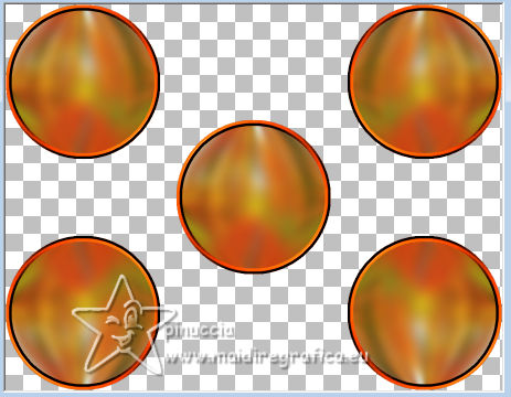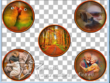 qui puoi trovare qualche risposta ai tuoi dubbi. Se l'argomento che ti interessa non è presente, ti prego di segnalarmelo. Questo tutorial è stato realizzato con PSPX8 e tradotto con PSPX3 e PSPX, ma può essere realizzato anche con le altre versioni di PSP. Dalla versione X4, il comando Immagine>Rifletti è stato sostituito con Immagine>Capovolgi in orizzontale, e il comando Immagine>Capovolgi con Immagine>Capovolgi in verticale. Nelle versioni X5 e X6, le funzioni sono state migliorate rendendo disponibile il menu Oggetti. Con la nuova versione X7, sono tornati Rifletti>Capovolgi, ma con nuove varianti. Vedi la scheda sull'argomento qui traduzione in inglese/english translation qui/hereOccorrente: Tubes a scelta. Il resto del materiale ![]() Per uno dei tubes grazie Silvie; gli altri tubes sono miei misted. (in questa pagina trovi i links ai siti dei creatori dei materiali utilizzati) ![]() in caso di dubbi, ricorda di consultare la mia sezione filtri qui Filters Unlimited 2.0 qui Birgits Chaos - Mosaik qui CPK Designs - Puzzles qui I filtri CPK Designs si possono usare da soli o importati in Filters Unlimited (come fare vedi qui) Se un filtro fornito appare con questa icona ![]() non esitare a cambiare modalità di miscelatura e opacità secondo i colori utilizzati. ![]() Scegli un colore dalla tua immagine di sfondo e impostalo come colore di primo piano. Il mio #cc3300 ![]() 1. Apri una nuova immagine trasparente 900 x 700 pixels. Selezione>Seleziona tutto. Apri la tua immagine di sfondo, ben colorata, per l'esempio Image Automne ![]() Modifica>Copia. Torna al tuo lavoro e vai a Modifica>Incolla nella selezione. Selezione>Deseleziona. 2. Livelli>Duplica. Chiudi il livello Raster 1 e continua a lavorare sul livello Copia di Raster 1. 3. Regola>Sfocatura>Sfocatura gaussiana - raggio 35. ![]() Effetti>Effetti geometrici>Cerchio. ![]() 4. Immagine>Ridimensiona, al 40%, tutti i livelli non selezionato. Attiva lo strumento Bacchetta magica ![]() ![]() Clicca nella parte trasparente per selezionarla. ![]() Selezione>Inverti. 5. Selezione>Modifica>Seleziona bordature selezione. ![]() Riempi la selezione con il colore di primo piano.6. Effetti>Effetti 3D>Smusso a incasso. ![]() Selezione>Deseleziona. 7. Livelli>Duplica. Oggetti>Allinea>Superiore. Oggetti>Allinea>Sinistra. o strumento Puntatore (K) ![]() ![]() 8. Livelli>Duplica. Immagine>Rifletti. Livelli>Duplica. Immagine>Capovolgi. Livelli>Duplica. Immagine>Rifletti. Le cinque cornici rotonde sono pronte per essere riempite. ![]() 9. Attiva il livello del quadro centrale. Selezione>Seleziona tutto. Selezione>Mobile. Selezione>Immobilizza. Selezione>Modifica>Contrai - 10 pixels. Modifica>Incolla nella selezione (la tua immagine di sfondo è sempre in memoria). Regola>Messa a fuoco>Metti a fuoco. Mantieni selezionato. 10. Livelli>Nuovo livello raster. Effetti>Effetti 3D>Ritaglio. ![]() 11. Selezione>Deseleziona. Livelli>Unisci>Unisci giù. 12. Ripeti i passaggi 9,10 e 11 per gli altri quadri, ogni volta con un uno dei tuoi tubes. 13. Mantieni chiuso il livello inferiore, e controlla che tutto sia a posto ![]() Livelli>Unisci>Unisci visibile. Effetti>Effetti 3D>Sfalsa ombra, colore nero. ![]() 14. Apri e attiva il livello Raster 1. prima di continuare, salva il tuo lavoro perchè i prossimi filtri potrebbero chiudere il tuo PSP. (sono stati patchati per i nuovi sistemi operativi e per le nuove versioni di PSP) Effetti>Plugins>CPK Designs - Puzzler. ![]() Il risultato dipende, ovviamente, dalla vostra immagine. Effetti>Effetti di riflesso>Caleidoscopio. ![]() Facoltativo: Effetti>Effetti di bordo>Aumenta. 15. Modifica>Copia. Selezione>Seleziona tutto. Immagine>Aggiungi bordatura, 50 pixels, simmetriche, con un colore qualsiasi. Selezione>Inverti. Modifica>Incolla nella selezione. 16. Effetti>Plugins>Birgits Chaos - Mosaik. ![]() Effetti>Effetti di bordo>Aumenta di più. Effetti>Effetti 3D>Smusso a incasso, con i settaggi precedenti. ![]() Selezione>Deseleziona. 17. Apri il testo titre ![]() Cancella il watermark e vai a Modifica>Copia. torna al tuo lavoro e vai a Modifica>Incolla come nuovo livello. (o scrivi un testo a tua scelta). Strumento Puntatore ![]() ![]() Facoltativo: aggiungi un decoro nel quadro centrale. 18. Firma il tuo lavoro su un nuovo livello. Livelli>Unisci>Unisci tutto. Immagine>Ridimensiona, 900 pixels di larghezza, tutti i livelli selezionato. Salva in formato jpg. Per i tubes di questo esempio grazie Beatriz, Lana e Silvie ![]() ![]() Le vostre versioni. Grazie ![]() Marion ![]() Kika ![]() Irene ![]() Puoi scrivermi se hai problemi o dubbi, o trovi un link che non funziona, o soltanto per un saluto. |