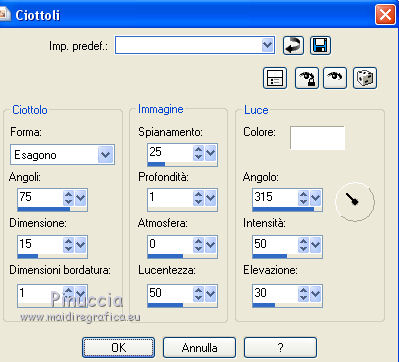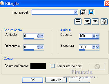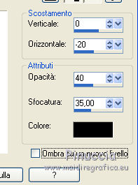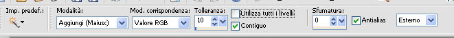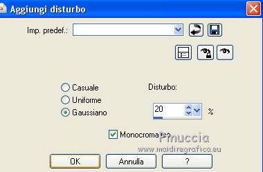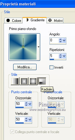 qui puoi trovare qualche risposta ai tuoi dubbi. Se l'argomento che ti interessa non è presente, ti prego di segnalarmelo. Questo tutorial è stato realizzato con PSPX8 e tradotto con PSPX3 e PSPX, ma può essere realizzato anche con le altre versioni di PSP. Dalla versione X4, il comando Immagine>Rifletti è stato sostituito con Immagine>Capovolgi in orizzontale, e il comando Immagine>Capovolgi con Immagine>Capovolgi in verticale. Nelle versioni X5 e X6, le funzioni sono state migliorate rendendo disponibile il menu Oggetti. Con la nuova versione X7, sono tornati Rifletti>Capovolgi, ma con nuove varianti. Vedi la scheda sull'argomento qui traduzione in inglese/english translation qui/hereOccorrente: Materiale qui Per i tubes e la maschera grazie Colybrix e Valy. (in questa pagina trovi i links ai siti dei creatori dei materiali utilizzati) Filtri: se hai problemi con i filtri, consulta la mia sezione filtri qui Filters Unlimited 2.0 qui Mehdi - Sorting Tiles qui Penta.com - Dot and Cross qui I filtri Penta.com si possono usare da soli o importati in Filters Unlimited (come fare vedi qui) Se un filtro fornito appare con questa icona ![]() non esitare a cambiare modalità di miscelatura e opacità secondo i colori utilizzati. Nelle ultime versioni di PSP non c'è il gradiente di primo piano/sfondo (Corel_06_029) Puoi usare i gradienti delle versioni precedenti. Trovi qui i gradienti Corel X. Non dimenticare di cancellare le firme sui tubes (e di non salvare le modifiche quando li chiuderai). Apri la maschera in PSP e minimizzala con il resto del materiale. 1. Imposta il colore di primo piano con il colore chiaro #accfbb, e il colore di sfondo con il colore scuro #037984. ![]() Passa il colore di primo piano a Gradiente di primo piano/sfondo, stile Radiale. ![]() 1. Apri una nuova immagine trasparente 900 x 600 pixels, e riempila con il gradiente.2. Selezione>Seleziona tutto. Apri il misted del paesaggio e vai a Modifica>Copia. Torna al tuo lavoro e vai a Modifica>Incolla nella selezione. Selezione>Deseleziona. 3. Effetti>Effetti di immagine>Motivo unico, con i settaggi standard. ![]() Regola>Sfocatura>Sfocatura gaussiana - raggio 30. ![]() 4. Effetti>Plugins>Mehdi - Sorting Tiles. ![]() Effetti>Effetti di bordo>Aumenta di più. 5. Livelli>Duplica. Effetti>Plugins>Penta.com - Dot and Cross, con i settaggi standard. ![]() 6. Livelli>Nuovo livello raster. Riempi il livello con il colore scuro di sfondo.Livelli>Nuovo livello maschera>Da immagine. Apri il menu sotto la finestra di origine e vedrai la lista dei files aperti. Seleziona la maschera 03PSPMask ![]() Effetti>Effetti di bordo>Aumenta di più. Livelli>Unisci>Unisci gruppo. Effetti>Effetti 3D>Sfalsa ombra, colore bianco. ![]() 7. Immagine>Ridimensiona, all'80%, tutti i livelli non selezionato. Tasto K per attivare lo strumento Puntatore ![]() e imposta Posizione X: 150,00 e Posizione Y: 55,00 ![]() Regola>Messa a fuoco>Metti a fuoco. 8. Attiva lo strumento Bacchetta magica ![]() ![]() Clicca al centro della maschera per selezionarla. Regola>Aggiungi/Rimuovi disturbo. ![]() 9. Modifica>Incolla come nuovo livello (il tube del paesaggio è sempre in memoria). Immagine>Ridimensiona, all'85%, tutti i livelli non selezionato. Posiziona il tube sulla selezione.Selezione>Inverti. Premi sulla tastiera il tasto CANC ![]() Di nuovo Selezione>Inverti. Livelli>Nuovo livello raster. Effetti>Effetti 3D>Ritaglio. ![]() Selezione>Deseleziona. 10. Attiva il livello inferiore, Raster 1. Livelli>Disponi>Porta in alto. Selezione>Seleziona tutto. Selezione>Modifica>Contrai - 50 pixels. Selezione>Inverti. Effetti>Effetti di trama>Ciottoli. ![]() 11. Selezione>Inverti. Premi sulla tastiera il tasto CANC ![]() Effetti>Effetti 3D>Ritaglio, con i settaggi precedenti. Selezione>Deseleziona. 12. Apri il tube della donna e vai a Modifica>Copia. Torna al tuo lavoro e vai a Modifica>Incolla come nuovo livello. Immagine>Ridimensiona, al 70%, tutti i livelli non selezionato. Immagine>Rifletti. Strumento Puntatore ![]() e imposta Posizione X: 95,00 e Posizione Y: 25,00 ![]() Effetti>Effetti 3D>Sfalsa ombra, colore nero. ![]() 13. Apri il tube del testo "titre" e vai a Modifica>Copia. Torna al tuo lavoro e vai a Modifica>Incolla come nuovo livello. Imposta Posizione X: 450,00 e Posizione Y: 500,00 ![]() 14. Selezione>Seleziona tutto. Selezione>Modifica>Contrai - 3 pixels. Selezione>Inverti. Riempi la selezione con il gradiente.(non esitare a ingrandire per vedere meglio).Selezione>Deseleziona. Firma il tuo lavoro su un nuovo livello. Livelli>Unisci>Unisci tutto e salva in formato jpg. Versione con tube di Azalée; il paesaggio è mio ![]() ![]() Le vostre versioni. Grazie ![]() Marygraphics ![]() Inachisme ![]() Puoi scrivermi se hai problemi o dubbi, o trovi un link che non funziona, o soltanto per un saluto. 12 Giugno 2021 |