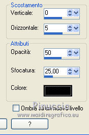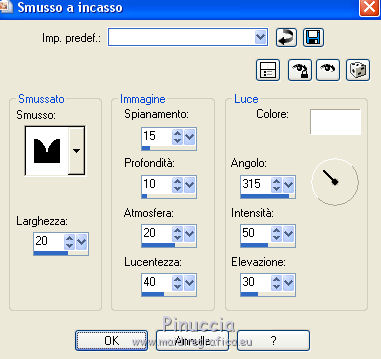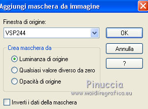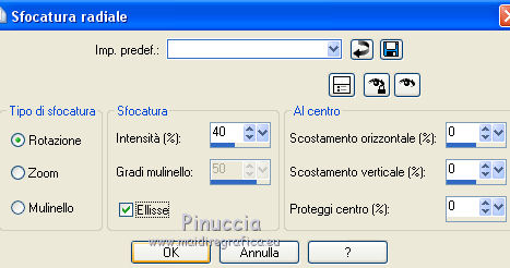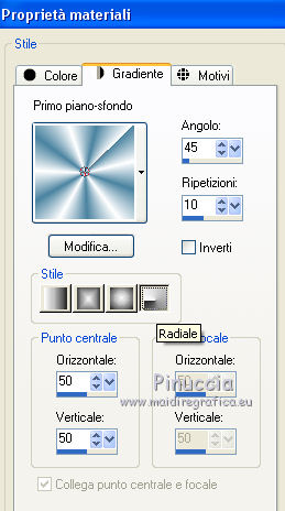qui puoi trovare qualche risposta ai tuoi dubbi. Se l'argomento che ti interessa non è presente, ti prego di segnalarmelo. Questo tutorial è stato realizzato con PSPX8 e tradotto con PSPX3 e PSPX, ma può essere realizzato anche con le altre versioni di PSP. Dalla versione X4, il comando Immagine>Rifletti è stato sostituito con Immagine>Capovolgi in orizzontale, e il comando Immagine>Capovolgi con Immagine>Capovolgi in verticale. Nelle versioni X5 e X6, le funzioni sono state migliorate rendendo disponibile il menu Oggetti. Con la nuova versione X7, sono tornati Rifletti>Capovolgi, ma con nuove varianti. Vedi la scheda sull'argomento qui traduzione in inglese/english translation qui/hereOccorrente: Materiale qui Per i tubes e la maschera grazie Colybrix e Valy. (in questa pagina trovi i links ai siti dei creatori dei materiali utilizzati) Filtri: se hai problemi con i filtri, consulta la mia sezione filtri qui Filters Unlimited 2.0 qui &<Bkg Kaleidoscope> - Kaleidoscope Butterfly (da importare in Unlimited) qui &<Bkg Designer sf10II> - Chaos Mirror (da importare in Unlimited) qui Flaming Pear - Flexify 2 qui [AFS IMPORT] - MIRROFF qui Mura's Meister - Perspective Tiling qui I filtri AFS IMPORT si possono usare da soli o importati in Filters Unlimited (come fare vedi qui) Se un filtro fornito appare con questa icona ![]() non esitare a cambiare modalità di miscelatura e opacità secondo i colori utilizzati. Nelle ultime versioni di PSP non c'è il gradiente di primo piano/sfondo (Corel_06_029) Puoi usare i gradienti delle versioni precedenti. Trovi qui i gradienti Corel X. Non dimenticare di cancellare le firme sui tubes (e di non salvare le modifiche quando li chiuderai). Apri la maschera in PSP e minimizzala con il resto del materiale. 1. Apri una nuova immagine trasparente 800 x 500 pixels. Selezione>Seleziona tutto. Apri il misted del paesaggio e vai a Modifica>Copia. Torna al tuo lavoro e vai a Modifica>Incolla nella selezione. Selezione>Deseleziona. 2. Effetti>Effetti di immagine>Motivo unico, con i settaggi standard. ![]() Effetti>Effetti di immagine>Motivo unico. ![]() Livelli>Unisci>Unisci tutto. 3. Regola>Sfocatura>Sfocatura radiale. ![]() Calques / Fusionner tous (aplatir) Effetti>Effetti di bordo>Aumenta di più. 4. Effetti>Plugins>Filters Unlimited 2.0 - &<Bkg Kaleidoscope> - Kaleidoscope Butterfly. ![]() 5. Effetti>Plugins>Flaming Pear - Flexify 2. ![]() Effetti>Effetti di bordo>Aumenta di più. 6. Livelli>Innalza livello di sfondo. Livelli>Duplica. Effetti>Effetti geometrici>Cerchio. ![]() Immagine>Ruota per gradi - 90 gradi a destra. ![]() 7. Attiva lo strumento Bacchetta magica , sfumatura e tolleranza 0,e clicca nella parte trasparente per selezionarla. Selezione>Inverti. Modifica>Incolla nella selezione (il misted del paesaggio è sempre in memoria). Livelli>Nuovo livello raster. Effetti>Effetti 3D>Ritaglio ![]() Livelli>Nuovo livello raster. Ripeti Effetti>Effetti 3D>Ritaglio, verticale e orizzontale -10 ![]() Selezione>Deseleziona. 8. Livelli>Unisci>Unisci giù - 2 volte. Immagine>Ridimensiona, all'80%, tutti i livelli non selezionato. 9. Attiva il livello inferiore, Raster 1. Effetti>Plugins>Filters Unlimited 2.0 - &<Bkg Designer sf10II> - Mirror Chaos. ![]() Effetti>Effetti di bordo>Aumenta. Effetti>Plugins>Filters Unlimited 2.0 - &<Bkg Designer sf10II> - Mirror Chaos, con i settaggi standard. ![]() Livelli>Duplica. 10. Effetti>Plugins>Filters Unlimited 2.0 - [AFS IMPORT] - MIRROFF, con i settaggi standard. ![]() 11. Attiva nuovamente il livello Raster 1. Effetti>Plugins>Mura's Meister - Perspective Tiling. ![]() Livelli>Disponi>Sposta su. Effetti>Effetti di bordo>Aumenta. 12. Attiva il livello superiore. Imposta il colore di primo piano con il colore bianco. Livelli>Nuovo livello raster. Riempi il livello con il colore bianco.Livelli>Nuovo livello maschera>Da immagine. Apri il menu sotto la finestra di origine e vedrai la lista dei files aperti. Seleziona la maschera VSP244 ![]() Effetti>Effetti di bordo>Aumenta di più. Livelli>Unisci>Unisci gruppo. Immagine>Ridimensiona, al 50%, tutti i livelli non selezionato. 13. Livelli>Duplica. Livelli>Unisci>Unisci giù. Oggetti>Allinea>Sinistra Oggetti>Allinea>Superiore. o attiva lo strumento Puntatore (tasto K sulla tastiera)e imposta Posizione X e Posizione Y a 00,00. ![]() 14. Livelli>Duplica. Immagine>Rifletti. 15. Apri uno dei tube delle bambine e vai a Modifica>Copia. Torna al tuo lavoro e vai a Modifica>Incolla come nuovo livello. Immagine>Ridimensiona, al 50%, tutti i livelli non selezionato. Regola>Messa a fuoco>Metti a fuoco. Sposta il tube a sinistra.Effetti>Effetti 3D>Sfalsa ombra, colore nero. ![]() 16. Apri il secondo tube delle bambine e vai a Modifica>Copia. Torna al tuo lavoro e vai a Modifica>Incolla come nuovo livello. Immagine>Ridimensiona, al 50%, tutti i livelli non selezionato. Regola>Messa a fuoco>Metti a fuoco. Sposta il tube a destra.Effetti>Effetti 3D>Sfalsa ombra, colore nero. ![]() 17. Copia e incolla come nuovo livello il tube della torta. Aggiungi la candela e il segno dei Gemelli (se vuoi). Ridimensiona di conseguenza. Aggiungi un leggero Sfalsa ombra sulla candela. Unisci i tre livelli in un unico livello. Immagine>Ridimensiona, al 40%, tutti i livelli non selezionato. Regola>Messa a fuoco>Metti a fuoco. Posiziona il tube in basso al centro, come nel mio esempio.Effetti>Effetti 3D>Sfalsa ombra, colore nero. ![]() Ripeti l'Effetto Sfalsa ombra orizzontale -5. ![]() 18. Imposta il colore di primo piano con un colore scuro del tuo lavoro, per me #4a83a0 e il colore di sfondo con il colore bianco. ![]() Passa il colore di primo piano a Gradiente di primo piano/sfondo, stile Radiale. ![]() 19. Selezione>Seleziona tutto. Immagine>Aggiungi bordatura, 50 pixels, simmetriche, colore bianco. Selezione>Inverti. Riempi la selezione con il gradiente.20. Effetti>Effetti tecniche di disegno>Pennellate. ![]() Effetti>Effetti di bordo>Aumenta. 21. Effetti>EFfetti 3D>Smusso a incasso. ![]() Selezione>Dese