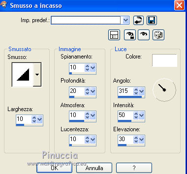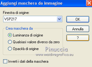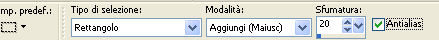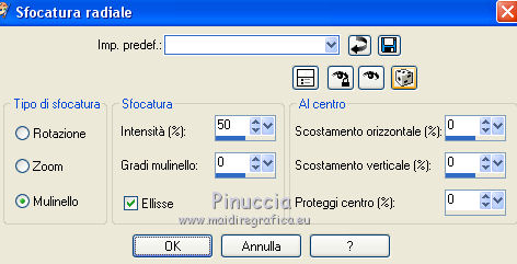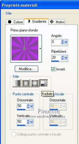 qui puoi trovare qualche risposta ai tuoi dubbi. Se l'argomento che ti interessa non è presente, ti prego di segnalarmelo. Questo tutorial è stato realizzato con PSPX8 e tradotto con PSPX3 e PSPX, ma può essere realizzato anche con le altre versioni di PSP. Dalla versione X4, il comando Immagine>Rifletti è stato sostituito con Immagine>Capovolgi in orizzontale, e il comando Immagine>Capovolgi con Immagine>Capovolgi in verticale. Nelle versioni X5 e X6, le funzioni sono state migliorate rendendo disponibile il menu Oggetti. Con la nuova versione X7, sono tornati Rifletti>Capovolgi, ma con nuove varianti. Vedi la scheda sull'argomento qui traduzione in inglese/english translation qui/here Le vostre versioniOccorrente: Materiale qui Grazie per il tube Colybrix e per le maschere ValyScrapPassion e Narah. (in questa pagina trovi i links ai siti dei creatori di tubes) Filtri: se hai problemi con i filtri, consulta la mia sezione filtri qui Filters Unlimited 2.0 qui Graphics Plus - Cross Shadow qui Mura's Meister - Perspective Tiling qui I filtri Graphics Plus si possono usare da soli o importati in Filters Unlimited (come fare vedi qui) Se un filtro fornito appare con questa icona ![]() non esitare a cambiare modalità di miscelatura e opacità secondo i colori utilizzati. Nelle ultime versioni di PSP non c'è il gradiente di primo piano/sfondo (Corel_06_029) Puoi usare i gradienti delle versioni precedenti. Trovi qui i gradienti Corel X. Non dimenticare di cancellare le firme sui tubes. Apri le maschere in PSP e minimizzale con il resto del materiale. 1. Apri una nuova immagine trasparente 800 x 500 pixels. Apri il tube del paesaggio e vai a Modifica>Copia. Torna al tuo lavoro e vai a Modifica>Incolla come nuovo livello. Effetti>Effetti di immagine>Motivo unico. ![]() Effetti>Effetti di immagine>Motivo unico. ![]() Livelli>Unisci>Unisci tutto. 2. Regola>Sfocatura>Sfocatura radiale. ![]() Effetti>Effetti di bordo>Aumenta di più. Regola>Controluce ![]() 3. Modifica>Incolla come nuovo livello (il tube del paesaggio è sempre in memoria). Non spostarlo; è al suo posto. 4. Livelli>Duplica. Effetti>Plugins>Mura's Meister - Perspective Tiling. ![]() Attiva lo strumento Selezione , sfumatura 20![]() e traccia una selezione sul bordo dell'immagine come nell'esempio ![]() Rilasciato il tasto del mouse, la selezione si allargherà per effetto della sfumatura. ![]() Premi 2 volte sulla tastiera il tasto CANC ![]() Selezione>Deseleziona. 5. Imposta il colore di primo piano con il colore bianco. Livelli>Nuovo livello raster. Riempi il livello con il colore bianco.Livelli>Nuovo livello maschera>Da immagine. Apri il menu sotto la finestra di origine e vedrai la lista dei files aperti. Seleziona la maschera Narah_mask0562 ![]() Effetti>Effetti di bordo>Aumenta di più. Livelli>Unisci>Unisci gruppo. 6. Immagine>Ridimensiona, all'80%, tutti i livelli non selezionato. Tasto K sulla tastiera per attivare lo strumento Puntatore ![]() e imposta Posizione X e Y a 0,00. ![]() Livelli>Duplica. Immagine>Rifletti. Livelli>Unisci>Unisci giù. Livelli>Disponi>Sposta giù. 7. Livelli>Nuovo livello raster. Riempi il livello con il colore bianco.Livelli>Nuovo livello maschera>Da immagine. Apri il menu sotto la finestra di origine e seleziona la maschera VSP217 ![]() Effetti>Effetti di bordo>Aumenta di più. Livelli>Unisci>Unisci gruppo. 8. Strumento Puntatore ![]() e imposta Posizione X: 0,00 e Posizione Y: -230,00. ![]() Attiva il livello inferiore. Selezione>Seleziona tutto. Immagine>Ritaglia la selezione. 9. Attiva il livello superiore. Apri il tube barrière e vai a Modifica>Copia. Torna al tuo lavoro e vai a Modifica>Incolla come nuovo livello. Strumento Puntatore ![]() e imposta Posizione X: 390,00 e Posizione Y: 300,00. ![]() Livelli>Duplica. Immagine>Rifletti. Livelli>Unisci>Unisci giù. Attiva lo strumento Puntatore ![]() in modalità Scala ![]() spingi il nodo superiore al centro verso il basso fino a 350 pixels (se non visualizzi il righello, vai a Visualizza>Righelli) ![]() Regola>Messa a fuoco>Metti a fuoco. 10. Imposta il colore di primo piano con il colore #be38f3, e il colore di sfondo con il colore #7c488a. ![]() Passa il colore di primo piano a Gradiente di primo piano/sfondo, stile Radiale. ![]() 11. Selezione>Seleziona tutto. Immagine>Aggiungi bordatura, 48 pixels, simmetriche, colore di sfondo. Selezione>Inverti. Riempi la selezione con il gradiente.Effetti>Plugins>Graphics Plus - Cross Shadow. ![]() Ripeti l'Effetto una seconda volta. 12. Effetti>Effetti 3D>Smusso a incasso. ![]() Effetti>Effetti 3D>Sfalsa ombra, colore nero. ![]() Ripeti l'Effetto Sfalsa ombra, verticale e orizzontale -10. Selezione>Deseleziona. 13. Apri il tube della donna e vai a Modifica>Copia. Torna al tuo lavoro e vai a Modifica>Incolla come nuovo livello. Immagine>Ridimensiona, al 72%, tutti i livelli non selezionato. Sposta il tube in basso a sinistra.Effetti>Effetti 3D>Sfalsa ombra, colore nero. ![]() 14. Apri il tube della lavanda e vai a Modifica>Copia. Torna al tuo lavoro e vai a Modifica>Incolla come nuovo livello. Immagine>Ridimensiona, 2 volte al 75%, tutti i livelli non selezionato. Sposta il tube in basso a destra.Regola>Messa a fuoco>Metti a fuoco. Effetti>Effetti 3D>Sfalsa ombra, colore nero. ![]() 15. Apri il tube titre (o aggiungi il tuo testo) e vai a Modifica>Copia. Torna al tuo lavoro e vai a Modifica>Incolla come nuovo livello. Sposta il testo dove preferisci, o vedi il mio esempio.Immagine>Aggiungi bordatura, 2 pixels, simmetriche, colore di sfondo. 16. Firma il tuo lavoro su un nuovo livello. Livelli>Unisci>Unisci tutto e salva in formato jpg. Versione con tube di Luz Cristina ![]() Le vostre versioni Grazie ![]() Shanty ![]() Marygraphics ![]() Puoi scrivermi se hai problemi o dubbi, o trovi un link che non funziona, o soltanto per un saluto. 15 Agosto 2020 |