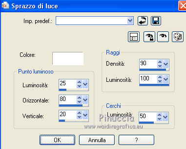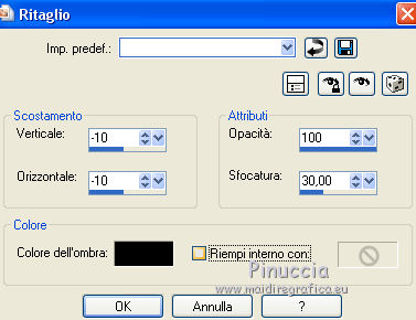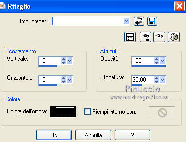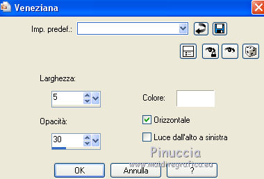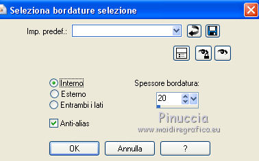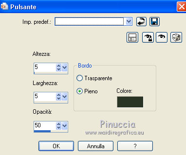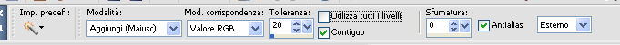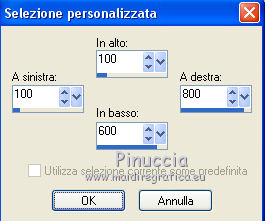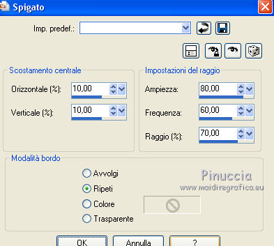 qui puoi trovare qualche risposta ai tuoi dubbi. Se l'argomento che ti interessa non è presente, ti prego di segnalarmelo. Questo tutorial è stato realizzato con PSPX8 e tradotto con PSPX7 e PSPX, ma può essere realizzato anche con le altre versioni di PSP. Dalla versione X4, il comando Immagine>Rifletti è stato sostituito con Immagine>Capovolgi in orizzontale, e il comando Immagine>Capovolgi con Immagine>Capovolgi in verticale. Nelle versioni X5 e X6, le funzioni sono state migliorate rendendo disponibile il menu Oggetti. Con la nuova versione X7, sono tornati Rifletti>Capovolgi, ma con nuove varianti. Vedi la scheda sull'argomento qui traduzione in inglese/english translation qui/here le vostre versioni/your versions qui/here Occorrente: Materiale qui Per i tubes grazie Nono59, ValyScrapPassion e Colybrix (in questa pagina trovi i links ai siti dei creatori di tubes) Filtri: se hai problemi con i filtri, consulta la mia sezione filtri qui Mehdi - Sorting Tiles qui Mura's Meister - Perspective Tiling qui ![]() non esitare a cambiare modalità di miscelatura e opacità secondo i colori utilizzati. Imposta il colore di primo piano con il colore #03b0f9, e il colore di sfondo con il colore bianco #ffffff. ![]() 1. Apri una nuova immagine trasparente 900 x 700 pixels. Riempi l'immagine trasparente con il colore di primo piano.Selezione>Seleziona tutto. Livelli>Nuovo livello raster. Apri l'immagine "Carrés" e vai a Modifica>Copia. Torna al tuo lavoro e vai a Modifica>Incolla nella selezione. Selezione>Deseleziona. Cambia la modalità di miscelatura di questo livello in Sovrapponi. 2. Effetti>Effetti di distorsione>Spigato. ![]() Effetti>Effetti di bordo>Aumenta di più. Livelli>Unisci>Unisci giù. 3. Effetti>Plugins>Mehdi - Sorting Tiles. ![]() Attiva lo strumento Selezione ![]() (non importa il tipo di selezione impostato, perchè con la selezione personalizzata si ottiene sempre un rettangolo) clicca sull'icona Selezione personalizzata ![]() e imposta i seguenti settaggi. ![]() Livelli>Nuovo livello raster. Apri l'immagine "Ciel" e vai a Modifica>Copia. Torna al tuo lavoro e vai a Modifica>Incolla nella selezione. Mantieni selezionato. Livelli>Nuovo livello raster. Apri il tube del paesaggio e vai a Modifica>Copia. Torna al tuo lavoro e vai a Modifica>Incolla nella selezione. Selezione>Deseleziona. 4. Tasto K per attivare lo strumento Puntatore ![]() e imposta Posizione X: -20,00 e Posizione Y: 173,00. ![]() Livelli>Duplica. Immagine>Rifletti. Livelli>Unisci>Unisci giù - 2 volte. 5. Selezione personalizzata ![]() ![]() Selezione>Inverti. Premi sulla tastiera il tasto CANC ![]() Effetti>Effetti 3D>Sfalsa ombra, colore nero. ![]() Ripeti l'Effetto Sfalsa ombra, verticale e orizzontale -10. Selezione>Deseleziona. 6. Effetti>Effetti di illuminazione>Sprazzo di luce. ![]() Regola>Messa a fuoco>Accentua messa a fuoco. 7. Apri il tube dell'indiano e vai a Modifica>Copia. Torna al tuo lavoro e vai a Modifica>Incolla come nuovo livello. Immagine>Ridimensiona, all'80%, tutti i livelli non selezionato. Immagine>Rifletti. Regola>Messa a fuoco>Metti a fuoco. Tasto K per attivare lo strumento Puntatore ![]() e imposta Posizione X: 101,00 e Posizione Y: 177,00. ![]() Effetti>Effetti 3D>Sfalsa ombra, colore nero. ![]() 8. Attiva il livello inferiore. Selezione personalizzata , con i settaggi precedenti.![]() Selezione>Inverti. Selezione>Innalza selezione a livello. 9. Effetti>Effetti 3D>Ritaglio ![]() Livelli>Duplica. Effetti>Effetti 3D>Ritaglio ![]() Selezione>Deseleziona. Livelli>Unisci>Unisci giù. 10. Attiva lo strumento Bacchetta magica con i seguenti settaggi![]() Clicca nella parte trasparente al centro per selezionarla. Selezione>Modifica>Contrai - 30 pixels. Selezione>Modifica>Seleziona bordature selezione. ![]() Livelli>Nuovo livello raster. Riempi con il colore di primo piano.Effetti>Effetti di trama>Veneziana ![]() Effetti>Effetti di trama>Veneziana ![]() Effetti>Effetti 3D>Pulsante ![]() Selezione>Deseleziona. 11. Attiva il livello inferiore. Livelli>Duplica. Effetti>Plugins>Mura's Meister - Perspective Tiling. ![]() 12. Attiva il livello superiore. Apri il tube della donna e vai a Modifica>Copia. Torna al tuo lavoro e vai a Modifica>Incolla come nuovo livello. Immagine>Ridimensiona, al 60%, tutti i livelli non selezionato. Spostalo in basso a destra.Effetti>Effetti 3D>Sfalsa ombra, colore nero. ![]() 13. Apri il tube del lupo e vai a Modifica>Copia. Torna al tuo lavoro e vai a Modifica>Incolla come nuovo livello. Regola>Messa a fuoco>Metti a fuoco. Spostalo in basso accanto alla donna.Effetti>Effetti 3D>Sfalsa ombra, con i settaggi precedenti. 14. Apri la decorazione e vai a Modifica>Copia. Torna al tuo lavoro e vai a Modifica>Incolla come nuovo livello. Immagine>Ridimensiona, al 50%, tutti i livelli non selezionato. Spostalo nell'angolo in alto a destra.Apri il tube del testo e vai a Modifica>Copia. Torna al tuo lavoro e vai a Modifica>Incolla come nuovo livello. Spostalo in alto a sinistra.15. Firma il tuo lavoro su un nuovo livello. Livelli>Unisci>Unisci tutto e salva in formato jpg. ![]() ![]() Puoi scrivermi se hai problemi o dubbi, o trovi un link che non funziona, o soltanto per un saluto. 19 Settembre 2019 |