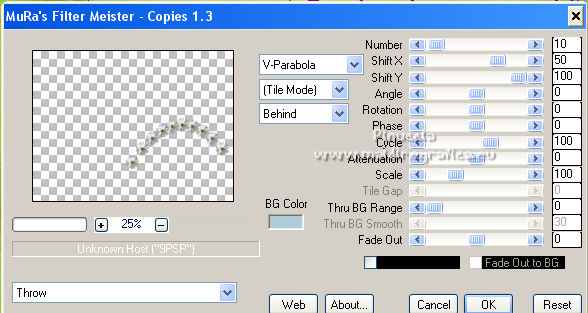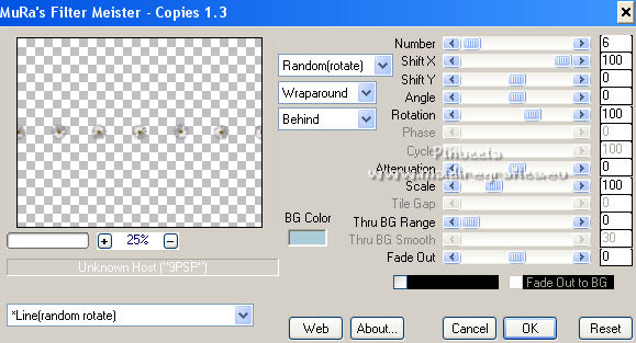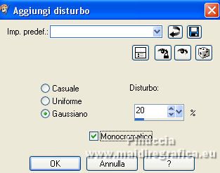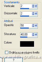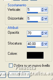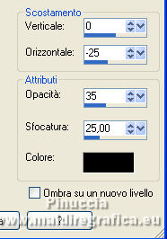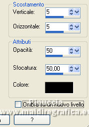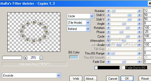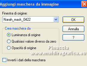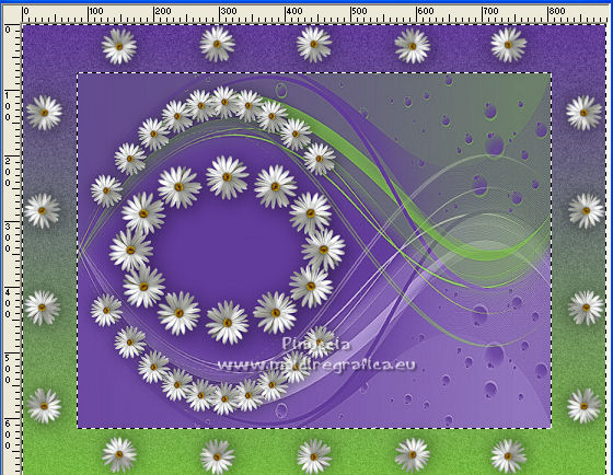 qui puoi trovare qualche risposta ai tuoi dubbi. Se l'argomento che ti interessa non è presente, ti prego di segnalarmelo. Questo tutorial è stato realizzato con PSPX8 e tradotto con PSPX3 e PSPX, ma può essere realizzato anche con le altre versioni di PSP. Dalla versione X4, il comando Immagine>Rifletti è stato sostituito con Immagine>Capovolgi in orizzontale, e il comando Immagine>Capovolgi con Immagine>Capovolgi in verticale. Nelle versioni X5 e X6, le funzioni sono state migliorate rendendo disponibile il menu Oggetti. Con la nuova versione X7, sono tornati Rifletti>Capovolgi, ma con nuove varianti. Vedi la scheda sull'argomento qui traduzione in inglese/english translation qui/hereOccorrente: Materiale qui Grazie per il tube e la maschera Nikita e Narah. Il resto del materiale è di Evalynda (in questa pagina trovi i links ai siti dei creatori dei materiali utilizzati) in caso di dubbi, ricorda di consultare la mia sezione filtri qui Mura's Meister - Copies qui ![]() non esitare a cambiare modalità di miscelatura e opacità secondo i colori utilizzati. Nelle ultime versioni di PSP non c'è il gradiente di primo piano/sfondo (Corel_06_029) Puoi usare i gradienti delle versioni precedenti. Trovi qui i gradienti Corel X. ![]() Non dimenticare di cancellare le firme sui tubes (e di non salvare le modifiche quando li chiuderai). Apri la maschera in PSP e minimizzala con il resto del materiale. Imposta il colore di primo piano con #613c9b, e il colore di sfondo con #bca7dd. ![]() 1. Apri una nuova immagine trasparente 800 x 600 pixels. Riempi l'immagine trasparente con il colore scuro di primo piano.Livelli>Nuovo livello raster. Riempi con il colore chiaro di sfondo.2. Livelli>Nuovo livello maschera>Da immagine. Apri il menu sotto la finestra di origine e vedrai la lista dei files aperti. Seleziona la maschera Narah_mask_0422. ![]() Livelli>Duplica. Livelli>Unisci>Unisci gruppo. Effetti>Effetti di bordo>Aumenta. 3. Imposta il colore di primo piano con il colore verde ![]() Livelli>Nuovo livello raster. Riempi il livello con il colore verde #77bb41.Livelli>Nuovo livello maschera>Da immagine. Apri il menu sotto la finestra di origine e carica nuovamente la maschera Narah_mask_0422. ![]() Livelli>Duplica. Livelli>Unisci>Unisci gruppo. Effetti>Effetti di bordo>Aumenta. Immagine>Capovolgi. 4. Apri il tube della margherita e vai a Modifica>Copia. Minimizza il tube. Torna al tuo lavoro e vai a Modifica>Incolla come nuovo livello. Immagine>Ridimensiona, al 50%, tutti i livelli non selezionato. Effetti>Plugins>Mura's Meister - Copies. ![]() Immagine>Ridimensiona, all'80%, tutti i livelli non selezionato. 5. Tasto K sulla tastiera per attivare lo strumento Puntatore ![]() e imposta Posizione X: 52,00 e Posizione Y: 138,00 ![]() Effetti>Effetti 3D>Sfalsa ombra, colore nero. ![]() 6. Modifica>Incolla come nuovo livello (il tube della margherita è sempre in memoria). Immagine>Ridimensiona, al 30%, tutti i livelli non selezionato. Effetti>Plugins>Mura's Meister - Copies. ![]() 7. Strumento Puntatore ![]() e imposta Posizione X: 20,00 e Posizione Y: 20,00 ![]() Regola>Messa a fuoco>Metti a fuoco. Effetti>Effetti 3D>Sfalsa ombra, colore nero. ![]() Livelli>Duplica. Immagine>Capovolgi. Livelli>Unisci>Unisci visibile. Minimizza il lavoro per il momento. 8. Mantieni il colore di primo piano con il colore verde, e imposta il colore di sfondo con il colore scuro #613c9b. ![]() Passa il colore di primo piano a Gradiente di primo piano/sfondo, stile Lineare. ![]() 9. Apri una nuova immagine trasparente 890 x 690 pixels. Riempi l'immagine trasparente con il gradiente.Regola>Aggiungi/Rimuovi disturbo>Aggiungi disturbo. ![]() 10. Modifica>Incolla come nuovo livello (la margherita dovrebbe essere sempre in memoria). Immagine>Ridimensiona, al 30%, tutti i livelli non selezionato. 11. Effetti>Plugins>Mura's Meister - Copies. ![]() 12. Oggetti>Allinea>Superiore o, se la tua versione di PSP non rende disponibile il menu Oggetti, attiva lo strumento Puntatore ![]() e imposta Posizione Y a 0,00 (Posizione X è già a 0,00) ![]() Attiva lo strumento Gomma ![]() e cancella le due margherite ai lati ![]() Effetti>Effetti 3D>Sfalsa ombra, con i settaggi precedenti. ![]() Livelli>Duplica. Immagine>Capovolgi. 13. Livelli>Duplica. Immagine>Ruota per gradi - 90 gradi a destra. ![]() 14. Strumento Puntatore ![]() e imposta Posizione X e Y a 0,00 ![]() Livelli>Duplica. Immagine>Rifletti. 15. Chiudi il livello inferiore del gradiente e rimani posizionato sul livello superiore. Livelli>Unisci>Unisci visibile. Riapri e attiva il livello inferiore. 16. Attiva il lavoro che hai minimizzato prima. Modifica>Copia. Torna al tuo secondo lavoro e vai a Modifica>Incolla come nuovo livello. Immagine>Ridimensiona, al 90%, tutti i livelli non selezionato. 17. Attiva lo strumento Bacchetta magica , sfumatura e tolleranza 0,e clicca nella parte esterna trasparente per selezionarla. ![]() Effetti>Effetti 3D>Sfalsa Ombra, colore nero. ![]() Ripeti l'Effetto Sfalsa ombra, verticale e orizzontale -5. Selezione>Deseleziona. 18. Attiva il livello superiore. Apri il tube della donna e vai a Modifica>Copia. Torna al tuo lavoro e vai a Modifica>Incolla come nuovo livello. Immagine>Ridimensiona, al 70%, tutti i livelli non selezionato. Sposta il tube a destra;per il tube fornito Posizione X: 484,00 e Posizione Y: 41,00 ![]() Effetti>Effetti 3D>Sfalsa ombra, colore nero. ![]() 19. Aggiungi qualche margherita tra i capelli della donna, a tuo piacimento. 20. Apri il tube del titolo e vai a Modifica>Copia. Torna al tuo lavoro e vai a Modifica>Incolla come nuovo livello. Spostalo al centro della corona di fiori.Immagine>Aggiungi bordatura, 5 pixels, simmetriche, colore bianco. Firma il tuo lavoro su un nuovo livello. Livelli>Unisci>Unisci tutto e salva in formato jpg. Per il tube di questo esempio grazie Lana ![]() ![]() Puoi scrivermi se hai problemi o dubbi, o trovi un link che non funziona, o soltanto per un saluto. |