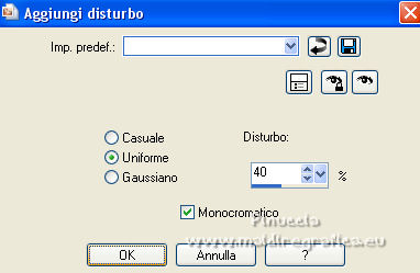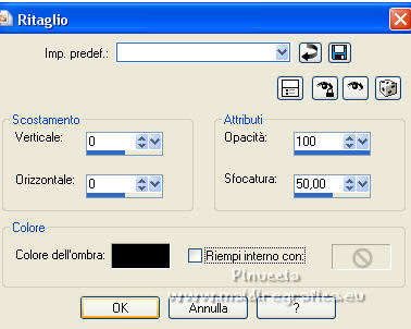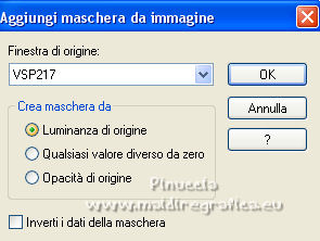 qui puoi trovare qualche risposta ai tuoi dubbi. Se l'argomento che ti interessa non è presente, ti prego di segnalarmelo. Questo tutorial è stato realizzato con PSPX8 e tradotto con PSPX3 e PSPX, ma può essere realizzato anche con le altre versioni di PSP. Dalla versione X4, il comando Immagine>Rifletti è stato sostituito con Immagine>Capovolgi in orizzontale, e il comando Immagine>Capovolgi con Immagine>Capovolgi in verticale. Nelle versioni X5 e X6, le funzioni sono state migliorate rendendo disponibile il menu Oggetti. Con la nuova versione X7, sono tornati Rifletti>Capovolgi, ma con nuove varianti. Vedi la scheda sull'argomento qui traduzione in inglese/english translation qui/here le vostre versioni / your versions qui/hereOccorrente: Materiale qui Grazie per i tubes e la maschera Colybrix, Nikita-Rêveries e ValyScrapPassion. (in questa pagina trovi i links ai siti dei creatori dei materiali utilizzati) in caso di dubbi, ricorda di consultare la mia sezione filtri qui Mehdi - Melt 1.1 qui Mura's Meister - Perspective Tiling qui ![]() non esitare a cambiare modalità di miscelatura e opacità secondo i colori utilizzati. Nelle ultime versioni di PSP non c'è il gradiente di primo piano/sfondo (Corel_06_029) Puoi usare i gradienti delle versioni precedenti. Trovi qui i gradienti Corel X. ![]() Non dimenticare di cancellare le firme sui tubes (e di non salvare le modifiche quando li chiuderai). Apri la maschera in PSP e minimizzala con il resto del materiale. 1. Apri una nuova immagine trasparente 900 x 700 pixels. Selezione>Seleziona tutto. Selezione>Modifica>Contrai - 50 pixels. Selezione>Inverti. Imposta il colore di primo piano con il colore bianco. Riempi la selezione con il colore bianco.Mantieni selezionato. 2. Imposta il colore di primo piano con il colore #bed8fc, e il colore di sfondo con il colore #015eca. ![]() Passa il colore di primo piano a Gradiente di primo piano/sfondo, stile Lineare. ![]() Livelli>Nuovo livello raster. Riempi la selezione con il gradiente.Mantieni ancora selezionato. 3. Effetti>Plugins>Mehdi - Melt 1.1. ![]() Livelli>Unisci>Unisci giù. Effetti>Effetti di bordo>Aumenta. Selezione>Inverti. 4. Cambia il colore di sfondo con il colore bianco. ![]() Cambia i settaggi del gradiente, stile Radisle. ![]() Riempi la selezione con il gradiente.Mantieni sempre selezionato. 5. Livelli>Nuovo livello raster. Apri il tube del paesaggio e vai a Modifica>Copia. Torna al tuo lavoro e vai a Modifica>Incolla nella selezione. Immagine>Ridimensiona, al 125%, tutti i livelli non selezionato. (adatta secondo la scelta del tube). Mantieni sempre selezionato. 6. Facoltativo (dipende dal tube: Livelli>Duplica. Livelli>Unisci>Unisci giù. Posiziona il tube nella selezione a tuo piacimento.Selezione>Inverti. Premi sulla tastiera il tasto CANC ![]() Selezione>Inverti. 7. Livelli>Nuovo livello raster. Effetti>Effetti 3D>Ritaglio, colore nero ![]() Selezione>Deseleziona. 8. Imposta il colore di primo piano con il colore #e3d8d5, e il colore di sfondo con il colore #ccbc81. ![]() Cambia i settaggi del gradiente, sempre stile Radiale. ![]() 9. Livelli>Nuovo livello raster. Riempi il livello con il gradiente.Effetti>Plugins>Mura's Meister - Perspective Tiling. ![]() 10. Regola>Aggiungi/Rimuovi disturbo>Aggiungi disturbo. ![]() 11. Apri il tube della sabbia Plage_Evalynda_25 e vai a Modifica>Copia. Torna al tuo lavoro e vai a Modifica>Incolla come nuovo livello. Immagine>Rifletti. Oggetti>Allinea>Inferiore. o tasto K per attivare lo strumento Puntatore ![]() e imposta Posizione X: e Posizione Y: ![]() Nota: eventalmente ricolora secondo i tuoi tube e/o i colori del suolo. 12. Apri il tuo tube principale (un personaggio o un animale) e vai a Modifica>Copia. Torna al tuo lavoro e vai a Modifica>Incolla come nuovo livello. Immagine>Ridimensiona, se necessario, per il tube fornito al 70%, tutti i livelli non selezionato. Posiziona il tube a tuo piacimento;per il tube fornito in basso a sinistra. Effetti>Effetti 3D>Sfalsa ombra, a scelta; per il tube fornito: (colore nero). ![]() 13. Aggiungi a piacimento i tube accessori (per esempio, un castello di sabbia, per restare in tema). Effetti>Effetti 3D>Sfalsa ombra, a scelta. 14. Imposta il colore di primo piano con il colore bianco. Livelli>Nuovo livello raster. Riempi il livello con il colore bianco.Livelli>Nuovo livello maschera>Da immagine. Apri il menu sotto la finestra di origine e vedrai la lista dei files aperti. Seleziona la maschera VSP217 ![]() Effetti>Effetti di bordo>Aumenta di più. Livelli>Unisci>Unisci gruppo. 15. Immagine>Ridimensiona, al 75%, tutti i livelli non selezionato. Livelli>Duplica. Livelli>Unisci>Unisci giù. Posiziona la maschera a tuo piacimento.Sposta questo livello sotto il livello del personaggio. 16. Attiva il livello superiore. Apri il tube titre e vai a Modifica>Copia. Torna al tuo lavoro e vai a Modifica>Incolla come nuovo livello. (o usa un testo a tua scelta). Posiziona a tuo piacimento.17. Firma il tuo lavoro. Immagine>Aggiungi bordatura, 5 pixels, simmetriche, colore 2. Salva in formato jpg. Versione con tubes non firmati ![]() ![]() Puoi scrivermi se hai problemi o dubbi, o trovi un link che non funziona, o soltanto per un saluto. |