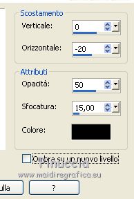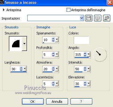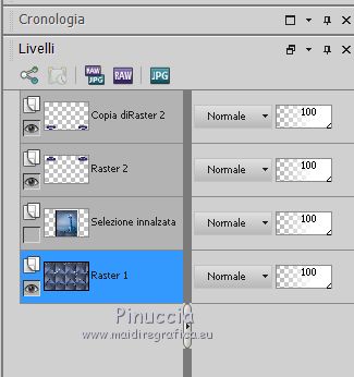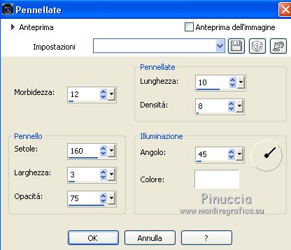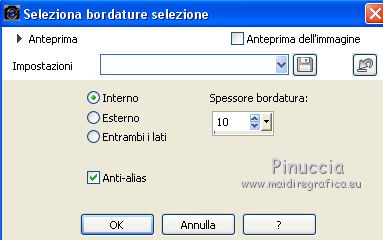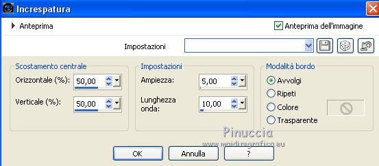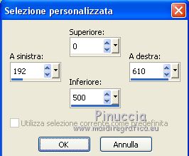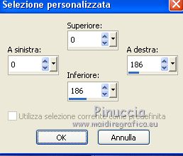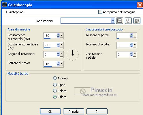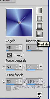 qui puoi trovare qualche risposta ai tuoi dubbi. Se l'argomento che ti interessa non è presente, ti prego di segnalarmelo. Questo tutorial è stato realizzato con PSPX8 e tradotto con PSPX3 e PSPX, ma può essere realizzato anche con le altre versioni di PSP. Dalla versione X4, il comando Immagine>Rifletti è stato sostituito con Immagine>Capovolgi in orizzontale, e il comando Immagine>Capovolgi con Immagine>Capovolgi in verticale. Nelle versioni X5 e X6, le funzioni sono state migliorate rendendo disponibile il menu Oggetti. Con la nuova versione X7, sono tornati Rifletti>Capovolgi, ma con nuove varianti. Vedi la scheda sull'argomento qui traduzione in inglese/english translation qui/here Le vostre versioniOccorrente: Materiale qui Per i tubes e la maschera grazie Colybrix, ValyScrapPassion e Narah (in questa pagina trovi i links ai siti dei creatori di tubes e materiali) Filtri: se hai problemi con i filtri, consulta la mia sezione filtri qui Filters Unlimited 2.0 qui Alien Skin Eye Candy 5 Impact - Glass qui Filter Factory Gallery D - Tri-Tile qui Graphics Plus - Cross Shadow qui AAA Frames - Foto Frame qui I filtri Factory Gallery e Graphics Plus si possono usare da soli o importati in Filters Unlimited (come fare vedi qui) Se un filtro fornito appare con questa icona ![]() non esitare a cambiare modalità di miscelatura e opacità secondo i colori utilizzati. Nelle ultime versioni di PSP non c'è il gradiente di primo piano/sfondo (Corel_06_029) Puoi usare i gradienti delle versioni precedenti. Trovi qui i gradienti Corel X. Non dimenticare di cancellare le firme sui tubes. Apri la maschera in PSP e minimizzala con il resto del materiale. Imposta il colore di primo piano con #9fc2e9, e il colore di sfondo con #1c176e. ![]() Passa il colore di primo piano a Gradiente di primo piano/sfondo, stile Radiale. ![]() 1. Apri una nuova immagine trasparente 800 x 500 pixels, e riempila con il gradiente.Selezione>Seleziona tutto. Apri il tube del personaggio e vai a Modifica>Copia. Minimizza il tube. Torna al tuo lavoro e vai a Modifica>Incolla nella selezione. Selezione>Deseleziona. 2. Effetti>Effetti di riflesso>Caleidoscopio. ![]() Regola>Sfocatura>Sfocatura gaussiana - raggio 30. ![]() Effetti>Plugins>Filters Factory Gallery D - Tri-Tile. ![]() Effetti>Effetti di bordo>Aumenta di più. Effetti>Effetti di distorsione>Increspatura (Increspa nelle versioni meno recenti). ![]() 3. Attiva lo strumento Selezione ![]() (non importa il tipo di selezione impostato, perchè con la selezione personalizzata si ottiene sempre un rettangolo) clicca sull'icona Selezione personalizzata ![]() e imposta i seguenti settaggi. ![]() Selezione>Innalza selezione a livello. Selezione>Deseleziona. Effetti>Effetti di distorsione>Coordinate polari. ![]() 4. Livelli>Duplica. Immagine>Rifletti. Livelli>Unisci>Unisci giù. 5. Selezione>Seleziona tutto. Selezione>Mobile. Selezione>Immobilizza. Livelli>Nuovo livello raster. Riempi la selezione con il colore di sfondo.Selezione>Deseleziona. 6. Livelli>Disponi>Sposta giù. Attiva il livello soprastante, Selezione innalzata. Cambia la modalità di miscelatura di questo livello in Luminanza (esistente), e abbassa l'opacità al 60%. Livelli>Unisci>Unisci giù. Effetti>Effetti di bordo>Aumenta di più. 7. Effetti>Plugins>Alien Skin Eye Candy 5 Impact - Glass. Glass color: colore di sfondo ![]() Immagine>Ridimensiona, al 70%, tutti i livelli non selezionato. Oggetti>Allinea>Sinistra Oggetti>Allinea>Superiore. Se stai lavorando con una versione precedente che non rende disponibile il menu Oggetti, attiva lo strumento Puntatore ![]() e imposta Posizione X e Y a 0,00 ![]() ![]() 8. Livelli>Duplica. Immagine>Rifletti. Livelli>Unisci>Unisci giù. Livelli>Duplica. Immagine>Capovolgi. 9. Attiva il livello inferiore. Selezione personalizzata ![]() ![]() Selezione>Innalza selezione a livello. Regola>Sfocatura>Sfocatura radiale. ![]() Mantieni selezionato. Cambia eventualmente il colore, in base al tuo paesaggio. 10. Apri il tube del paesaggio e vai a Modifica>Copia. Torna al tuo lavoro e vai a Modifica>Incolla come nuovo livello. Posiziona il tube sulla selezione a tuo piacimento.Selezione>Inverti. Premi sulla tastiera il tasto CANC ![]() 11. Selezione>Inverti. Selezione>Modifica>Seleziona bordature selezione. ![]() Livelli>Nuovo livello raster. Imposta il colore di primo piano con il colore bianco. Riempi la selezione con il colore bianco.Effetti>Effetti 3D>Smusso a incasso. ![]() 12. Effetti>Effetti 3D>Sfalsa ombra, colore nero. ![]() Ripeti l'Effetto Sfalsa ombra, verticale e orizzontale -10. Selezione>Deseleziona. Livelli>Unisci>Unisci giù - 2 volte. Chiudi questo livello per il momento, e attiva il livello inferiore. ![]() 13. Livelli>Nuovo livello raster. Riempi con il colore bianco di primo piano.Livelli>Nuovo livello maschera>Da immagine. Apri il menu sotto la finestra di origine e vedrai la lista dei files aperti. Seleziona la maschera Narah_Mask_1145. ![]() Effetti>Effetti di bordo>Aumenta di più. Immagine>Ruota per gradi - 90 gradi a destra. ![]() Immagine>Rifletti. Livelli>Unisci>Unisci gruppo. 14. Oggetti>Allinea>Sinistra, o attiva lo strumento Puntatore ![]() e imposta Posizione X a 0,00 ![]() ![]() Sempre con lo strumento Puntatore ,spingi il nodo centrale destro verso sinistra, fino a 200 pixels. ![]() Livelli>Duplica. Livelli>Unisci>Unisci giù. Livelli>Duplica. Immagine>Rifletti. 15. Riapri il livello chiuso, e attiva il livello inferiore. ![]() Modifica>Copia. Immagine>Aggiungi bordatura, 2 pixels, simmetriche, colore di sfondo. Selezione>Seleziona tutto. Immagine>Aggiungi bordatura, 46 pixels, simmetriche, colore bianco. Selezione>Inverti. Modifica>Incolla nella selezione. 16. Effetti>Effetti tecniche di disegno>Pennellate. ![]() Effetti>Plugins>Graphics Plus - Cross Shadow, con i settaggi standard. ![]() Effetti>Effetti 3D>Smusso a incasso. ![]() 17. Effetti>Effetti 3D>Sfalsa ombra, colore nero. ![]() Ripeti l'Effetto Sfalsa ombra, orizzontale -20. ![]() Selezion