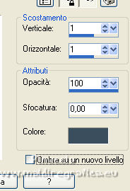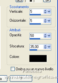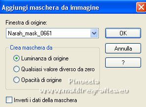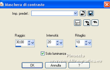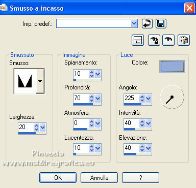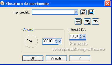 qui puoi trovare qualche risposta ai tuoi dubbi. Se l'argomento che ti interessa non è presente, ti prego di segnalarmelo. Questo tutorial è stato realizzato con PSPX8 e tradotto con PSPX3 e PSPX, ma può essere realizzato anche con le altre versioni di PSP. Dalla versione X4, il comando Immagine>Rifletti è stato sostituito con Immagine>Capovolgi in orizzontale, e il comando Immagine>Capovolgi con Immagine>Capovolgi in verticale. Nelle versioni X5 e X6, le funzioni sono state migliorate rendendo disponibile il menu Oggetti. Con la nuova versione X7, sono tornati Rifletti>Capovolgi, ma con nuove varianti. Vedi la scheda sull'argomento qui traduzione in inglese/english translation qui/hereOccorrente: Materiale qui Per i tubes e la maschera grazie Colybrix, Nikita e Narah. Il resto del materiale è di Evalynda (in questa pagina trovi i links ai siti dei creatori dei materiali utilizzati) in caso di dubbi, ricorda di consultare la mia sezione filtri qui Mehdi - Grain Natural 2.0, Curver, Fur, Melt qui Graphics Plus - Cross Shadow qui ![]() non esitare a cambiare modalità di miscelatura e opacità secondo i colori utilizzati. Non dimenticare di cancellare le firme sui tubes (e di non salvare le modifiche quando li chiuderai). Apri la maschera in PSP e minimizzala con il resto del materiale. 1. Imposta il colore di primo piano con un colore chiaro del vostro paesaggio: #fff0e1, e il colore di sfondo con un colore scuro del vostro paesaggio: #3b4e5e. ![]() Apri una nuova immagine trasparente 800 x 600 pixels. Riempi l'immagine trasparente con il colore chiaro di primo piano #fff0e1.Selezione>Seleziona tutto. Apri il misted del paesaggio e vai a Modifica>Copia. Torna al tuo lavoro e vai a Modifica>Incolla nella selezione. Selezione>Deseleziona. Effetti>Effetti di immagine>Motivo unico, con i settaggi standard. ![]() 2. Regola>Sfocatura>Sfocatura da movimento. ![]() Modifica>Ripeti Sfocatura da movimento. Livelli>Duplica. Immagine>Rifletti. Abbassa l'opacità di questo livello al 50%. Livelli>Unisci>Unisci giù. Effetti>Effetti di bordo>Aumenta di più. 3. Effetti>Plugins>Mehdi - Grain Natural 2.0. ![]() 4. Imposta il colore di primo piano con il colore bianco. Livelli>Nuovo livello raster. Riempi il livello con il colore bianco.Livelli>Nuovo livello maschera>Da immagine. Apri il menu sotto la finestra di origine e vedrai la lista dei files aperti. Seleziona la maschera Narah_mask_0661 ![]() Immagine>Ridimensiona, al 30%, tutti i livelli non selezionato. Effetti>Effetti di bordo>Aumenta di più. Livelli>Unisci>Unisci gruppo. 5. Immagine>Capovolgi. Livelli>Duplica. Livelli>Unisci>Unisci giù. Immagine>Ruota per gradi - 45 gradi a sinistra. ![]() 6. Oggetti>Allinea>Superiore. Oggetti>Allinea>Sinistra o tasto K sulla tastiera per attivae lo strumento Puntatore ![]() e imposta Posizione X e Y a 0,00 ![]() Effetti>Effetti 3D>Sfalsa ombra, colore scuro. ![]() 7. Livelli>Duplica. Immagine>Rifletti. Livelli>Unisci>Unisci giù. Livelli>Duplica. Immagine>Capovolgi. Livelli>Unisci>Unisci giù. Cambia la modalità di miscelatura di questo livello in Luminanza. 8. Attiva il livello inferiore Raster 1. Selezione>Seleziona tutto. Livelli>Nuovo livello raster. Modifica>Incolla nella selezione (il tube del paesaggio è sempre in memoria). Regola>Messa a fuoco>Metti a fuoco. Mantieni selezionato. 9. Attiva nuovamente il livello inferiore, Raster 1. Selezione>Modifica>Contrai - 50 pixels. Selezione>Inverti. Selezione>Innalza selezione a livello. 10. Effetti>Plugins>Mehdi - Curves ![]() Ripeti l'Effetto Curves una seconda volta. Selezione>Deseleziona. Livelli>Duplica. 11. Effetti>Plugins>Mehdi - Melt 1.1. ![]() Attenzione, il risultato del filtro è influenzato dal colore di sfondo. Con il colore di sfondo scuro avrai questo (il risultato finale in fondo alla traduzione) ![]() Impostando il colore di sfondo con il colore bianco avrai questo (il risultato finale sotto il titolo) ![]() A te decidere quale colore impostare Regola>Messa a fuoco>Accentua messa a fuoco. Effetti>Effetti 3D>Sfalsa ombra, con i settaggi precedenti. ![]() 12. Attiva il livello inferiore, Raster 1. Modifica>Copia. Selezione>Seleziona tutto. Immagine>Aggiungi bordatura, 46 pixels, simmetriche, con un colore qualsiasi. Selezione>Inverti. Modifica>Incolla nella selezione. Regola>Sfocatura>Sfocatura gaussiana - raggio 20. ![]() Mantieni selezionato. 13. Effetti>Plugins>Graphics Plus - Cross Shadow. ![]() Effetti>Plugins>Mehdi - Fur. ![]() Effetti>Effetti di bordo>Aumenta. Mantieni ancora selezionato. 14. Effetti>Effetti 3D>Smusso a incasso, con un colore vivo del tuo paesaggio: #94acd7. ![]() Effetti>Effetti 3D>Sfalsa ombra, colore nero. ![]() Ripeti l'Effetto Sfalsa ombra, vertical e orizzontale -5. Selezione>Deseleziona. 15. Apri il tube della donna e vai a Modifica>Copia. Torna al tuo lavoro e vai a Modifica>Incolla come nuovo livello. Immagine>Ridimensiona, al 70%, tutti i livelli non selezionato. Regola>Messa a fuoco>Metti a fuoco. Sposta il tube in basso a destra.Effetti>Effetti 3D>Sfalsa ombra, a scelta. 16. Apri il tube titre e vai a Modifica>Copia. Torna al tuo lavoro e vai a Modifica>Incolla come nuovo livello. Spostalo dove preferisci.17. Immagine>Aggiungi bordatura, 4 pixels, simmetriche, con un colore vivo del tuo paesaggio: #94acd7 18. Firma il tuo lavoro su un nuovo livello. Livelli>Unisci>Unisci tutto. Regola>Messa a fuoco>Maschera di contrasto. ![]() Salva in formato jpg. Versione con il colore di sfondo scuro prima del filtro Melt. ![]() Per il tube di questo esempio grazie Luz Cristina (il misted è mio) ![]() Per il tube di questo esempio grazie Gabry (il misted è mio) ![]() ![]() Le vostre versioni. Grazie ![]() Marygraphics ![]() Puoi scrivermi se hai problemi o dubbi, o trovi un link che non funziona, o soltanto per un saluto. |