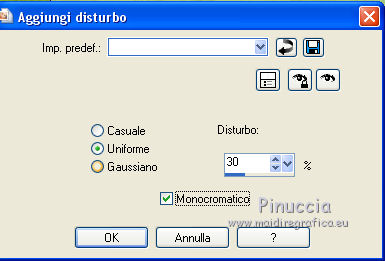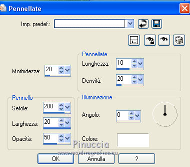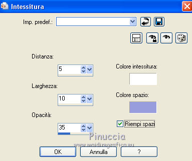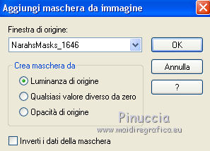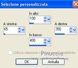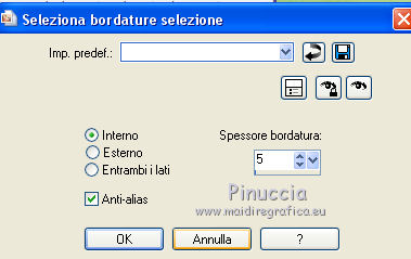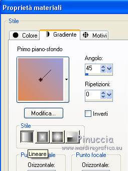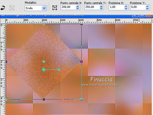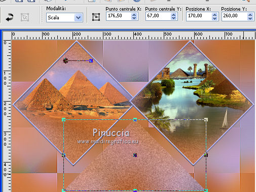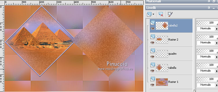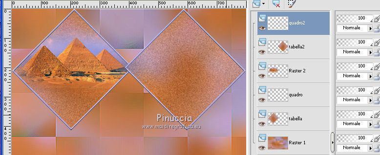 qui puoi trovare qualche risposta ai tuoi dubbi. Se l'argomento che ti interessa non è presente, ti prego di segnalarmelo. Questo tutorial è stato realizzato con PSPX8 e tradotto con PSPX3 e PSPX, ma può essere realizzato anche con le altre versioni di PSP. Dalla versione X4, il comando Immagine>Rifletti è stato sostituito con Immagine>Capovolgi in orizzontale, e il comando Immagine>Capovolgi con Immagine>Capovolgi in verticale. Nelle versioni X5 e X6, le funzioni sono state migliorate rendendo disponibile il menu Oggetti. Con la nuova versione X7, sono tornati Rifletti>Capovolgi, ma con nuove varianti. Vedi la scheda sull'argomento qui traduzione in inglese/english translation qui/hereOccorrente: Materiale qui Per i tubes e la maschera grazie Colybrix, Valy, Nikita et Narah. (in questa pagina trovi i links ai siti dei creatori dei materiali utilizzati) Filtri: se hai problemi con i filtri, consulta la mia sezione filtri qui Mehdi - Sorting Tiles qui ![]() non esitare a cambiare modalità di miscelatura e opacità secondo i colori utilizzati. Nelle ultime versioni di PSP non c'è il gradiente di primo piano/sfondo (Corel_06_029) Puoi usare i gradienti delle versioni precedenti. Trovi qui i gradienti Corel X. Non dimenticare di cancellare le firme sui tubes (e di non salvare le modifiche quando li chiuderai). Apri la maschera in PSP e minimizzala con il resto del materiale. 1. Imposta il colore di primo piano con #e4884e, e il colore di sfondo con #989ddd (due colori contrastanti) ![]() Passa il colore di primo piano a Gradiente di primo piano/sfondo, stile Lineare. ![]() Nota: se utilizzi tue foto o tue immagini al posto dei misted dei paesaggi, salta il punto 6. 1. Apri una nuova immagine trasparente 800 x 500 pixels, e riempila con il gradiente.Apri il tube di Colybrix Egypte1-coly e vai a Modifica>Copia. Torna al tuo lavoro e vai a Modifica>Incolla come nuovo livello. 2. Effetti>Effetti di immagine>Motivo unico, con i settaggi standard. ![]() 3. Regola>Sfocatura>Sfocatura gaussiana - raggio 30. ![]() 4. Effetti>Plugins>Mehdi - Sorting Tiles. ![]() Livelli>Unisci>Unisci giù. Effetti>Effetti di bordo>Aumenta di più. 5. Attiva lo strumento Selezione ![]() (non importa il tipo di selezione impostato, perchè con la selezione personalizzata si ottiene sempre un rettangolo) clicca sull'icona Selezione personalizzata ![]() e imposta i seguenti settaggi. ![]() Selezione>Innalza selezione a livello. se stai usando tue foto, passa al punto 7 6. Mantieni selezionato. Regola>Sfocatura>Sfocatura gaussiana - raggio 20. ![]() Regola>Aggiungi/Rimuovi disturbo>Aggiungi disturbo. ![]() 7. Selezione>Deseleziona. Immagine>Ruota per gradi - 45 gradi a destra. ![]() Oggetti>Allinea>Superiore Se stai lavorando con una versione precedente, che non rende disponibile il menu Oggetti, tasto K sulla tastiera per attivare lo strumento Puntatore ![]() e imposta Posizione Y a 0,00. ![]() Rinomina questo livello "tabella". 8. Selezione>Seleziona tutto. Selezione>Mobile. Selezione>Immobilizza. Selezione>Modifica>Seleziona bordature selezione. ![]() 9. Selezione>Innalza selezione a livello. Riempi la selezione con il colore di sfondo.Effetti>Effetti 3D>Smusso a incasso. ![]() Selezione>Deseleziona. Rinomina questo livello "quadro". 10. Attiva lo strumento Bacchetta magica , tolleranza e progressività 0,e clicca al centro del quadro per selezionarlo. Modifica>Incolla come nuovo livello (il tube Egypte1-coly è sempre in memoria). Immagine>Ridimensiona, al 60%, tutti i livelli non selezionato. Facoltativo: Regola>Messa a fuoco>Metti a fuoco. Posiziona il tube sulla selezione, a tuo piacimento.Selezione>Inverti. Premi sulla tastiera il tasto CANC ![]() Selezione>Deseleziona. 11. Attiva il livello "tabella". Livelli>Duplica. Rinomina questo livello "tabella 2". Livelli>Disponi>Porta in alto. Immagine>Rifletti. ![]() 12. Attiva il livello "quadro". Livelli>Duplica. Rinomina questo livello "quadro 2". Livelli>Disponi>Porta in alto. Immagine>Rifletti. ![]() 13. Attiva lo strumento Bacchetta magica , tolleranza e sfumatura 0,e clicca al centro del quadro per selezionarlo. Apri il tube di Valy misted PaysageVSP36 e vai a Modifica>Copia. Torna al tuo lavoro e vai a Modifica>Incolla come nuovo livello. Immagine>Ridimensiona, al 50%, tutti i livelli non selezionato. Facoltativo: Regola>Messa a fuoco>Metti a fuoco. Posiziona il tube sulla selezione, a tuo piacimento.Selezione>Inverti. Premi sulla tastiera il tasto CANC. Selezione>Deseleziona. 14. Attiva il livello "tabella". Livelli>Duplica. Livelli>Disponi>Porta in alto. 15. Selezione personalizzata ![]() ![]() Premi sulla tastiera il tasto CANC. Selezione>Deseleziona. 16. Immagine>Ridimensiona, al 120%, tutti i livelli non selezionato. Strumento Puntatore ![]() e imposta Posizione X: 170,00 e Posizione Y: 260,00. ![]() 17. Attiva lo strumento Bacchetta magica ![]() e clicca nella parte vuota, esterna al triangolo, per selezionarla. ![]() Selezione>Inverti. Selezione>Modifica>Seleziona bordature selezione, con i settaggi precedenti. ![]() Selezione>Innalza selezione a livello. Riempi la selezione con il colore di sfondo.18. Effetti>Effetti 3D>Smusso a incasso, con i settaggi precedenti. ![]() Selezione>Deseleziona. 19. Attiva lo strumento Bacchetta magica ![]() e clicca al centro della cornice triangolare per selezionarlo. Apri il paesaggio di Nikita e vai a Modifica>Copia. Torna al tuo lavoro e vai a Modifica>Incolla come nuovo livello. Immagine>Ridimensiona, al 50%, tutti i livelli non selezionato. Facoltativo: Regola>Messa a fuoco>Metti a fuoco. Posiziona il tube sulla selezione a tuo piacimento.Selezione>Inverti. Premi sulla tastiera il tasto CANC. Selezione>Deseleziona. 20. Chiudi il livello inferiore, Raster 1 (rimani posizionato sul livello superiore). Livelli>Unisci>Unisci visibile. 21. Effetti>Effetti 3D>Sfalsa ombra, colore nero ![]() Ripeti l'Effetto Sfalsa ombra, cambiando verticale e orizzontale -3. 22. Apri il tube del testo e vai a Modifica>Copia. Torna al t