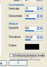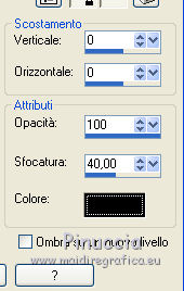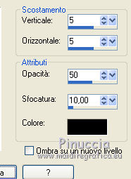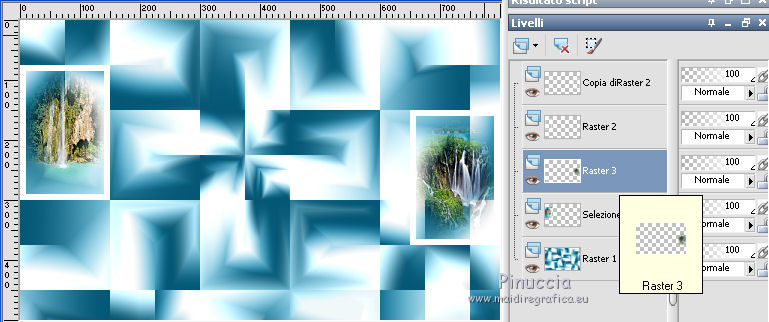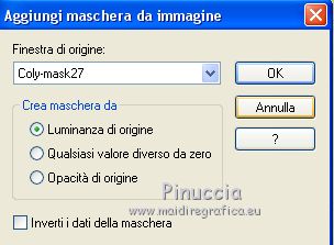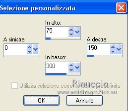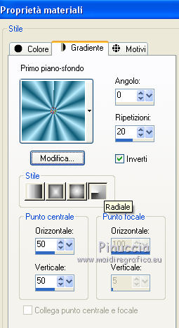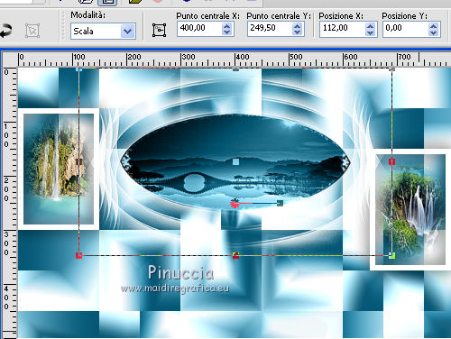 qui puoi trovare qualche risposta ai tuoi dubbi. Se l'argomento che ti interessa non è presente, ti prego di segnalarmelo. Questo tutorial è stato realizzato con PSPX8 e tradotto con PSPX3 e PSPX, ma può essere realizzato anche con le altre versioni di PSP. Dalla versione X4, il comando Immagine>Rifletti è stato sostituito con Immagine>Capovolgi in orizzontale, e il comando Immagine>Capovolgi con Immagine>Capovolgi in verticale. Nelle versioni X5 e X6, le funzioni sono state migliorate rendendo disponibile il menu Oggetti. Con la nuova versione X7, sono tornati Rifletti>Capovolgi, ma con nuove varianti. Vedi la scheda sull'argomento qui traduzione in inglese/english translation qui/here Le vostre versioniOccorrente: Materiale qui Grazie per i tubes e la maschera Colybrix e ValyScrapPassion. (in questa pagina trovi i links ai siti dei creatori di tubes) Filtri: se hai problemi con i filtri, consulta la mia sezione filtri qui Filters Unlimited 2.0 qui Mehdi - Wavy Lab 1.1 qui Mehdi - Sorting Tiles qui Graphics Plus - Graphics Plus, Emboss qui Mura's Meister - Perspective Tiling qui I filtri Graphics Plus si possono usare da soli o importati in Filters Unlimited (come fare vedi qui) Se un filtro fornito appare con questa icona ![]() non esitare a cambiare modalità di miscelatura e opacità secondo i colori utilizzati. Nelle ultime versioni di PSP non c'è il gradiente di primo piano/sfondo (Corel_06_029) Puoi usare i gradienti delle versioni precedenti. Trovi qui i gradienti Corel X. Non dimenticare di cancellare le firme sui tubes. Apri la maschera in PSP e minimizzala con il resto del materiale. 1. Imposta il colore di primo piano con #b9edff, e il colore di sfondo con #64b2ce. ![]() Apri una nuova immagine trasparente 800 x 500 pixels. Effetti>Plugins>Mehdi - Wavy Lab 1.1. questo filtro crea gradienti con i colori della paletta: il primo è il colore di sfondo, il secondo quello di primo piano; cambia gli ultimi due colori creati dal filtro: il terzo con il colore bianco #ffffff e il quarto con il colore #0d5b77. ![]() Effetti>Plugins>Mehdi - Sorting Tiles. ![]() 2. Attiva lo strumento Selezione ![]() (non importa il tipo di selezione impostato, perchè con la selezione personalizzata si ottiene sempre un rettangolo) clicca sull'icona Selezione personalizzata ![]() e imposta i seguenti settaggi. ![]() Selezione>Innalza selezione a livello. Apri il tube del paesaggio misted PaysageVSP62, e vai a Modifica>Copia. Torna al tuo lavoro e vai a Modifica>Incolla nella selezione. Regola>Messa a fuoco>Accentua messa a fuoco. Mantieni selezionato. 3. Livelli>Nuovo livello raster. Imposta il colore di primo piano con il colore bianco. Riempi la selezione con il colore bianco.Selezione>Modifica>Contrai - 10 pixels. Premi sulla tastiera il tasto CANC ![]() Selezione>Deseleziona. 4. Livelli>Duplica. Tasto K sulla tastiera per attivare lo strumento Puntatore ![]() e imposta Posizione X: 650,00 e Posizione Y: 150,00 ![]() Attiva lo strumento Bacchetta magica , sfumatura e tolleranza 0![]() e clicca al centro della cornice per selezionarla. ![]() Selezione>Modifica>Espandi - 10 pixels. 5. Livelli>Nuovo livello raster. Apri il tube misted PaysageVSP32 e vai a Modifica>Copia. Torna al tuo lavoro e vai a Modifica>Incolla nella selezione. Regola>Messa a fuoco>Accentua messa a fuoco. Selezione>Deseleziona. Livelli>Disponi>Sposta giù - 2 volte. ![]() 6. Attiva il livello superiore. Livelli>Unisci>Unisci giù. Effetti>Effetti 3D>Sfalsa ombra, colore nero. ![]() 7. Livelli>Nuovo livello raster. Riempi il livello con il colore bianco.Livelli>Nuovo livello maschera>Da immagine. Apri il menu sotto la finestra di origine e vedrai la lista dei files aperti. Seleziona la maschera Coly-mask27. ![]() Effetti>Effetti di bordo>Aumenta di più. Livelli>Unisci>Unnisci gruppo. Attiva nuovamente la bacchetta magica ![]() e clicca al centro della maschera per selezionarla. ![]() Apri l'immagine di sfondo Paysage Zen 3 e vai a Modifica>Copia. Torna al tuo lavoro e vai a Modifica>Incolla nella selezione. Regola>Messa a fuoco>Accentua messa a fuoco. Selezione>Deseleziona. 8. Immagine>Ridimensiona, 2 volte all'85%, tutti i livelli non selezionato. Strumento Puntatore ![]() e imposta Posizione X: 112,00 e Posizione Y: 0,00 ![]() Effetti>Effetti 3D>Sfalsa ombra, colore nero. ![]() 9. Attiva il livello inferiore, Raster 1. Livelli>Duplica. Effetti>Plugins>Mura's Meister - Perspective Tiling. ![]() Effetti>Effetti di bordo>Aumenta. 10. Attiva il livello superiore. Apri il tube di bouddha e vai a Modifica>Copia. Torna al tuo lavoro e vai a Modifica>Incolla come nuovo livello. Immagine>Ridimensiona, 1 volta al 50%, e una volta al 75%, tutti i livelli non selezionato. Strumento Puntatore ![]() e imposta Posizione X: 245,00 e Posizione Y: 255,00 ![]() Effetti>Effetti 3D>Sfalsa ombra, colore nero. ![]() 11. Apri il tube dei vasi e vai a Modifica>Copia. Torna al tuo lavoro e vai a Modifica>Incolla come nuovo livello. Immagine>Ridimensiona, 1 volta al 50%, e una volta al 75%, tutti i livelli non selezionato. Immagine>Rifletti. Strumento Puntatore ![]() e imposta Posizione X: 65,00 e Posizione Y: 275,00 ![]() Effetti>Effetti 3D>Sfalsa ombra, colore nero. ![]() 12. Apri il tube titre e vai a Modifica>Copia. Torna al tuo lavoro e vai a Modifica>Incolla come nuovo livello. Strumento Puntatore ![]() e imposta Posizione X: 575,00 e Posizione Y: 5,00 (o posiziona a tuo piacimento) ![]() 13. Imposta il colore di primo piano con #b9edff, e il colore di sfondo con #0d5b77. ![]() Passa il colore di primo piano a Gradiente di primo piano/sfondo, stile Radiale. ![]() 14. Immagine>Aggiungi bordatura, 1 pixel, simmetriche, colore di sfondo #0d5b77. Immagine>Aggiungi bordatura, 3 pixels, simmetriche, colore bianco. Selezione>Seleziona tutto. Immagine>Aggiungi bordatura, 30 pixels, simmetriche, colore bianco. Selezione>Inverti. Riempi la selezione con il gradiente.Regola>Sfocatura>Sfocatura gaussiana - raggio 10. ![]() Effetti>Plugins>Graphics Plus - Em