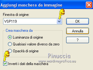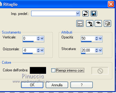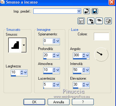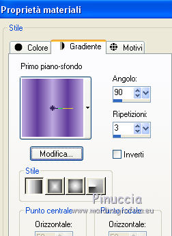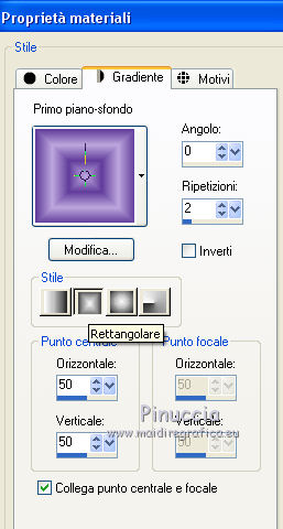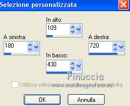 qui puoi trovare qualche risposta ai tuoi dubbi. Se l'argomento che ti interessa non è presente, ti prego di segnalarmelo. Questo tutorial è stato realizzato con PSPX8 e tradotto con PSPX7 e PSPX, ma può essere realizzato anche con le altre versioni di PSP. Dalla versione X4, il comando Immagine>Rifletti è stato sostituito con Immagine>Capovolgi in orizzontale, e il comando Immagine>Capovolgi con Immagine>Capovolgi in verticale. Nelle versioni X5 e X6, le funzioni sono state migliorate rendendo disponibile il menu Oggetti. Con la nuova versione X7, sono tornati Rifletti>Capovolgi, ma con nuove varianti. Vedi la scheda sull'argomento qui traduzione in inglese/english translation qui/hereOccorrente: Materiale qui Grazie, per la maschera Valyscrappassion; per la donna Nikita e per il paesaggio Colybrix. (in questa pagina trovi i links ai siti dei creatori di tubes) Filtri: se hai problemi con i filtri, consulta la mia sezione filtri qui Filters Unlimited 2.0 qui Graphics Plus - Cross shadow, Kaleidoscope qui Mura's Meister - Perspective Tiling qui I filtri Graphics Plus si possono usare da soli o importati in Filters Unlimited (come fare vedi qui) Se un filtro fornito appare con questa icona ![]() non esitare a cambiare modalità di miscelatura e opacità secondo i colori utilizzati. Nelle ultime versioni di PSP non c'è il gradiente di primo piano/sfondo (Corel_06_029) Puoi usare i gradienti delle versioni precedenti. Trovi qui i gradienti Corel X. Apri la maschera in PSP e minimizzala con il resto del materiale. Imposta il colore di primo piano con il colore chiaro #bca7dd e il colore di sfondo con il colore scuro #613c9b. ![]() Passa il colore di primo piano a Gradiente di primo piano/sfondo, stile Rettangolare ![]() 1. Apri una nuova immagine trasparente 900 x 600 pixels, e riempila con il gradiente.2. Effetti>Plugins>Graphics Plus - Kaleidoscope ![]() Regola>Sfocatura>Sfocatura gaussiana - raggio 20 ![]() Effetti>Effetti di bordo>Aumenta di più. 3. Livelli>Duplica. Effetti>Plugins>Mura's Meister - Perspective Tiling. ![]() Regola>Messa a fuoco>Accentua messa a fuoco - 2 volte. 4. Imposta il colore di primo piano con il colore bianco #ffffff. Livelli>Nuovo livello raster. Riempi il livello con il colore bianco.Livelli>Nuovo livello maschera>Da immagine. Apri il menu sotto la finestra di origine e vedrai la lista dei files aperti. Seleziona la maschera vsp119. ![]() Effetti>Effetti di bordo>Aumenta. Livelli>Unisci>Unisci gruppo. Effetti>Effetti 3D>Sfalsa ombra, colore nero. ![]() 5. Tasto K sulla tastiera per attivare lo strumento Puntatore ![]() Se non visualizzi i righelli, vai a Visualizza>Righelli. In modalità Scala ![]() spingi il nodo centrale inferiore verso l'alto fino a 540 pixels. ![]() 6. Attiva lo strumento Selezione ![]() (non importa il tipo di selezione impostato, perchè con la selezione personalizzata si ottiene sempre un rettangolo) clicca sull'icona Selezione personalizzata ![]() e imposta i seguenti settaggi ![]() 7. Livelli>Nuovo livello raster. Effetti>Effetti 3D>Ritaglio. ![]() Mantieni selezionato. Livelli>Nuovo livello raster. Effetti>Effetti 3D>Ritaglio. ![]() Mantieni ancora selezionato. Livelli>Unisci>Unisci giù. 8. Apri il tube del paesaggio e vai a Modifica>Copia. Torna al tuo lavoro e vai a Modifica>Incolla come nuovo livello. Immagine>Ridimensiona, al 94%, tutti i livelli non selezionato. Sposta il tube un po' più in alto.Selezione>Inverti. Premi sulla tastiera il tasto CANC ![]() Selezione>Deseleziona. 9. Apri il tube della donna e vai a Modifica>Copia. Torna al tuo lavoro e vai a Modifica>Incolla come nuovo livello. Immagine>Ridimensiona, 2 volte al 110%, tutti i livelli non selezionato. Oggetti>Allinea>Inferiore. se stai lavorando con una versione precedente che non rende disponibile il menu Oggetti, usa lo strumento Spostamento e sposta il tube in basso.Effetti>Effetti 3D>Sfalsa ombra, con i settaggi precedenti. ![]() 10. Riporta il colore di primo piano al colore chiaro iniziale #bca7dd. ![]() Cambia i settaggi del Gradiente, stile Lineare. ![]() Immagine>Aggiungi bordatura, 3 pixels, simmetriche, colore chiaro. Selezione>Seleziona tutto. Immagine>Aggiungi bordatura, 40 pixels, simmetriche, colore bianco. Selezione>Inverti. Riempi la selezione con il gradiente.11. Effetti>Plugins>Graphics Plus - Cross Shadow, con i settaggi standard. ![]() 12. Effetti>Effetti di trama>Mosaico di vetro ![]() Selezione>Innalza selezione a livello. Effetti>Effetti 3D>Smusso a incasso. ![]() Selezione>Deseleziona. Immagine>Aggiungi bordatura, 2 pixels, simmetriche, colore nero. 13. Immagine>Ridimensiona, 900 pixels di larghezza, tutti i livelli selezionato. 14. Aggiungi, se vuoi un testo. 15. Firma il tuo lavoro e salva in formato jpg. I tubes di questo esempio sono di Tocha e Nikita ![]() ![]() Puoi scrivermi se hai problemi o dubbi, o trovi un link che non funziona, o soltanto per un saluto. 11 Marzo 2019 |