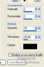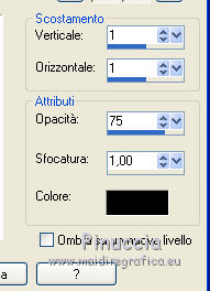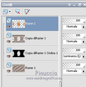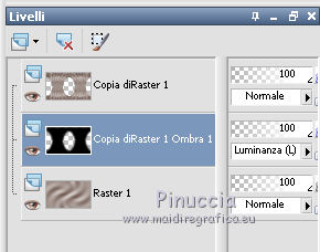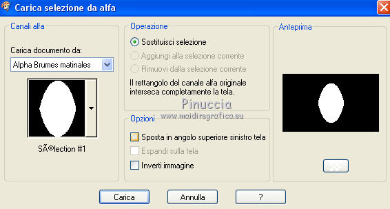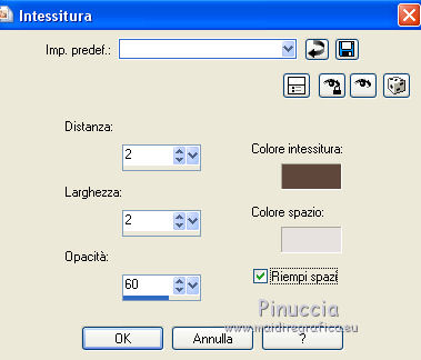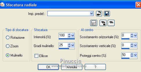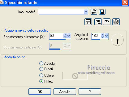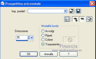 qui puoi trovare qualche risposta ai tuoi dubbi. Se l'argomento che ti interessa non è presente, ti prego di segnalarmelo. Questo tutorial è stato realizzato con Corel 2018 e tradotto con Corel X, ma può essere realizzato anche con le altre versioni di PSP. Dalla versione X4, il comando Immagine>Rifletti è stato sostituito con Immagine>Capovolgi in orizzontale, e il comando Immagine>Capovolgi con Immagine>Capovolgi in verticale. Nelle versioni X5 e X6, le funzioni sono state migliorate rendendo disponibile il menu Oggetti. Con la nuova versione X7, sono tornati Rifletti>Capovolgi, ma con nuove varianti. Vedi la scheda sull'argomento qui traduzione in inglese qui le vostre versioni qui Occorrente: A scelta, tubes a tema autunnale. Il resto del materiale: qui Per la maschera grazie Narah. Per i tubes usati e non forniti grazie: per il paesaggio Benelol, per la donna JVDE Filtri: se hai problemi con i filtri, consulta la mia sezione filtri qui Filters Unlimited 2.0 qui AAA Frames - Foto Frame qui Mehdi - Vibration 1.1 qui &<Bkg Designer sf10I> - Cut Glass Bug Eye (da importare in Unlimited) qui Mura's Seamless - Emboss at Alpha qui Mura's Meister - Perspective Tiling qui Alien Skin Eye Candy 5 Impact - Glass qui Alien Skin Eye Candy 5 Nature - Water Drops qui Alien Skin Eye Candy 5 Textures - Texture Noise qui Nik Software - Color Efex Pro qui I filtri Mura's Seamless si possono usare da soli o importati in Filters Unlimited (come fare vedi qui) Se un filtro fornito appare con questa icona ![]() non esitare a cambiare modalità di miscelatura e opacità secondo i colori utilizzati. Apri la maschera in PSP e minimizzala con il resto del materiale. 1. Scegli due colori dal tuo materiale. Imposta il colore di primo piano con il colore chiaro; per me #e7e2df, e il colore di sfondo con il colore scuro; per me #5f473b. ![]() 2. Apri Alpha_Brumes_matinales. Questa immagine, che sarà la base del tuo lavoro, non è vuota, ma contiene una selezione salvata sul canale alfa. Riempi l'immagine trasparente con il colore chiaro di primo piano.3. Effetti>Plugins>Mehdi - Vibrations 1.1 Questo filtro crea gradienti con i colori della tua paletta; il primo è il colore di sfondo, il secondo quello di primo piano; mantieni gli ultimi due colori creati dal filtro. ![]() 4. Regola>Sfocatura>Sfocatura gaussiana - raggio 20. ![]() 5. Regola>Sfocatura>Sfocatura radiale. ![]() 6. Livelli>Duplica. Effetti>Plugins>Filters Unlimited 2.0 - &<Bkg Designer sf10I> - Cuto glass Bug Eye ![]() 7. Effetti>Effetti geometrici>Prospettiva orizzontale. ![]() Immagine>Rifletti. Ripeti l'Effetto Prospettiva orizzontale con gli stessi settaggi. 8. Effetti>Effetti di distorsione>Coordinate polari. ![]() 9. Effetti>Effetti di immagine>Scostamento. ![]() 10. Livelli>Duplica. Immagine>Capovolgi. Livelli>Unisci>Unisci giù. Effetti>Effetti 3D>Sfalsa ombra, colore nero, ombra su nuovo livello selezionato. ![]() Cambia la modalità di miscelatura del livello dell'ombra in Luminanza (esistente) - o secondo i tuoi colori. ![]() 11. Attiva il livello superiore. Selezione>Carica/Salva selezione>Carica selezione da canale alfa. La selezione sélection#1 è subito disponibile. Devi soltanto cliccare Carica. ![]() 12. Apri il tuo paesaggio e vai a Modifica>Copia. Torna al tuo lavoro e vai a Modifica>Incolla come nuovo livello. Posiziona sulla selezione la parte del tube che vuoi lasciare visibile.Selezione>Inverti. Premi sulla tastiera il tasto CANC ![]() Di nuovo Selezione>Inverti. Effetti>Plugins>Nik Software - Color Efex Fog - a destra Method 1, intensity 22 ![]() 13. Effetti>Plugins>Alien Skin Eye Candy 5 Nature - Water Drops seleziona il preset Small Dew e ok. ![]() Regola>Messa a fuoco>Metti a fuoco. 14. Effetti>Plugins>Alien Skin Eye Candy 5 Impact - Glass. Seleziona il preset Clear e ok. ![]() Selezione>Deseleziona. 15. Effetti>Effetti di riflesso>Specchio rotante. ![]() Livelli>Duplica. Immagine>Rifletti. Livelli>Unisci>Unisci giù. I tuoi livelli: ![]() 16. Attiva il livello Raster 1. Immagine>Ridimensiona, all'80%, tutti i livelli non selezionato. Effetti>Plugins>Mura's Meister - Perspective Tiling. ![]() Livelli>Disponi>Porta in alto. 17. Attiva lo strumento Bacchetta magica , sfumatura 50,![]() e clicca nella parte trasparente in alto per selezionarla. Premi 4-5 volte CANC sulla tastiera per sfumare il bordo. Selezione>Deseleziona. 18. Livelli>Nuovo livello raster. Riempi con il colore chiaro.19. Livelli>Nuovo livello maschera>Da immagine. Apri il menu sotto la finestra di origine e vedrai la lista dei files aperti. Selezione la maschera Narah_mask_0400. ![]() Effetti>Effetti di bordo>Aumenta. Livelli>Unisci>Unisci gruppo. Immagine>Ridimensiona, al 70%, tutti i livelli non selezionato. Attiva lo strumento Puntatore ![]() e imposta Posizione X: -110,00 e Posizione Y: -5,00. ![]() 20. Effetti>Plugins>Mura's Seamless - Emboss at Alpha, con i settaggi standard. ![]() 21. Effetti>Effetti 3D>Sfalsa ombra, colore nero non dimenticare di deselezionare ombra su nuovo livello. ![]() Livelli>Duplica. Immagine>Rifletti. Immagine>Capovolgi. Attiva lo strumento Puntatore ![]() e imposta Posizione X: 408,00 e Posizione Y: 110,00. ![]() 22. Immagine>Aggiungi bordatura, 1 pixel, simmetriche, colore scuro. Immagine>Aggiung bordatura, 3 pixels, simmetriche, colore chiaro. Immagine>Aggiungi bordatura, 1 pixel, simmetriche, colore scuro. Immagine>Aggiungi bordatura, 20 pixels, simmetriche, colore bianco. Seleziona questo bordo con la bacchetta magica , sfumatura e tolleranza 0,Effetti>Effetti di trama>Intessitura colore intessitura: colore di sfondo colore spazio: colore di primo piano. ![]() Selezione>Inverti. Effetti>Effetti 3D>Sfalsa ombra, colore nero. ![]() Ripeti l'Effetto Sfalsa ombra, verticale e orizzontale -2. Selezione>Deseleziona. 23. Immagine>Aggiungi bordatura, 1 pixel, simmetriche, colore scuro. Immagine>Aggiungi bordatura, 3 pixels, simmetriche, colore chiaro. Immagine>Aggiungi bordatura, 1 pixel, simmetriche, colore scuro. Immagine>A