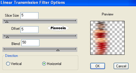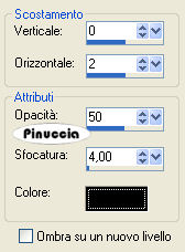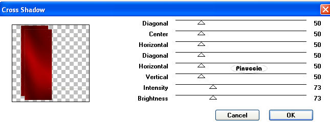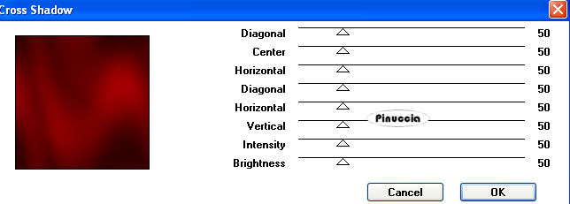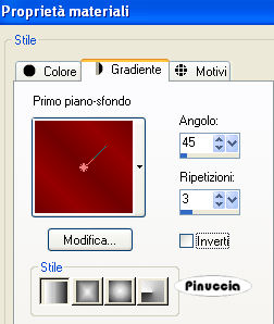 qui puoi trovare qualche risposta ai tuoi dubbi. Se l'argomento che ti interessa non è presente, ti prego di segnalarmelo. Questo tutorial è stato scritto con PSP 9, ma può essere eseguito anche con le altre versioni di PSP. Per tradurlo, ho usato PSP X. Occorrente: Materiale qui Metti le forme L&Kframe2.jsl nella cartella Forme Predefinite. Metti il motivo "Goudpatroon" nella cartella Motivi. Apri i font BickhamScriptFancy2 e Edwardian Script ITC e minimizzali nella tua area di lavoro. Li troverai nella lista dei font disponibili quando ti serviranno. Filtri: FM Tile Tools qui Graphics Plus qui DSB Flux qui 1. Apri una nuova immagine trasparente 450 x 450 pixels. Imposta il colore di primo piano con #710100, e il colore di sfondo con #950002. Passa il colore di primo piano a Gradiente di primo piano/sfondo, stile lineare: ![]() Riempi l'immagine trasparente con il gradiente.Effetti>Plugins>Graphics Plus - Cross Shadow: ![]() 2. Apri il tube T 1915 e vai a Modifica>Copia. Torna al tuo lavoro e vai a Modifica>Incolla come nuovo livello. Spostalo a sinistra, ad almeno 20 pixels dal bordo.Livelli>Duplica, e attiva il livello sottostante (l'originale del tube). Effetti>Effetti di distorsione>Vento - da sinistra, intensità 100. ![]() Effetti>Plugins>DSB Flux - Linear Transmission: ![]() Effetti>Plugins>FM Tile Tools - Blend Emboss, con i settaggi standard. ![]() Abbassa l'oopacità di questo livello al 50%. 3. Attiva il livello inferiore. Apri il tube Gerdaroos9 e vai a Modifica>Copia. Torna al tuo lavoro e vai a Modifica>Incolla come nuovo livello. Chiudi il livello superiore (la copia del tube della donna) e posizionati su uno degli altri livelli. Livelli>Unisci>Unisci visibile. 4. Rimani posizionato sul livello inferiore. Inverti i colori nella paletta dei materiali, in modo che il gradiente passi a colore di sfondo. Passa il colore di primo piano a Motivi e seleziona il motivo oro Goudpatroon: ![]() Attiva lo strumento Forme predefinite ![]() seleziona la forma L&KFrame2.jsl con i seguenti settaggi: ![]() Tenendo premuto il tasto sinistro del mouse, parti dall'angolo in alto a destra: ![]() fino all'angolo in basso a sinistra: ![]() ![]() Livelli>Converti in livello raster. Effetti>Plugins>Graphics Plus - Cross Shadow: ![]() Effetti>Effetti 3D>Sfalsa ombra: ![]() Attiva il livello del tube e spostalo un po' più a destra.![]() 5. Chiudi il colore di primo piano e imposta il colore di sfondo con il motivo oro. Attiva lo strumento Testo ![]() seleziona il font Edwardian Script ITC, dimensione 36, se stai usando PSP X dovrai regolare la dimensione perchè i pixels nelle due versioni non corrispondono e scrivi un testo sulla riga in alto. Livelli>Converti in livello raster. Effetti>Effetti 3D>Sfalsa ombra: ![]() Seleziona il font BickhamScriptFancy2, dimensione 72, e scrivi la lettera V sulla riga in basso. Livelli>Converti in livello raster. Effetti>Effetti 3D>Sfalsa ombra, con i settaggi precedenti. Seleziona nuovamente il font Edwardian Script ITC, regola la dimensione e scrivi il resto della parola Valentine, seguita da alcuni punti. Livelli>Converti in livello raster. Effetti>Effetti 3D>Sfalsa ombra, con i settaggi precedenti. Se la lettera "V" copre il fianco del tube della donna, attiva il livello del tube e porta il livello sopra il livello dei testi. Aggiungi il tuo nome e/o il tuo watermark. Immagine>Aggiungi bordatura, 2 pixels, simmetriche, con il colore nero. Seleziona questo bordo con la bacchetta magica ![]() e riempilo con il motivo oro.Hai finito. Puoi salvare in formato jpg. Se hai problemi o dubbi, o trovi un link non funzionante, o anche soltanto per un saluto, scrivimi 29 Gennaio 2009 |