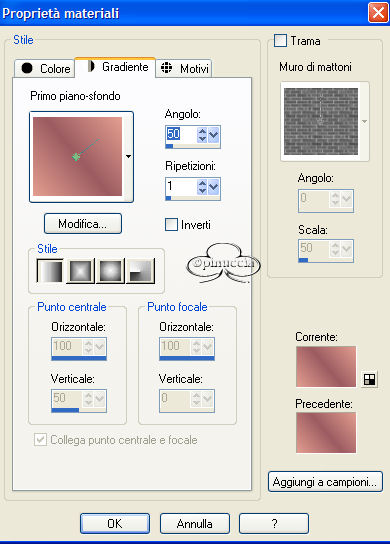 Con questi colori crea un gradiente di primo piano/sfondo, angolo 50, ripetizioni 1: