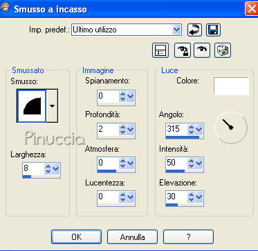 Effetti>Effetti 3D>Smusso a incasso, con i seguenti settaggi: