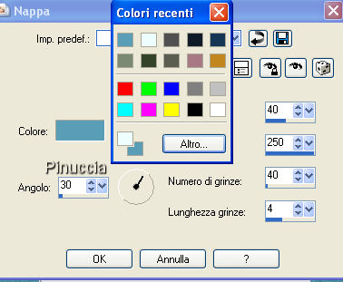 qui puoi trovare qualche risposta ai tuoi dubbi. Se l'argomento che ti interessa non è presente, ti prego di segnalarmelo. Questo tutorial è stato scritto in PSP 9, ma può essere eseguito con qualsiasi versione del programma. Occorrente: Materiale qui Filtro Xero qui Apri l'immagine che hai trovato nello zip. Scegli dall'immagine un colore chiaro e un colore scuro. Io ho scelto il colore chiaro #4d8ba4 come colore di primo pian e il colore scuro #c1f8fb come colore di sfondo. Crea un gradiente di primo piano/sfondo, con i seguenti settaggi. ![]() Immagine>Aggiungi bordatura, 1 pixel, simmetriche, con il colore scuro. come aggiungere bordi con i colori impostati nella paletta dei materiali, vedi qui Immagine>Aggiungi bordatura, 1 pixel, simmetriche, con il colore chiaro. Immagine>Aggiungi bordatura, 1 pixel, simmetriche, con il colore scuro. Immagine>Aggiungi bordatura, 10 pixels, simmetriche, con il colore chiaro. Seleziona il bordo con la bacchetta magica ![]() ![]() Riempi la selezione con il gradiente.Selezione>inverti. Effetti>Effetti 3D>Sfalsa ombra, con i seguenti settaggi, colore nero: ![]() Ripeti l'Effetto Sfalsa ombra, ma cambiando verticale e orizzontale a -1. ![]() Selezione>Nessuna selezione. Immagine>Aggiungi bordatura, 1 pixel, simmetriche, con il colore scuro. Immagine>Aggiungi bordatura, 1 pixel, simmetriche, con il colore chiaro. Immagine>Aggiungi bordatura, 1 pixel, simmetriche, con il colore scuro. Immagine>Aggiungi bordatura, 15 pixels, simmetriche, con il colore chiaro. Seleziona il bordo con la bacchetta magica ![]() Effetti>Effetti di immagine>Scostamento: ![]() Selezione>Nessuna selezione. Seleziona il bordo chiaro con la bacchetta magica ![]() ![]() Effetti>Effetti di trama>Nappa, con i seguenti settaggi e con il colore scuro. Per selezionare il colore scuro clicca con il tasto destro del mouse sulla finestra del colore, ti apparirà la paletta dei colori usati di recente. In basso a sinistra, vedrai la paletta dei tuoi materiali, clicca sul colore scuro e sarà automaticamente selezionato. ![]() Selezione>Nessuna selezione. Immagine>Aggiungi bordatura, 1 pixel, simmetriche, con il colore scuro. Immagine>Aggiungi bordatura, 1 pixel, simmetriche, con il colore chiaro. Immagine>Aggiungi bordatura, 1 pixel, simmetriche, con il colore scuro. Immagine>Aggiungi bordatura, 20 pixels, simmetriche, con il colore chiaro. Seleziona il bordo con la bacchetta magica ,e riempilo con il gradiente.Regola>Aggiungi/rimuovi disturbo>Aggiungi disturbo, con i seguenti settaggi: ![]() Immagine>Aggiungi bordatura, 1 pixel, simmetriche, con il colore scuro. Immagine>Aggiungi bordatura, 1 pixel, simmetriche, con il colore chiaro. Immagine>Aggiungi bordatura, 1 pixel, simmetriche, con il colore scuro. Effetti>Plugins>Xero - Porcelain, con i settaggi standard. ![]() Aggiungi il tuo nome o il tuo watermark e salva in formato jpg. ![]() ![]() Se hai problemi o dubbi, o trovi un link non funzionante, o anche soltanto per un saluto, scrivimi 16 Ottobre 2007 |