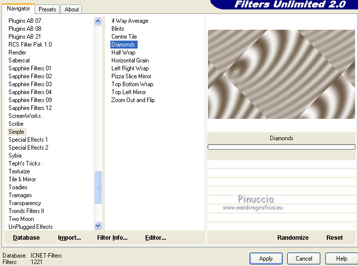 4. Effets>Modules Externes>Filters Unlimited 2.0 - Simple - Diamonds.