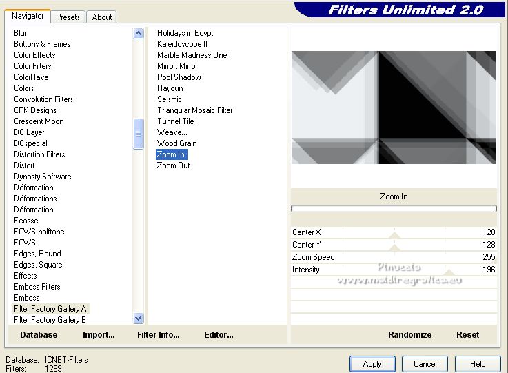 Effets>Modules Externes>Filters Unlimited 2.0 - Filter Factory Gallery A - Zoom in, par défaut.