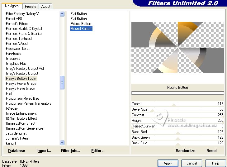 Effets>Modules Externes>Filters Unlimited 2.0 - Harry's Button Tools - Round Button, par défaut.